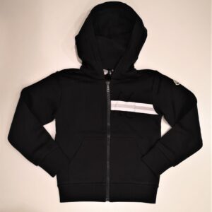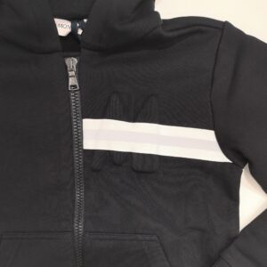 Felpa nera con cappuccio e apertura con zip davanti. M di Moncler in rilievo lateralmente con sopra fasce catarifrangenti. Logo