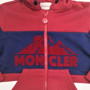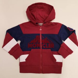 Felpa rossa con cappuccio e apertura con zip davanti. Fascia centrale in contrasto blu con disegno montagna e scritta Moncler