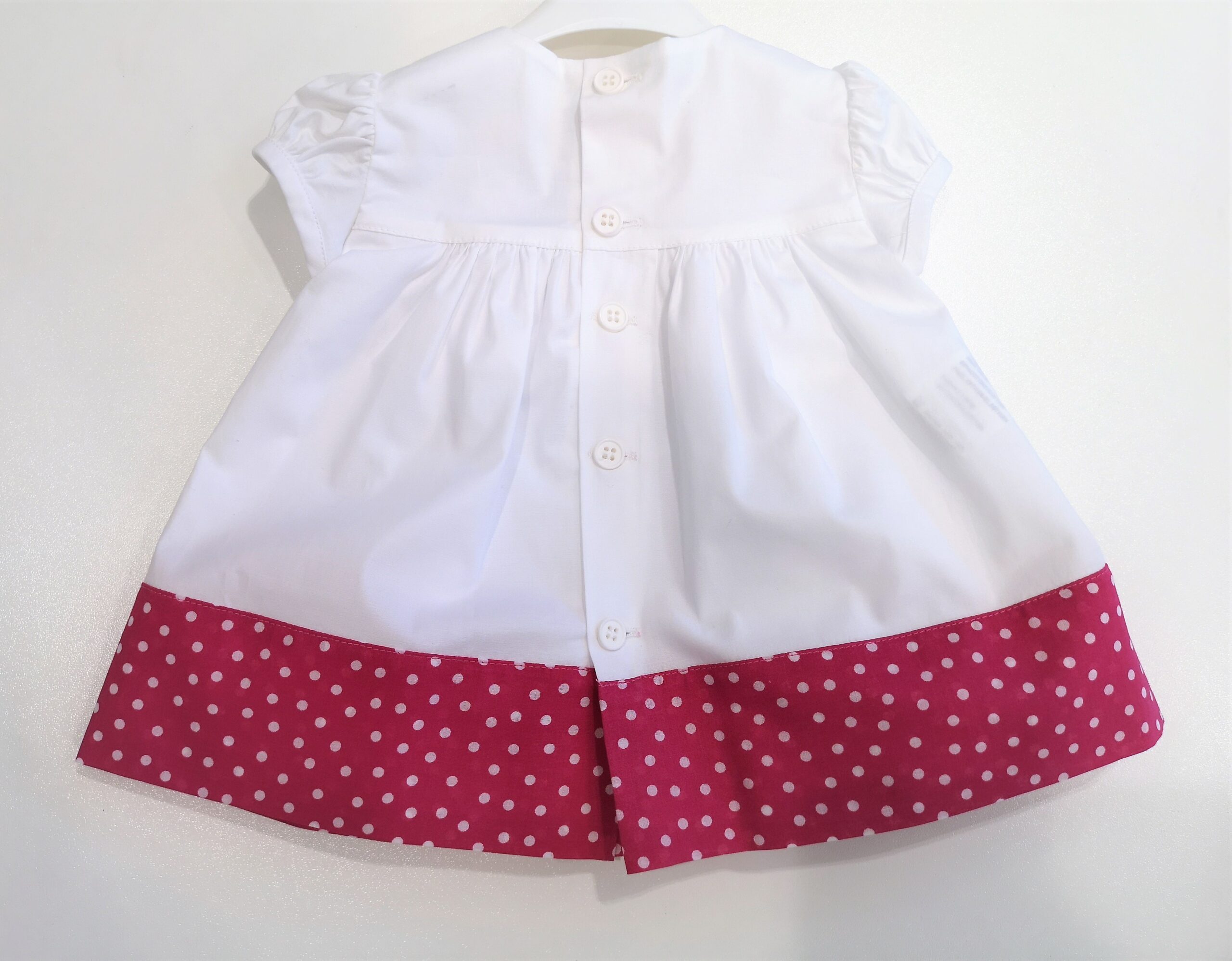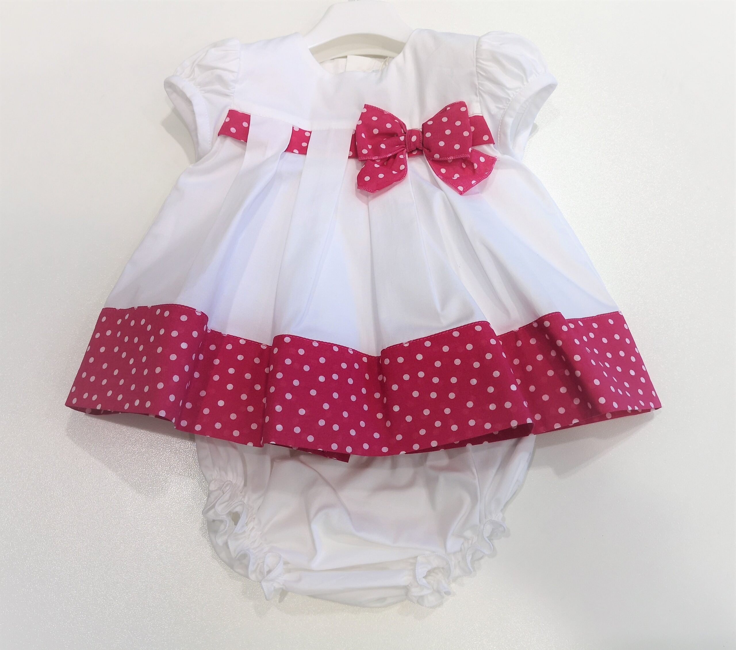 Abito manica corta con fascia inferiore pois fuxia. Fiocco pois fuxia. Con coulotte nello stesso tessuto. Abbottonatura dietro.