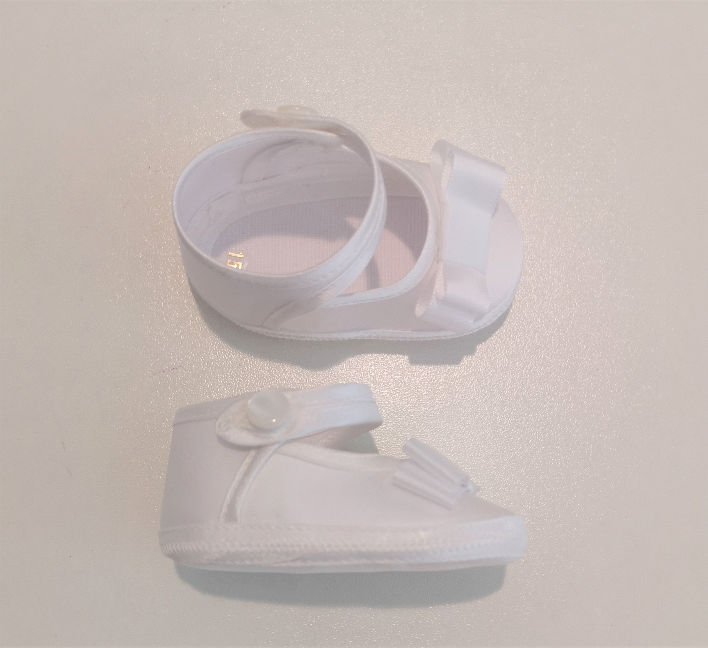 Scarpette modello ballerine in tessuto bianco con fiocco davanti. Bordo in raso. Chiusura con bottoncino laterale