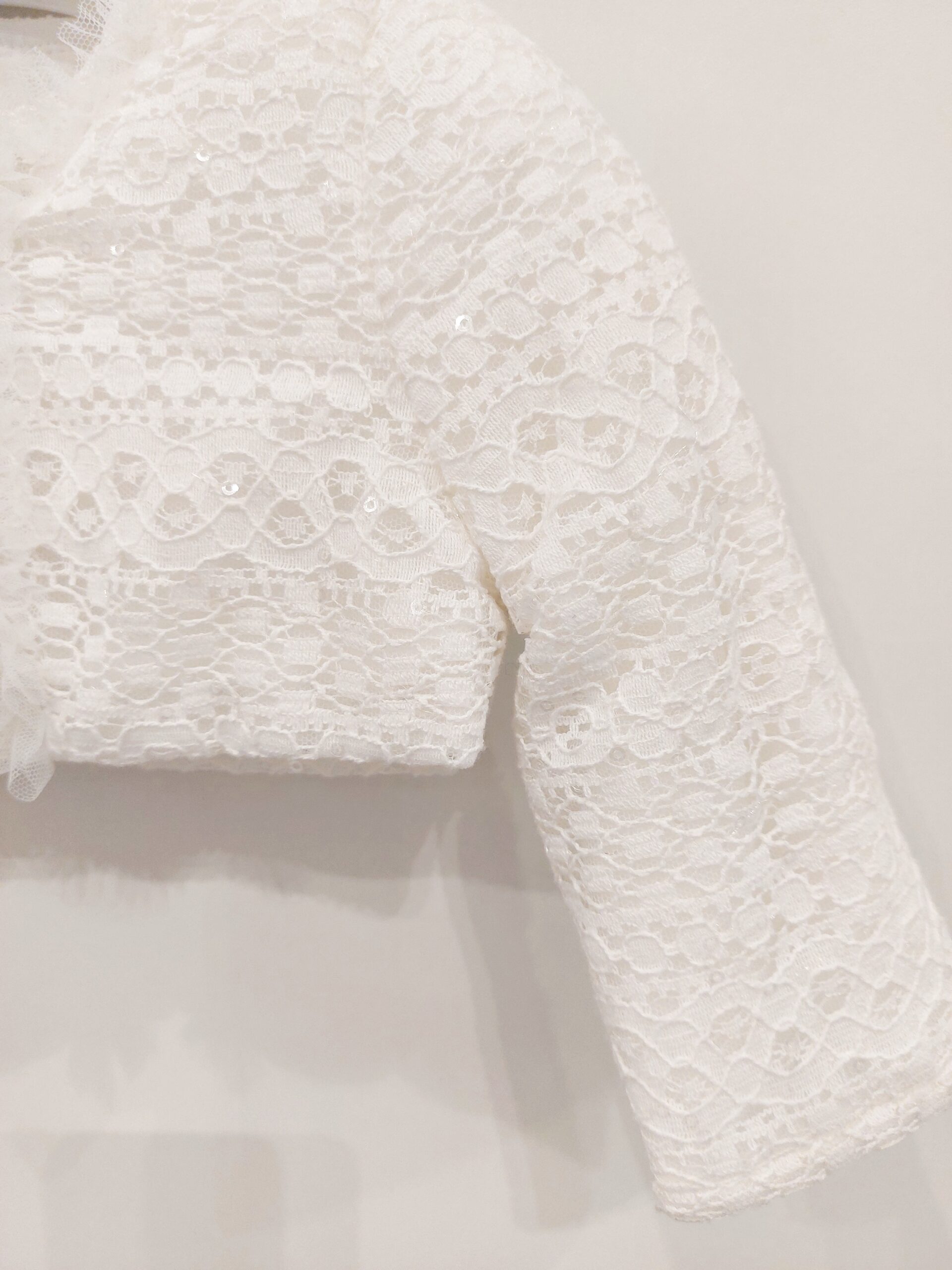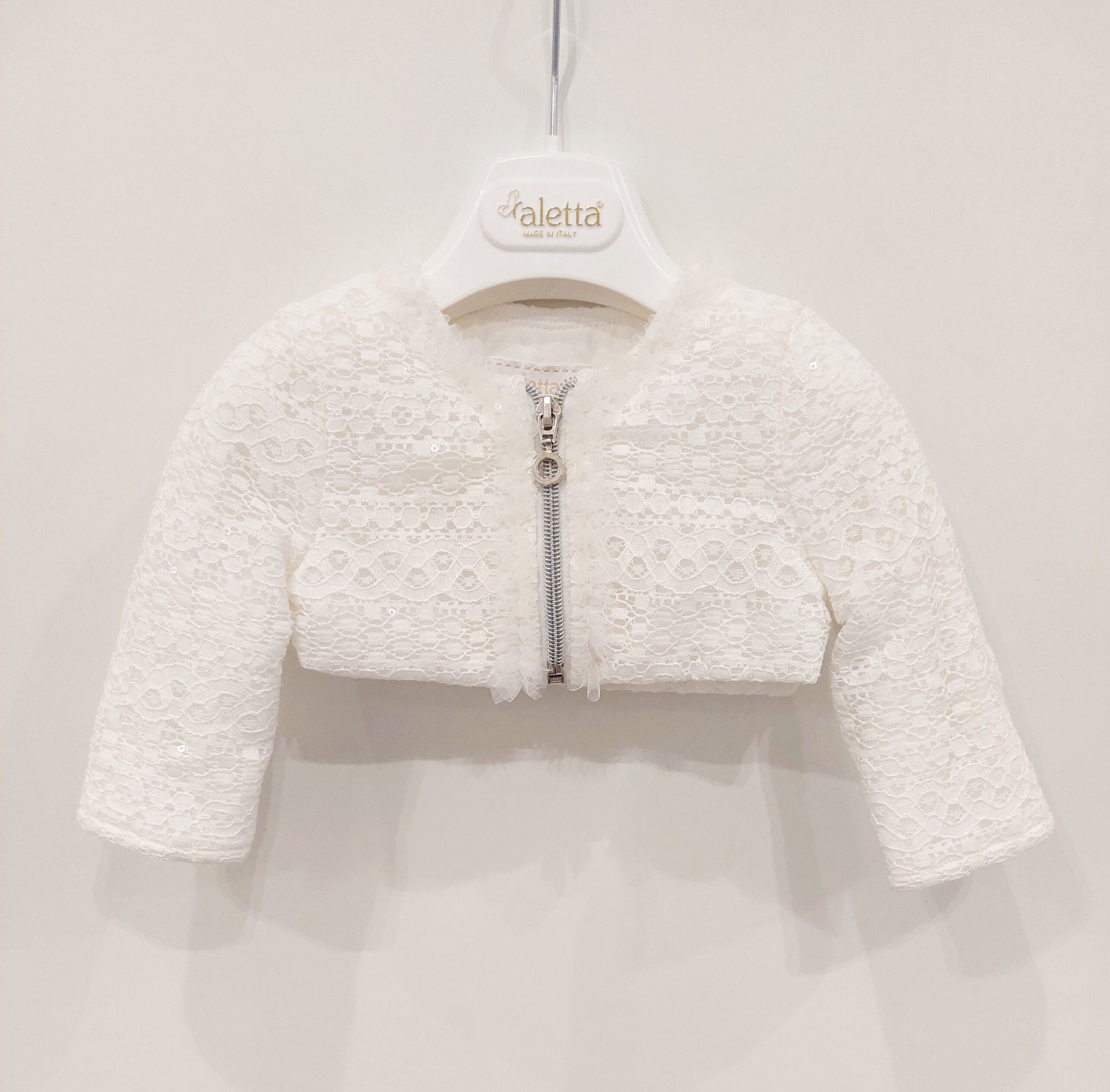 Giubbino leggero bianco modello bolerino elegante in tessuto lavorato e piccola ruche in tulle. Paillettes trasparenti sparse. Apertura con zip.
