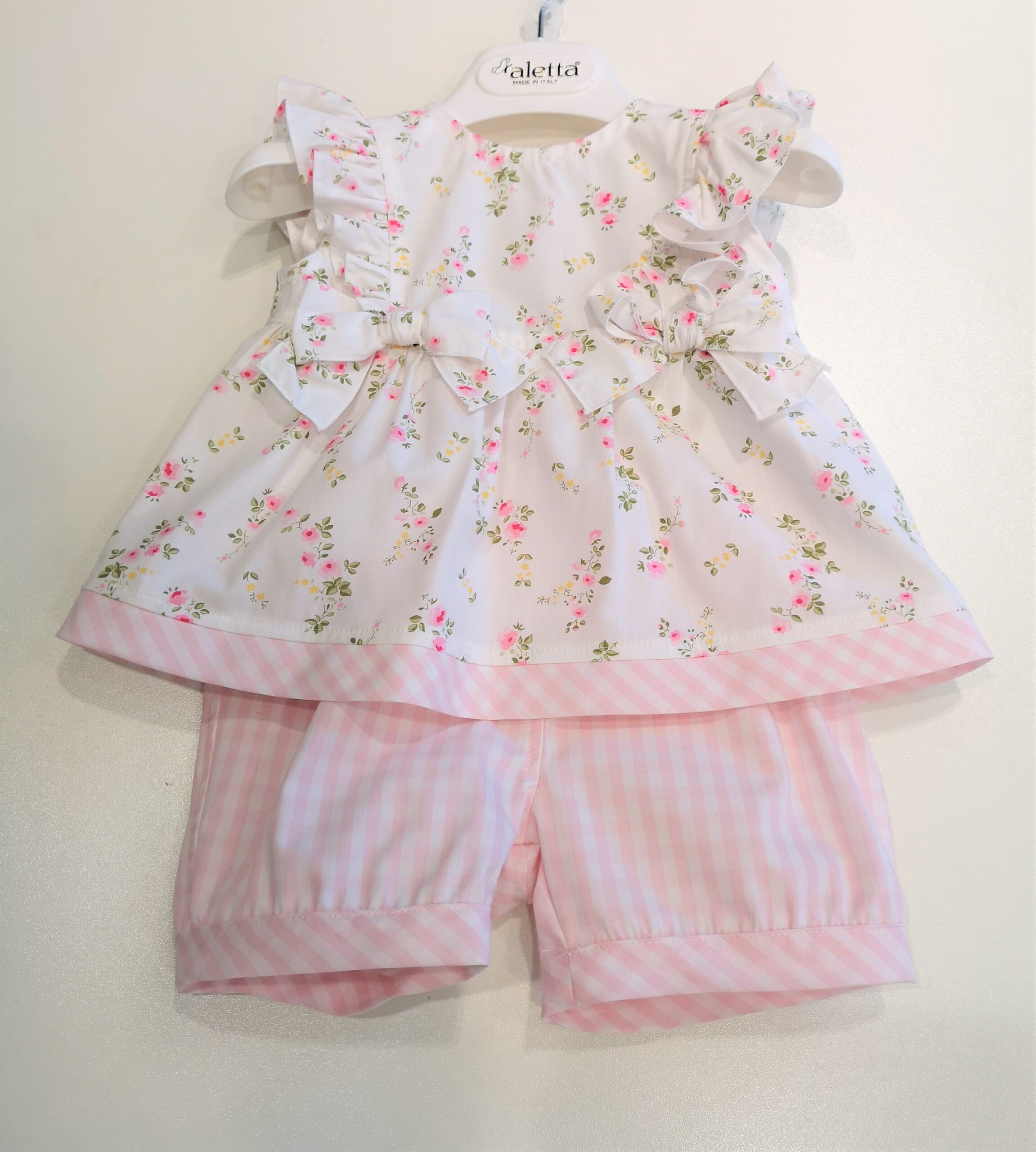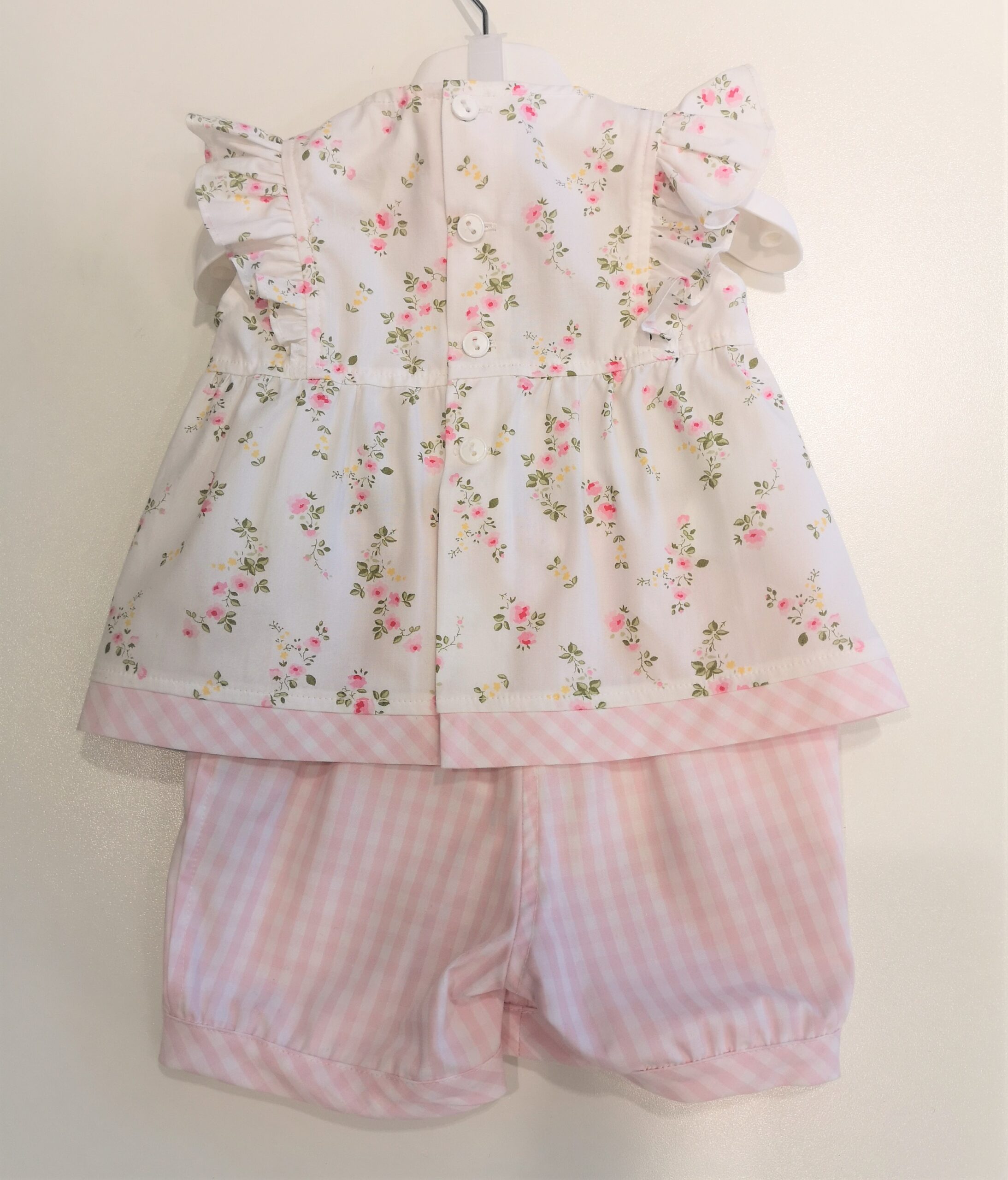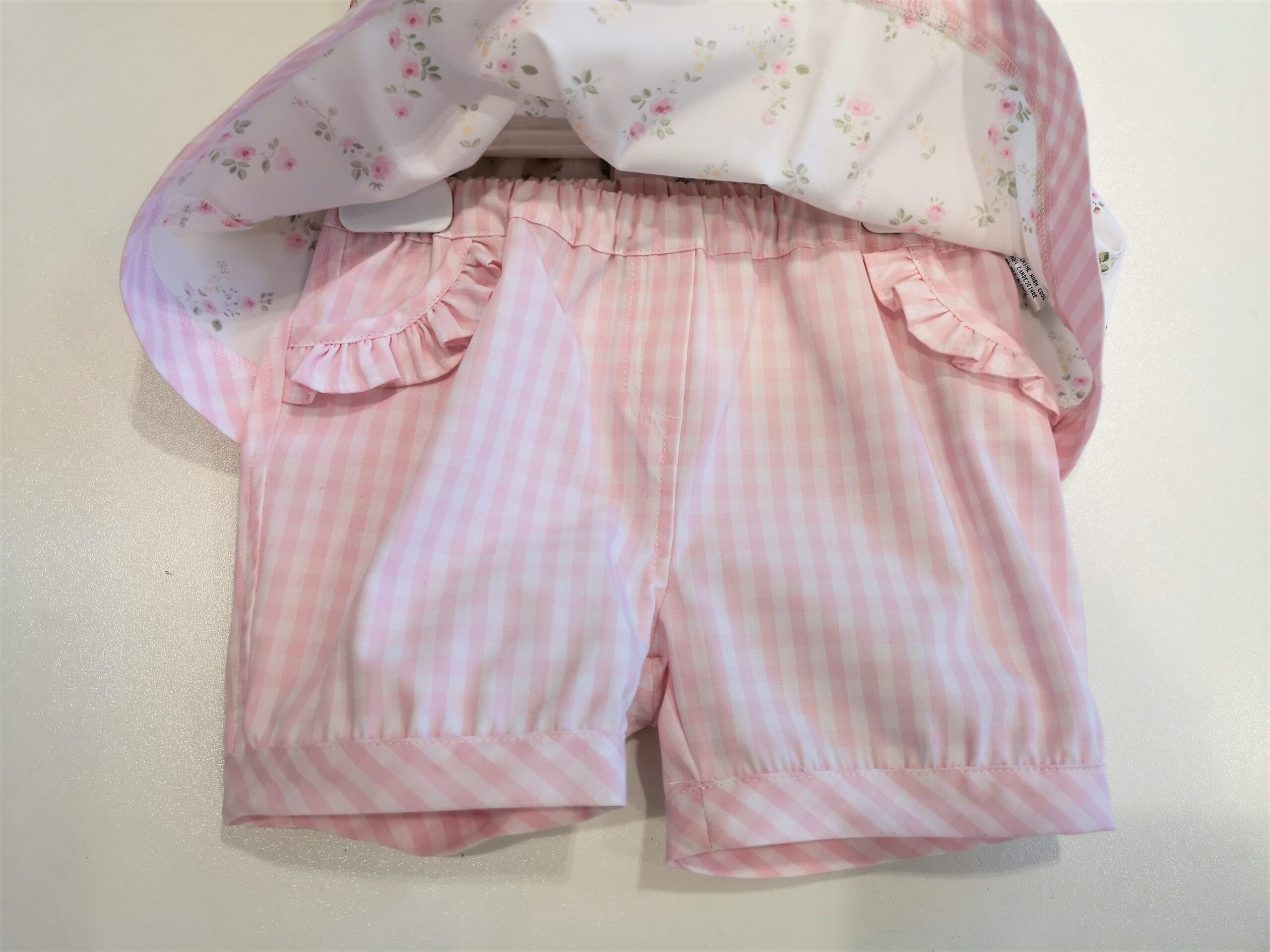 Abito dallo stile provenzale, realizzato in cotone fantasia floreale il sopra e a quadretti vichy rosa gli shorts. Top con bottoncini bianchi dietro.