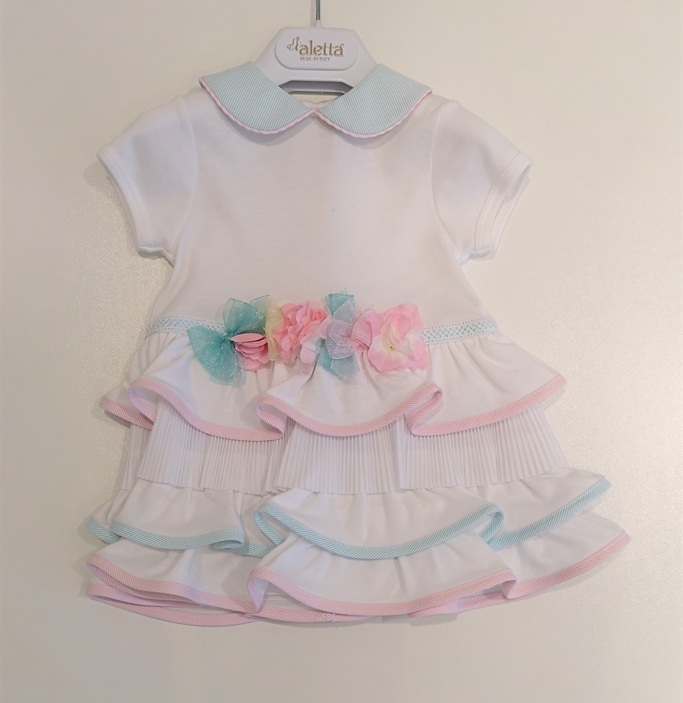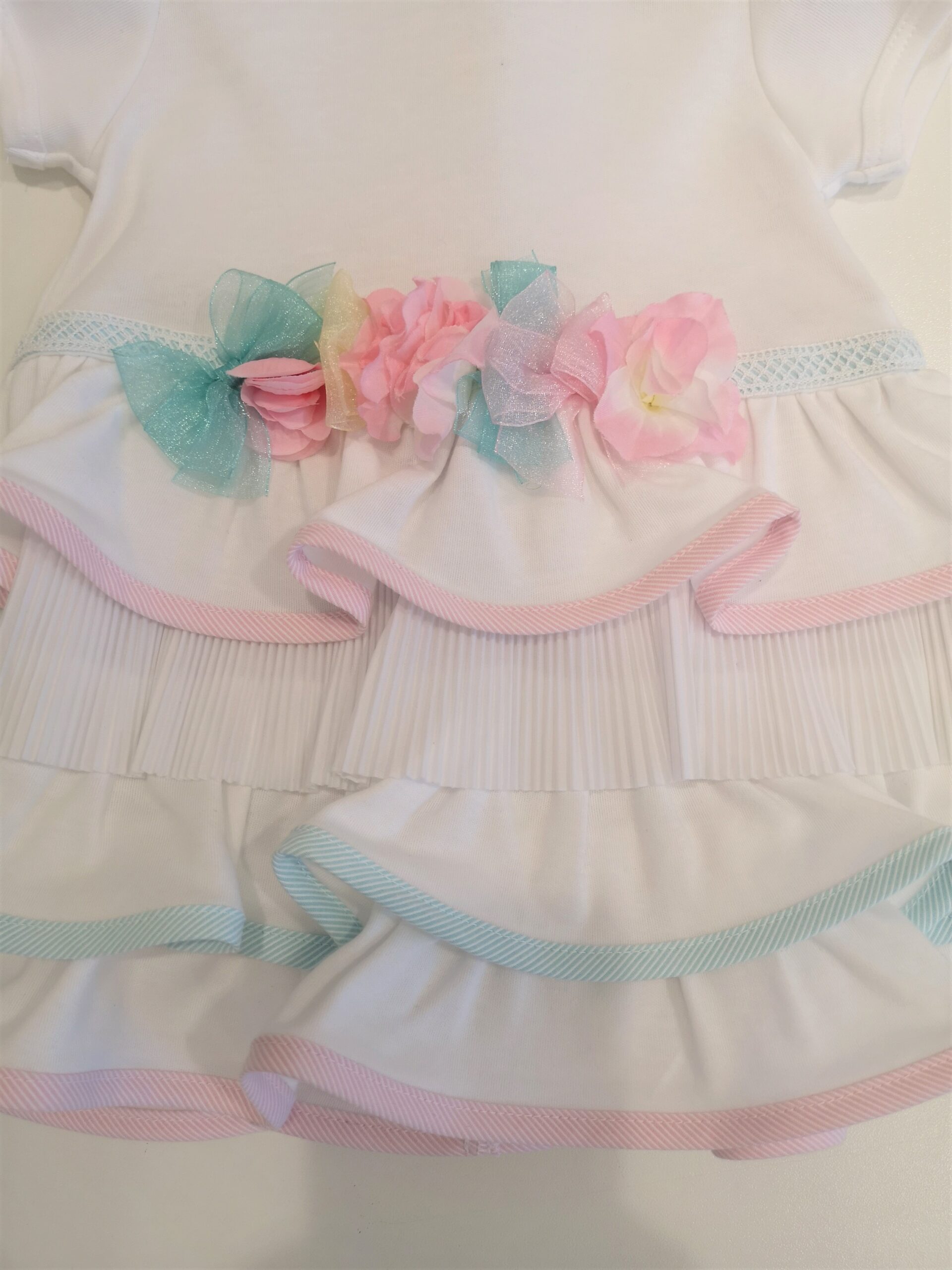 Abito manica corta con balze bordate in tessuto colori pastello rosa e verde acqua e applicazione di fiori negli stessi colori. Colletto in tessuto. Abbottonatura dietro.