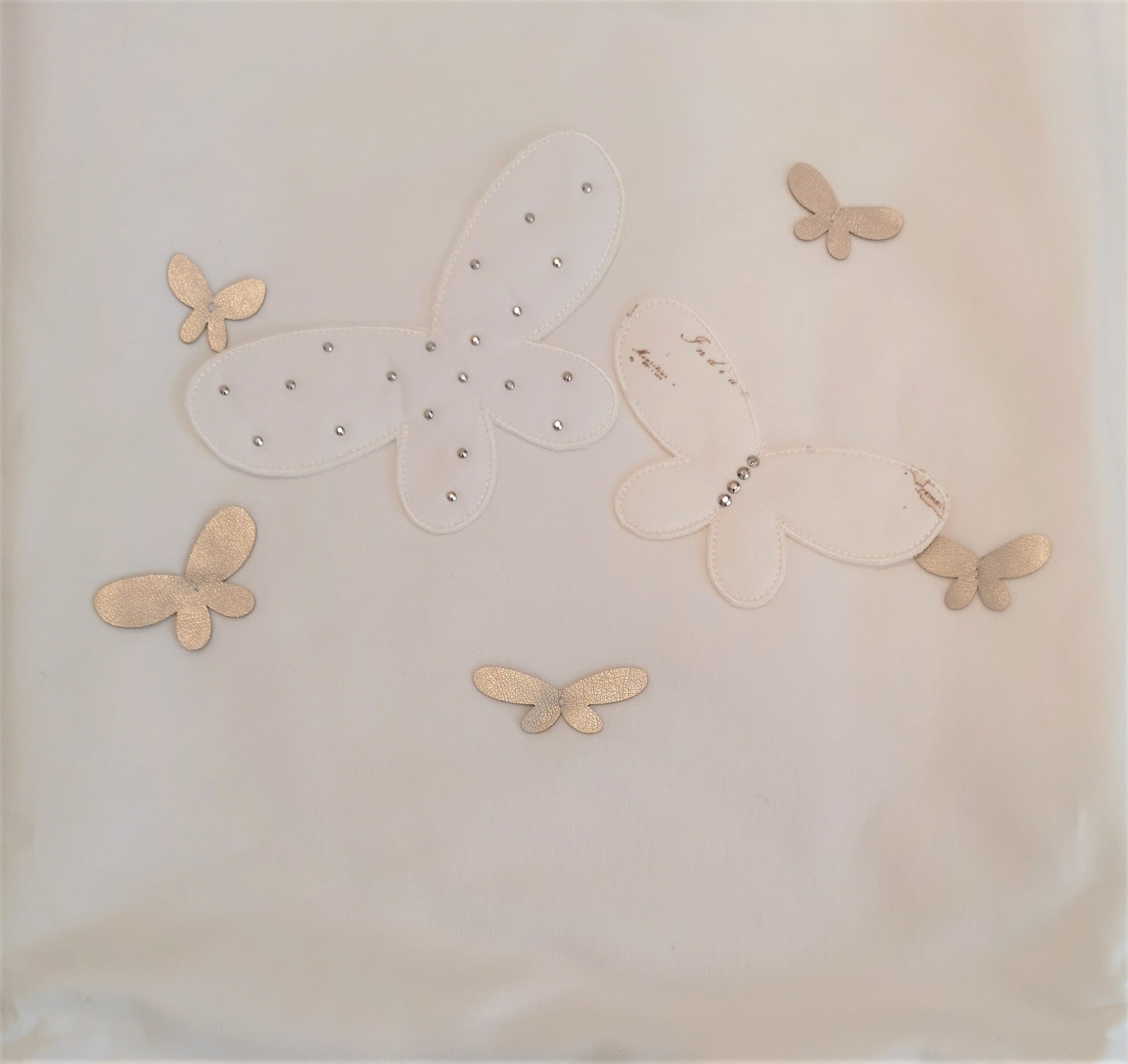 Copertina imbottita con applicazione centrale di farfalle. Bordo in tessuto a fantasia istituzionale beige.
