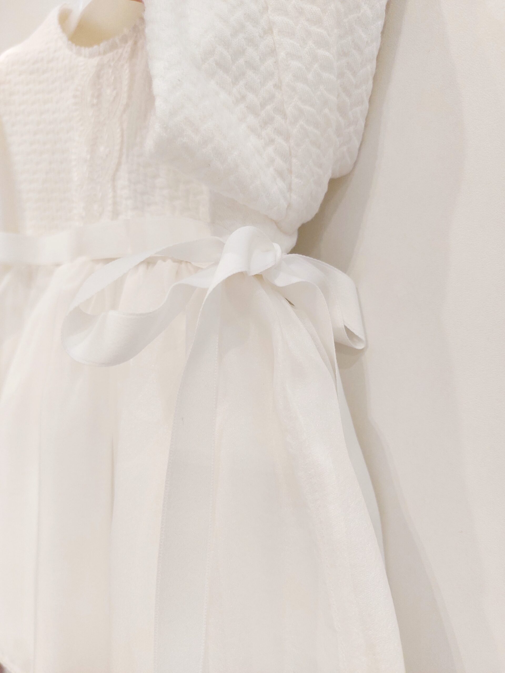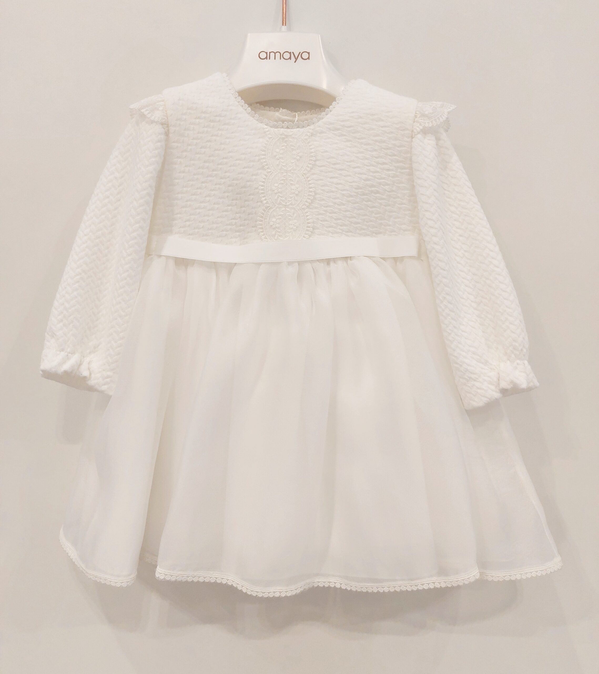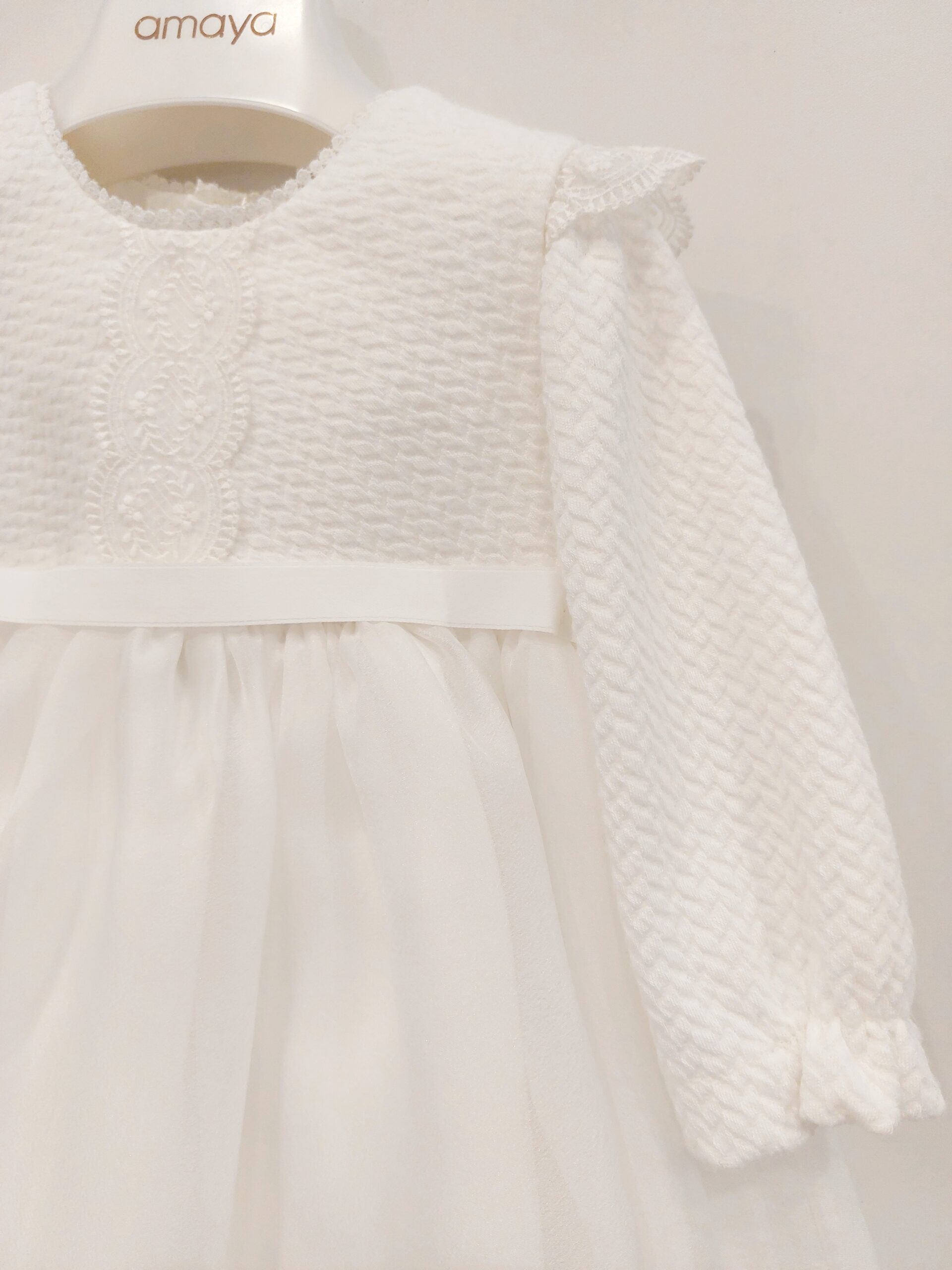 Abito manica lunga in tessuto bianco lavorato nel corpetto e in tessuto leggero nella gonna. Corpetto con applicazione ricamata