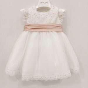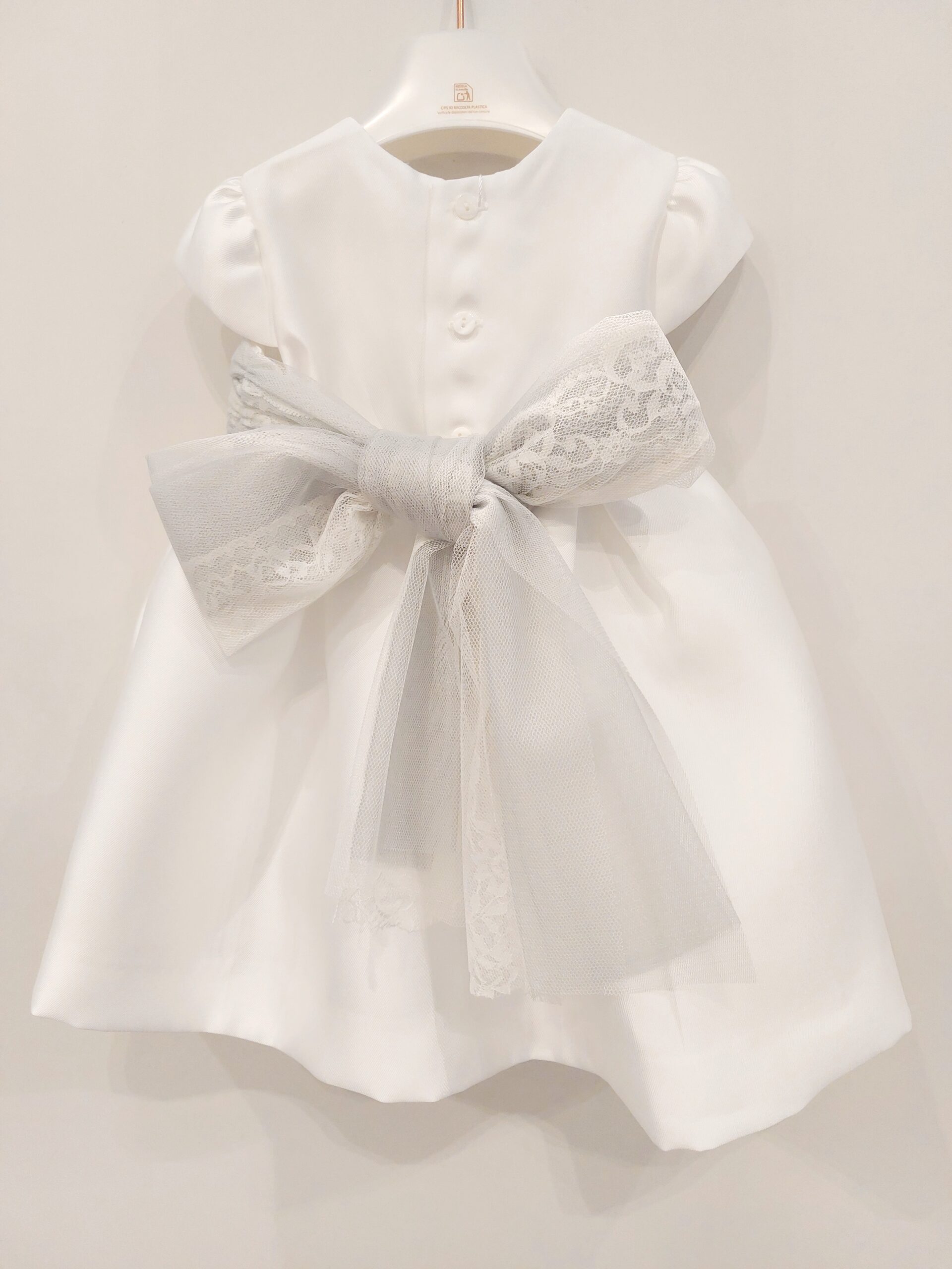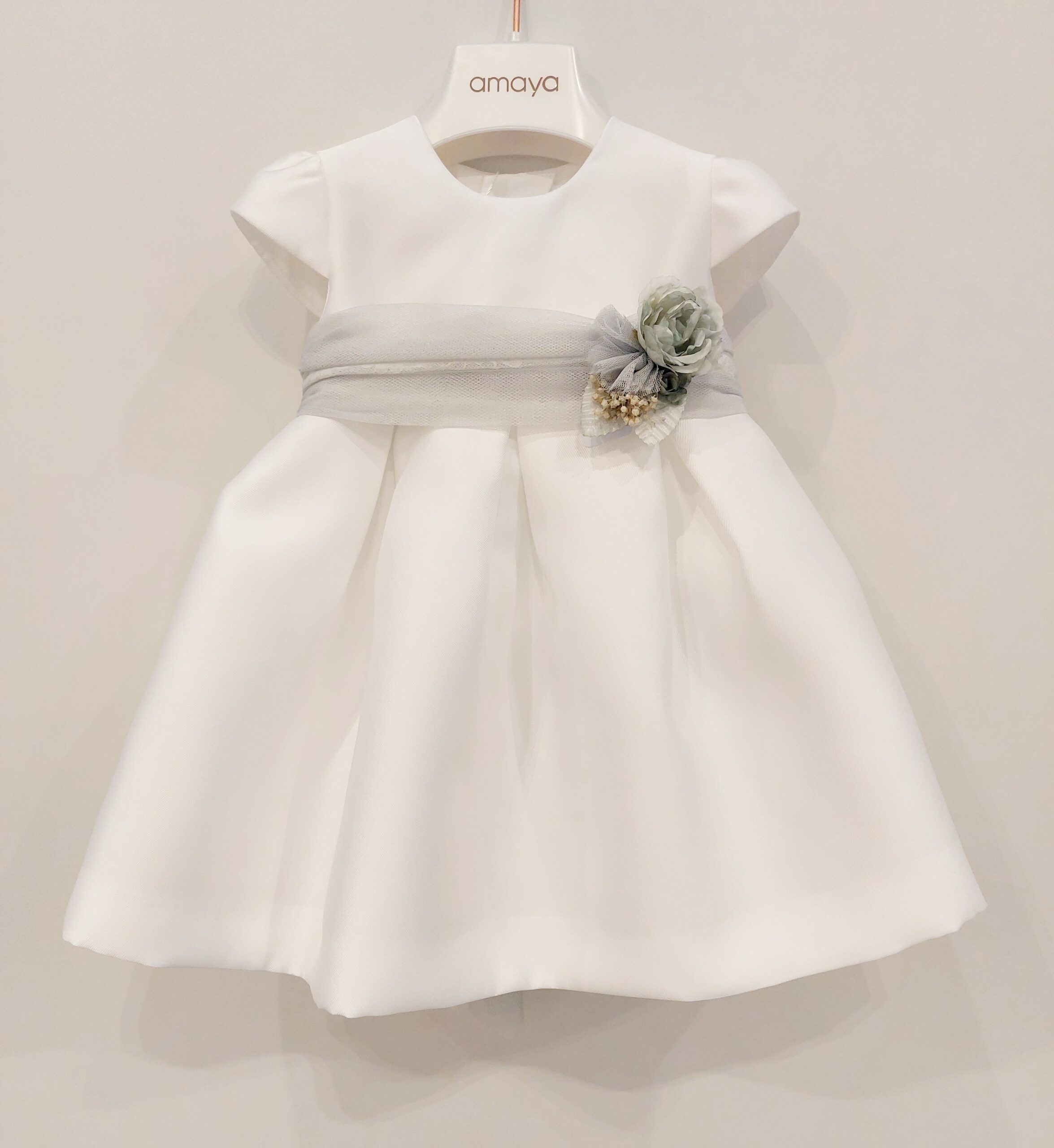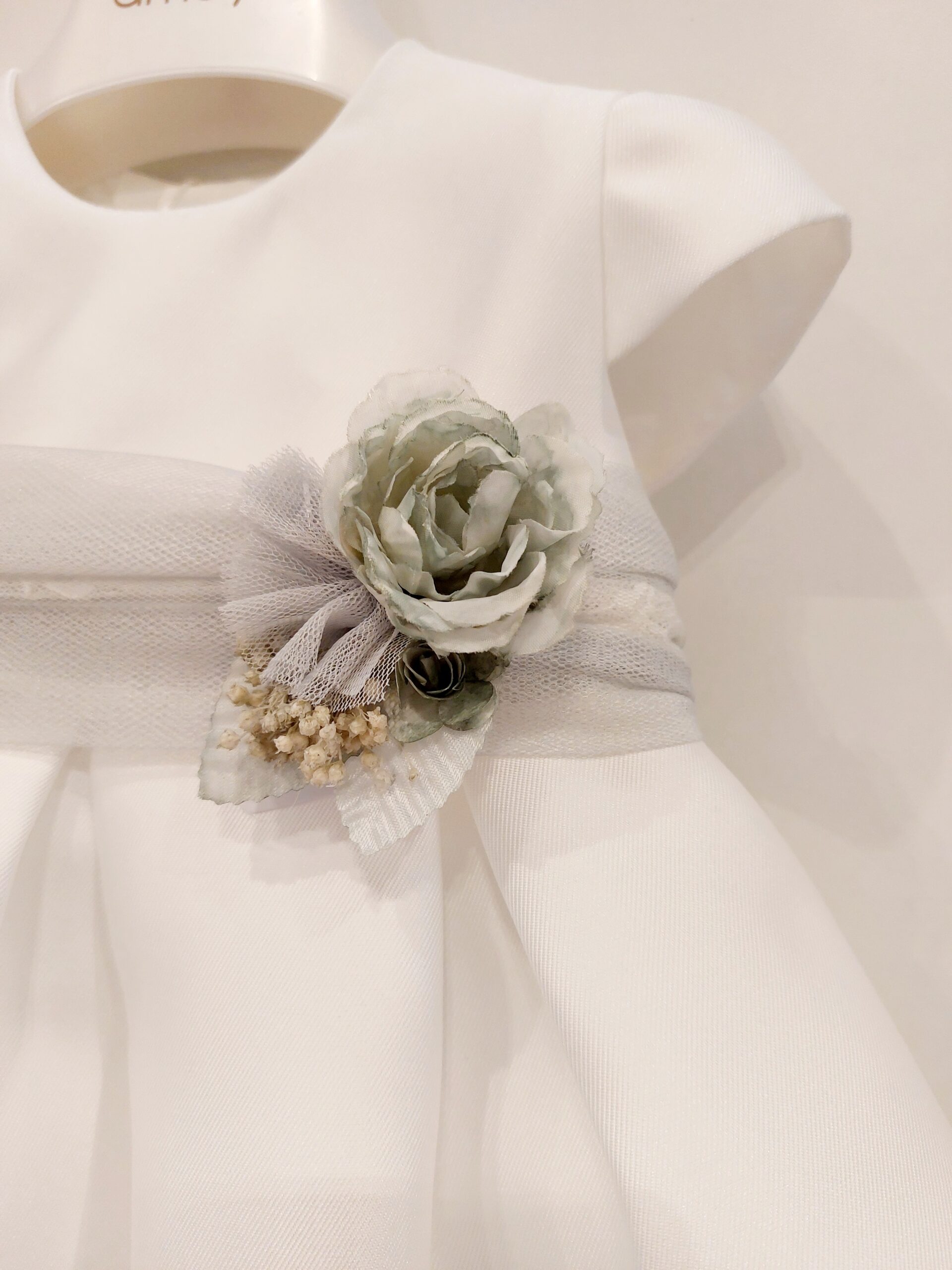 Abito manica corta in tessuto bianco con cintura in tulle verde acqua con all’interno tulle bianco ricamato. Spilla con fiore abbinato.