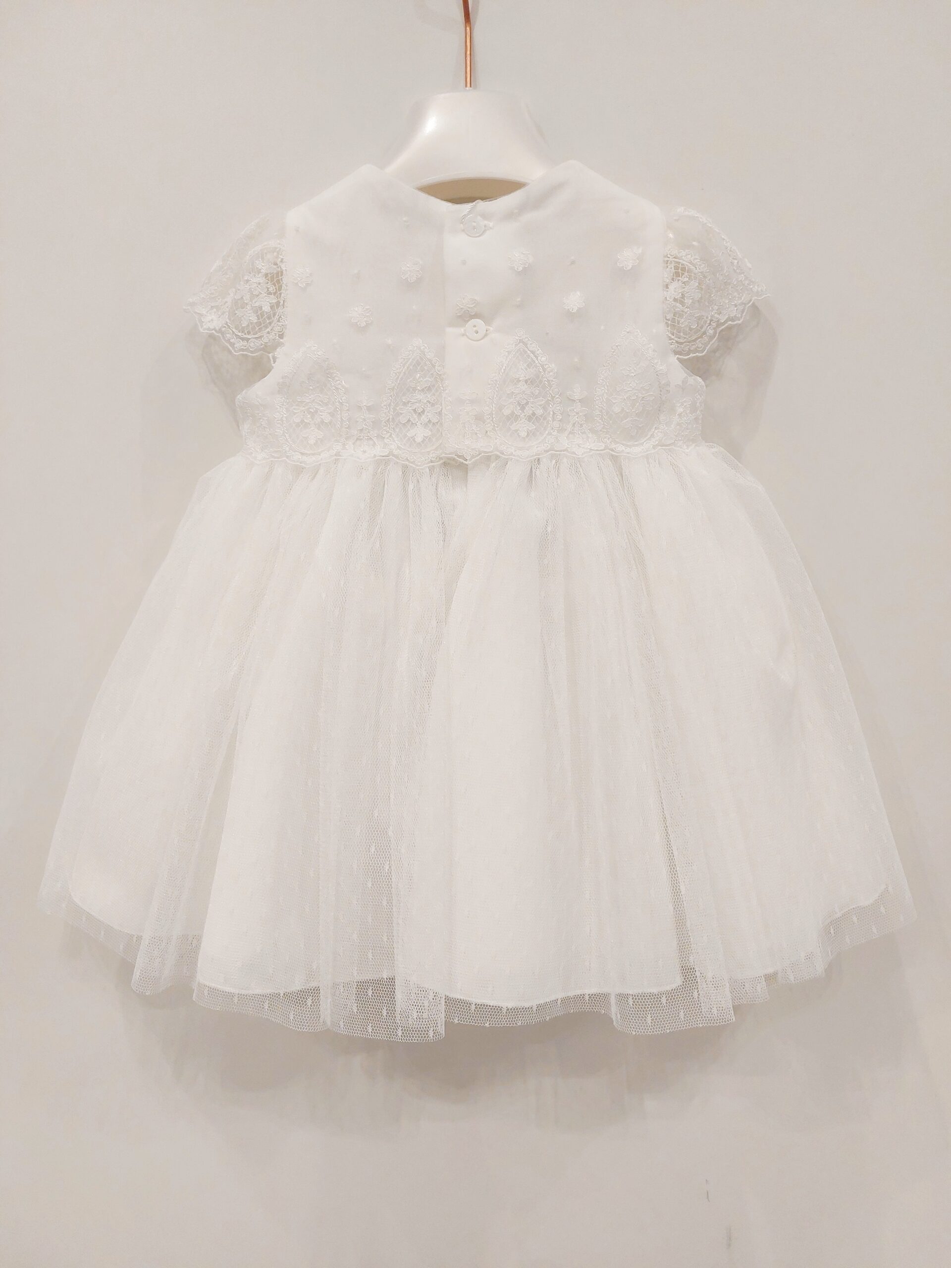 Abito in tulle bianco a piccoli pois tono su tono. Corpetto ricamato con fiocchini di raso.