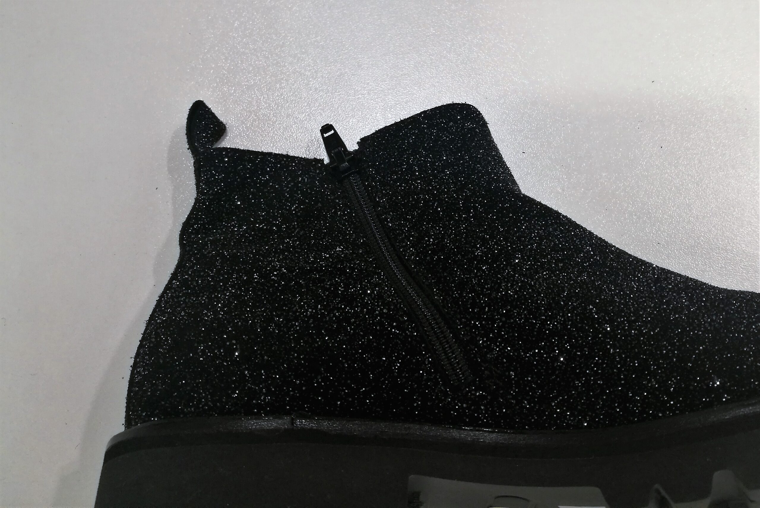 Stivaletto basso glitterato nero. Chiusura zip laterale interna e elastico laterale, Suola in gomma nera