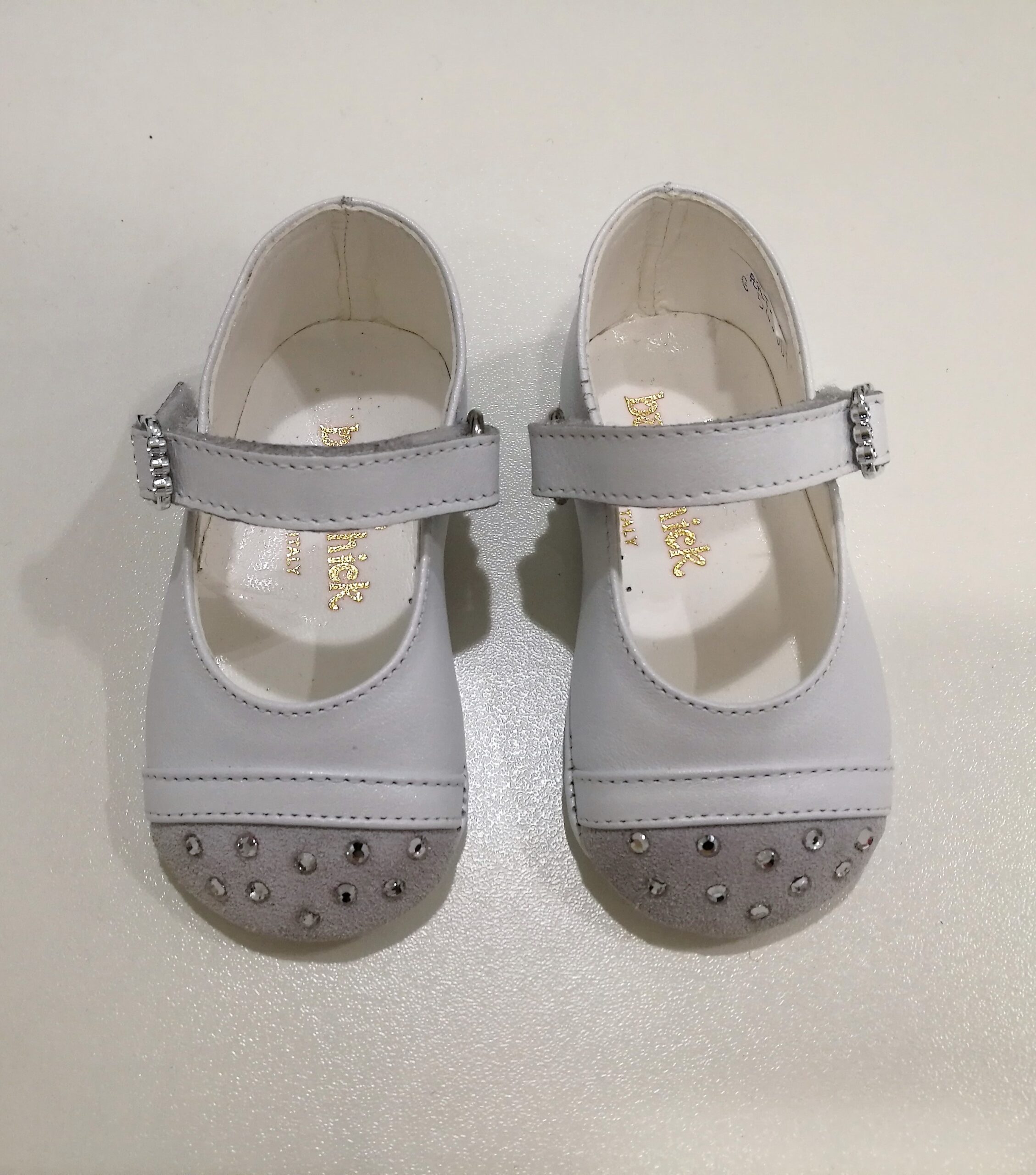 Ballerine bianche con punta in suède grigia con piccoli strass. Braccialetto con chiusura fibbietta gioiello