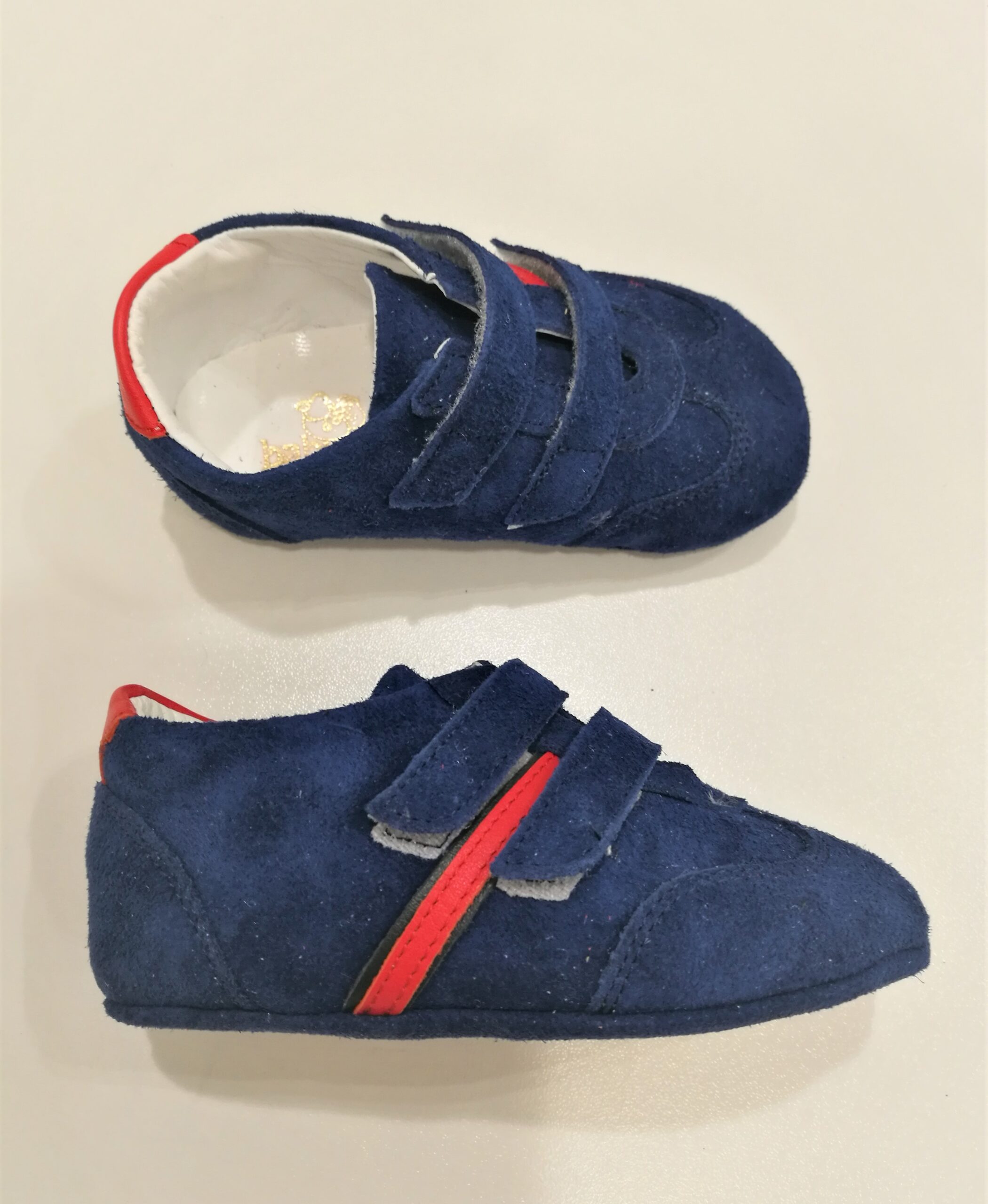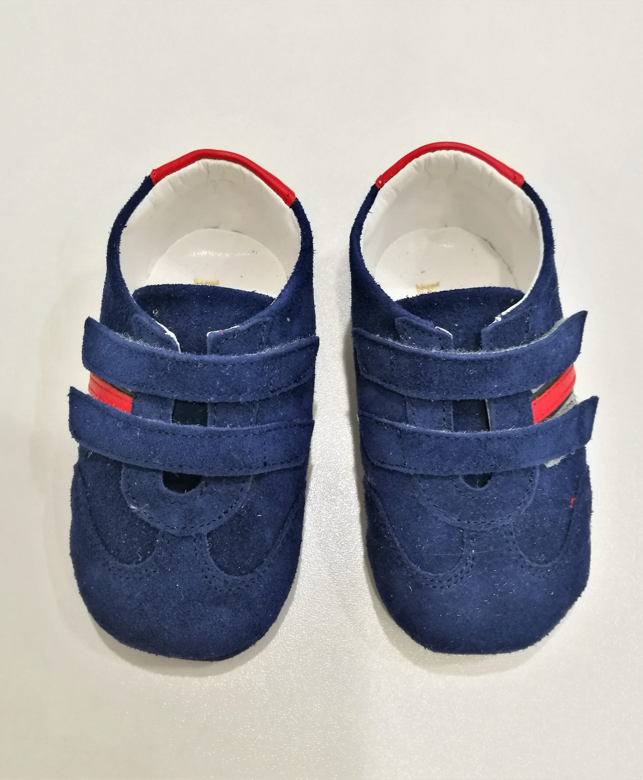 Scarpette in suède blu con fascia laterale rossa. Doppia chiusura con velcro.