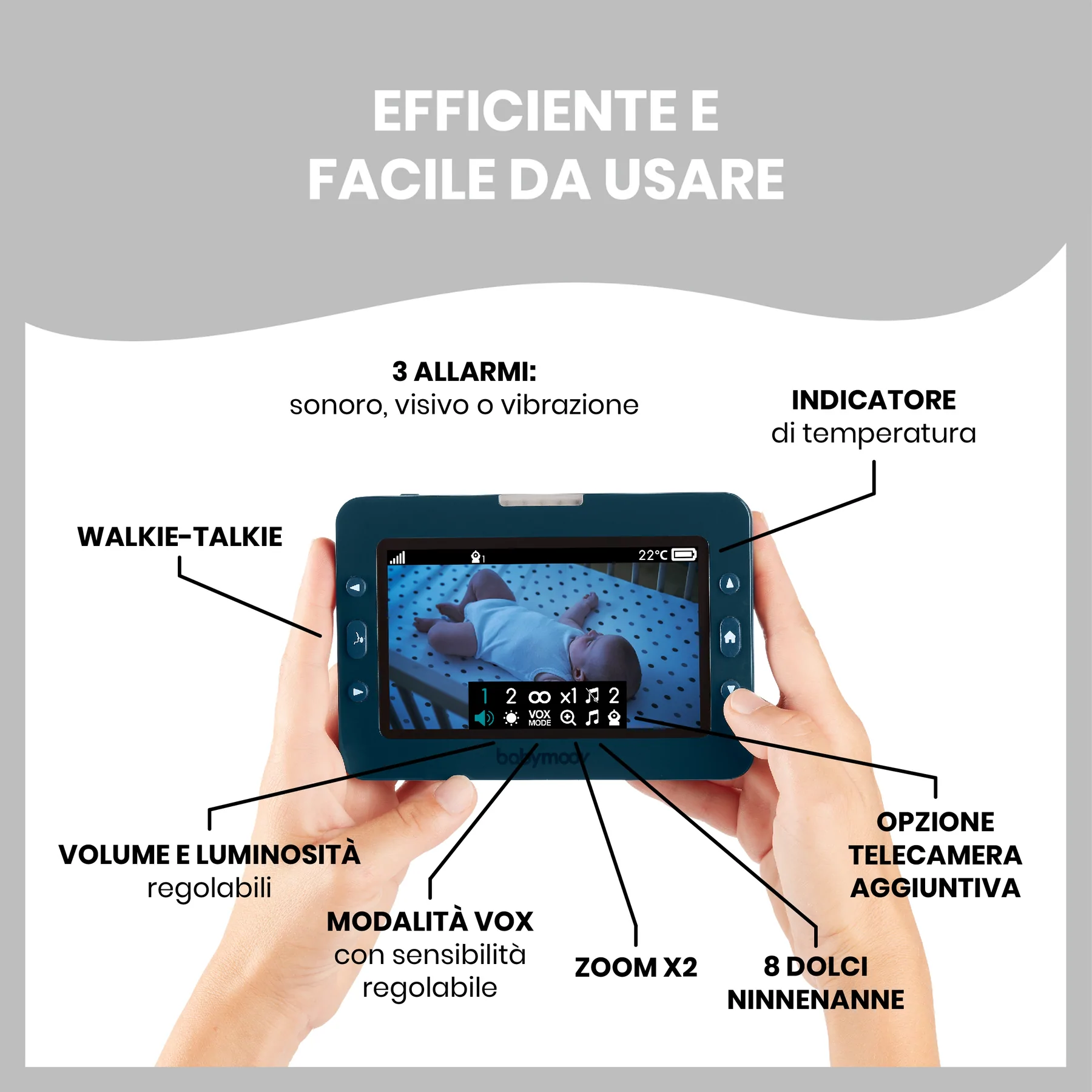 E’ dotato di un sensore di temperatura integrato e di 8 ninne nanne,  mentre la funzione walkie-talkie vi permetterà di parlare direttamente con il bambino!