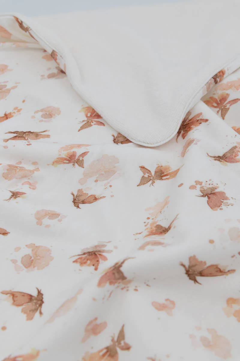 Copertina in morbidissimo jersey di bambù organico con stampa a fantasia e un lato di peluche in spugna.