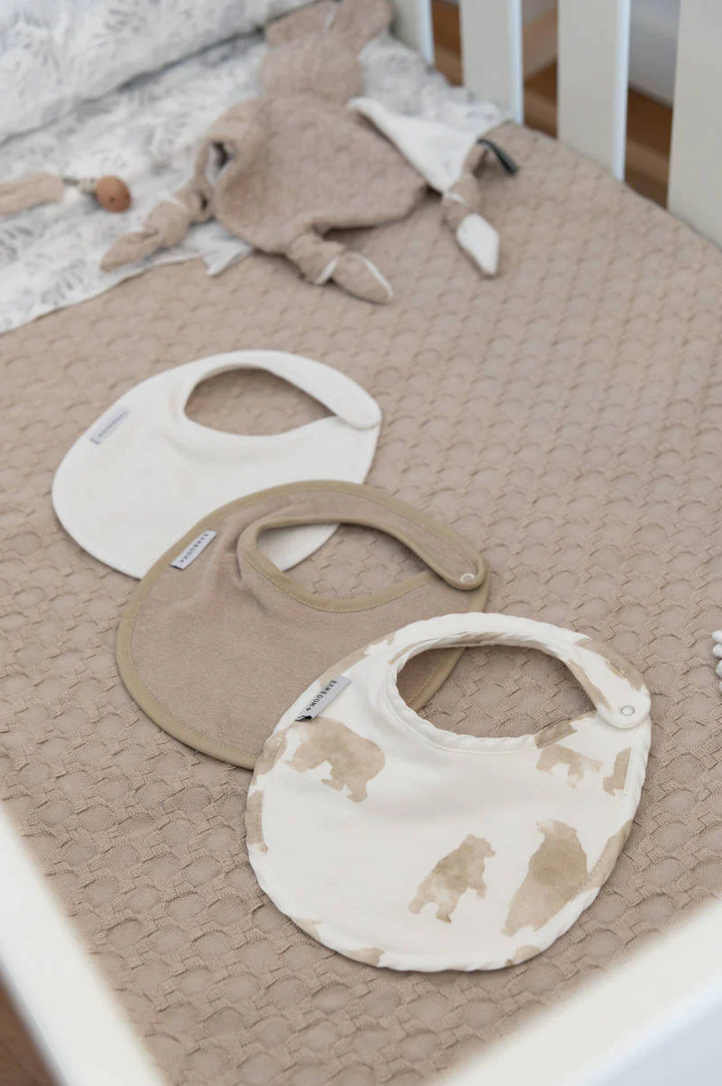 Il Bib Set è una confezione di tre bavaglini rotondi con perfetta copertura intorno al collo del bambino.