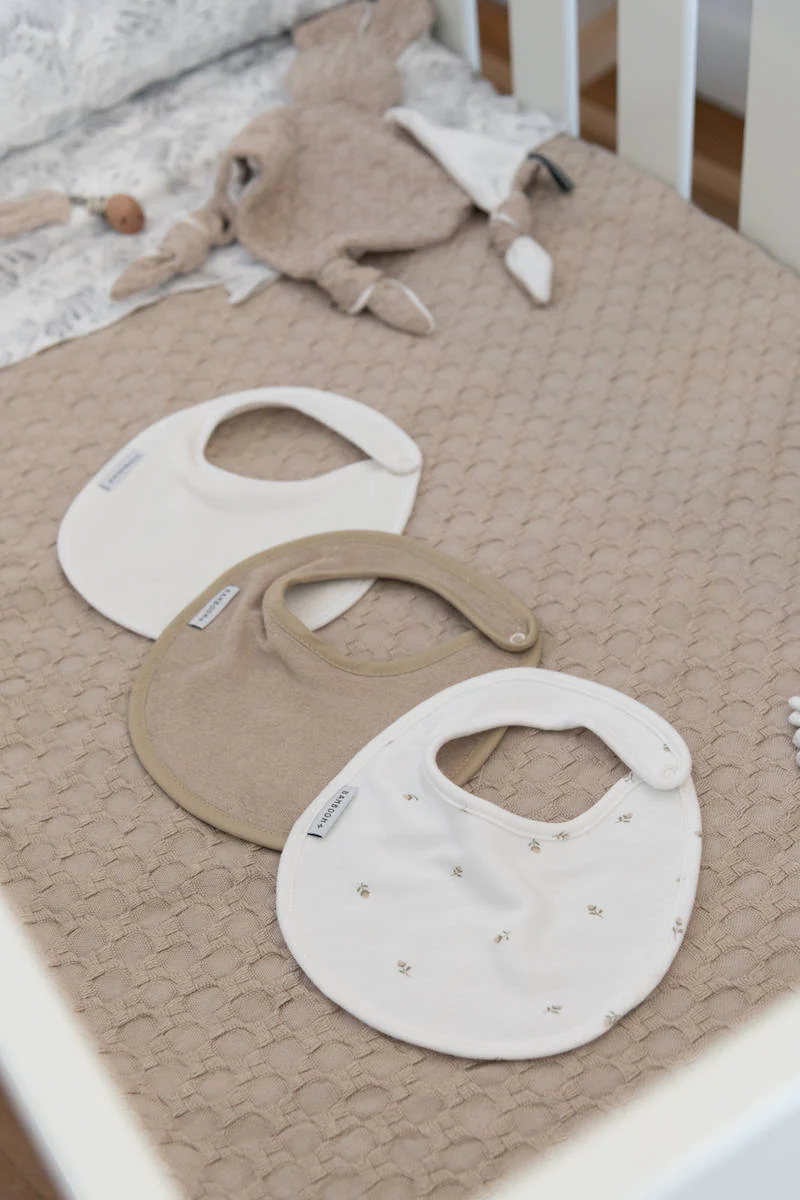 Il Bib Set è una confezione di tre bavaglini rotondi con perfetta copertura intorno al collo del bambino.