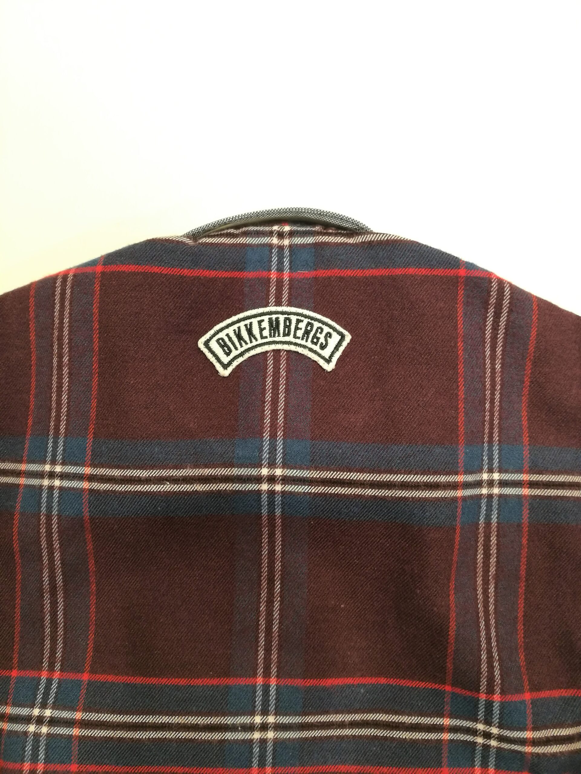 Camicia in tessuto a grandi quadri su fondo bordò. Taschino e colletto in tessuto in contrasto. Logo curvo dietro con scritta “Bikkembergs”
