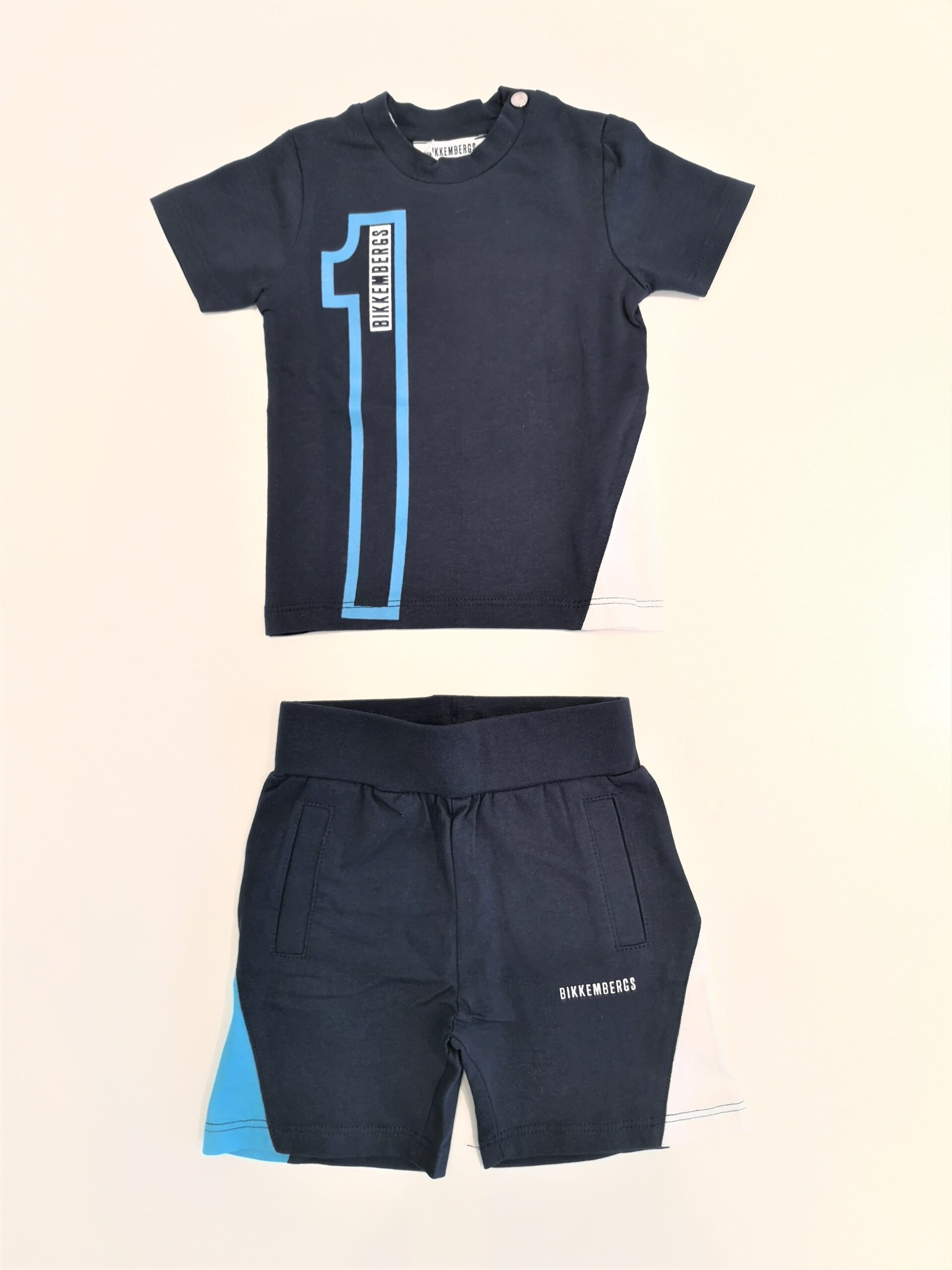 Completo blu 2 pezzi in jersey : t-shirt manica corta con stampa numero 1 davanti e dietro + pantaloncini abbinati con elastico in vita