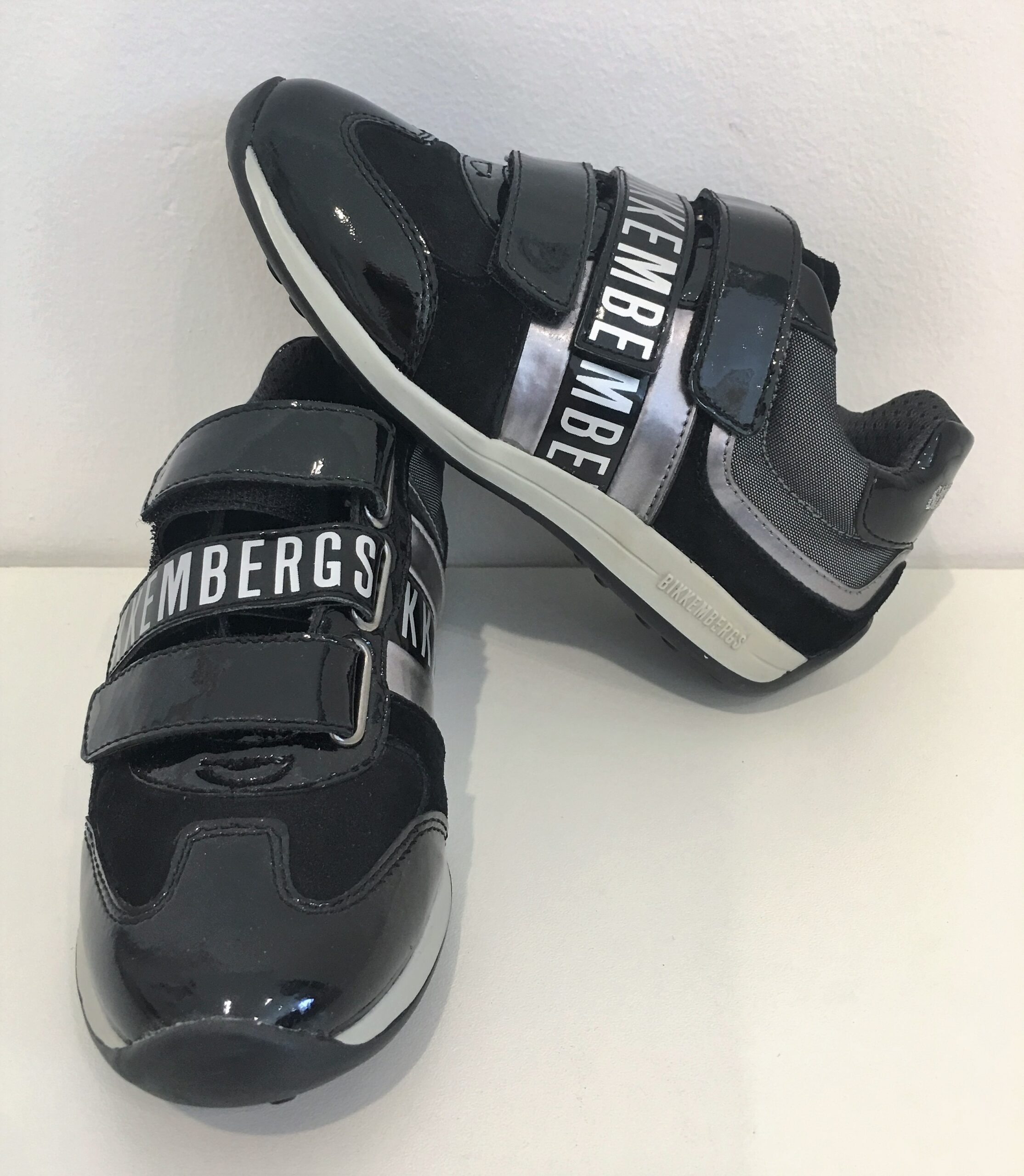 Sneakers BIKKEMBERGS in vernice nera con inserti in argento. Suola in gomma e chiusura con strappi.