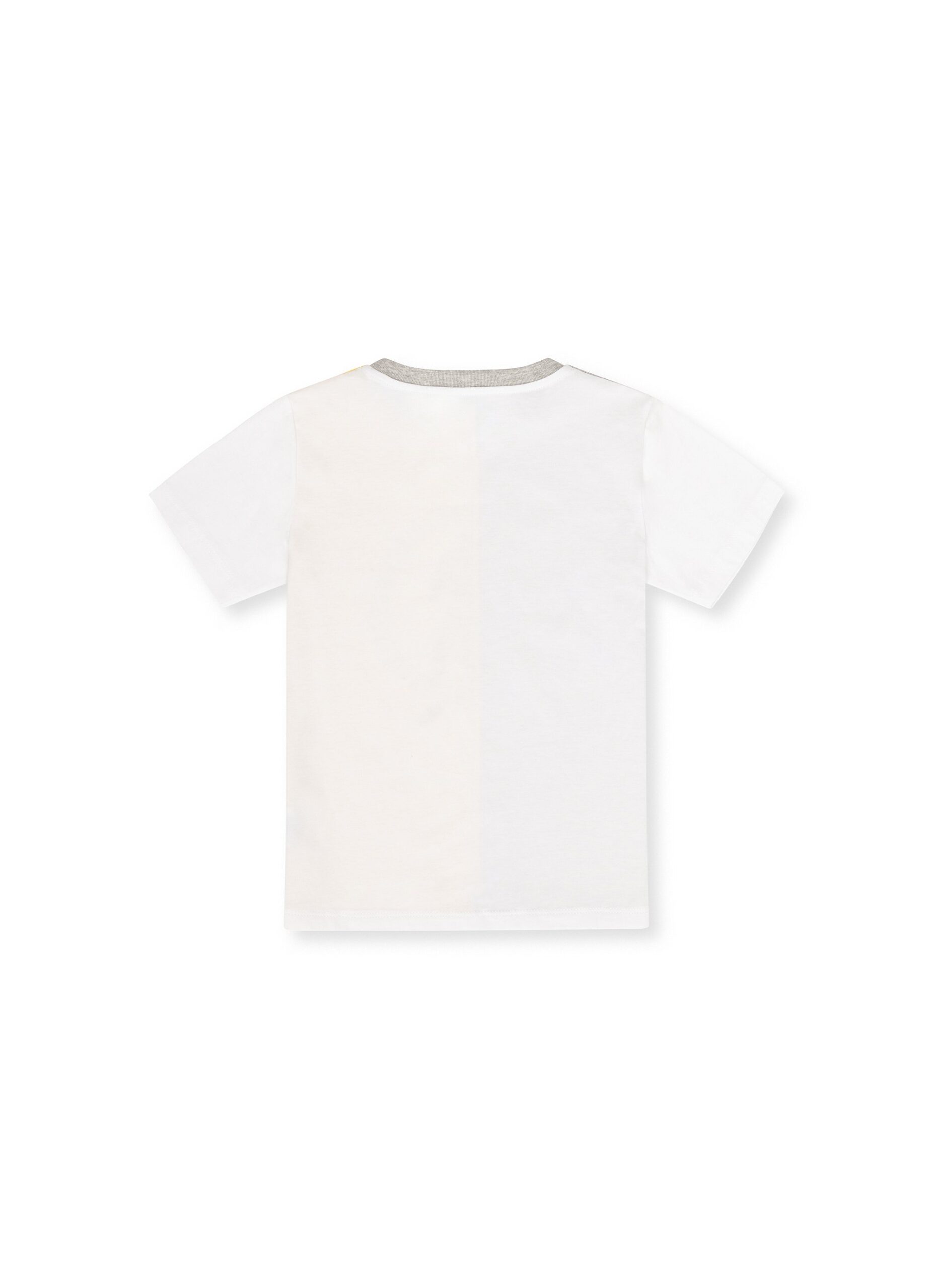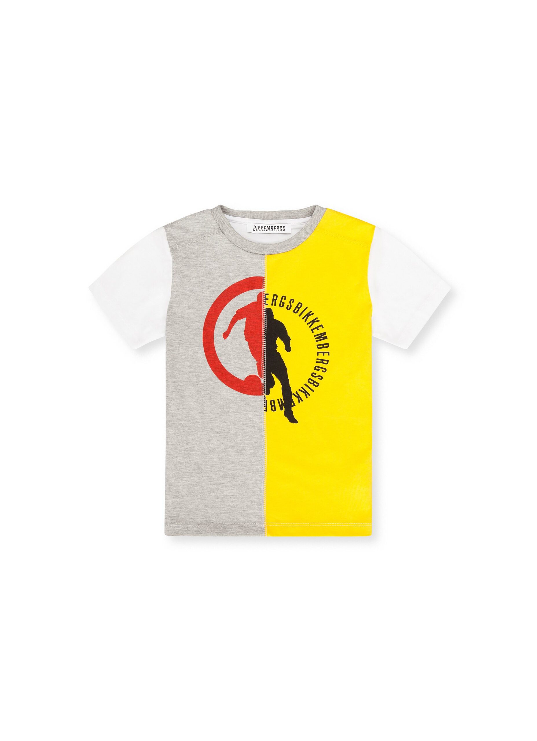 T-shirt manica corta grigio melange/giallo con stampa calciatore bicolore. Dietro bianca
