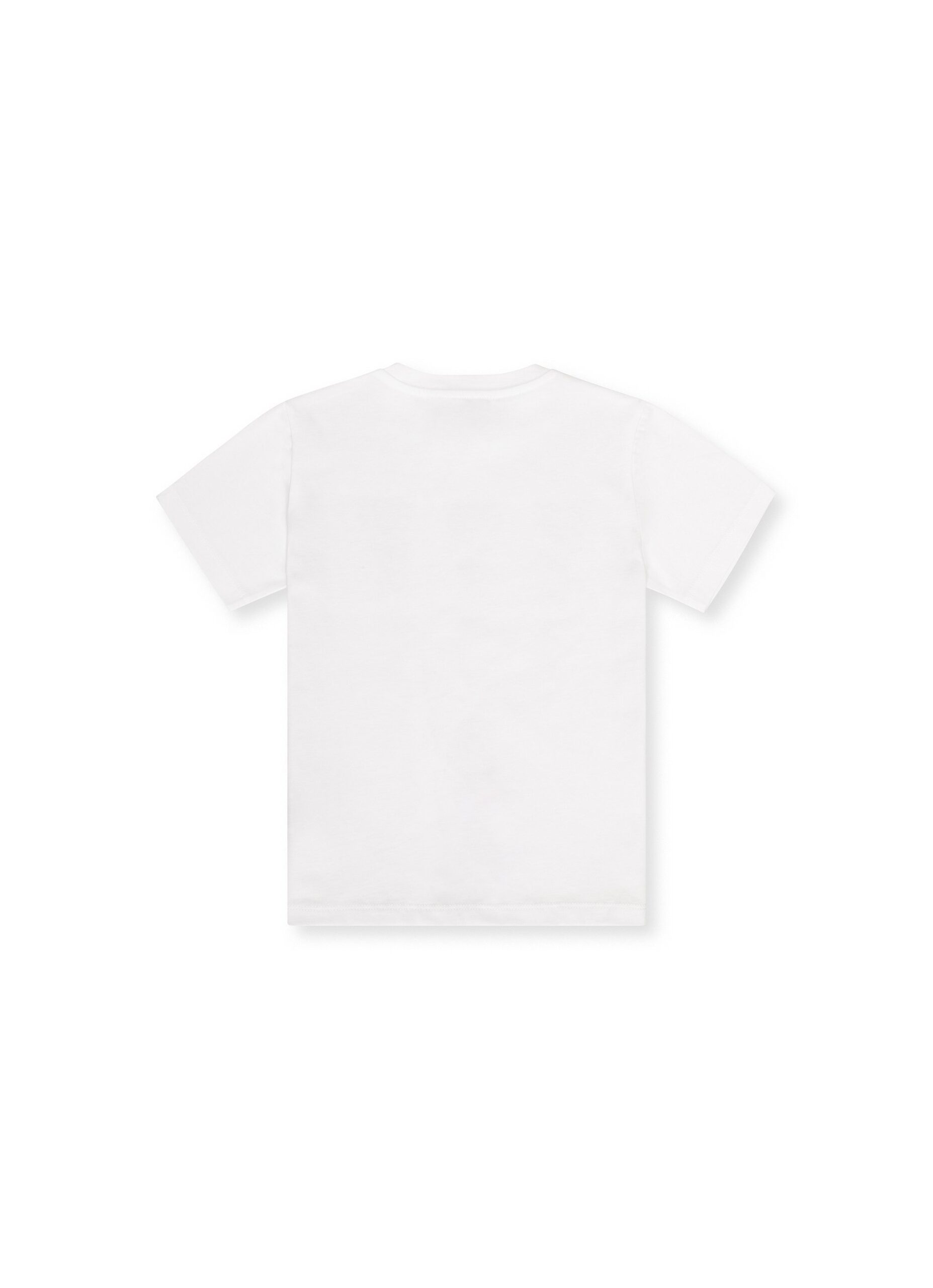 T-shirt in cotone bianca e stampa pallone davanti con scritta “Bikkembergs”. Impunture verdi. Bottoncino sulla spalla per essere indossata più