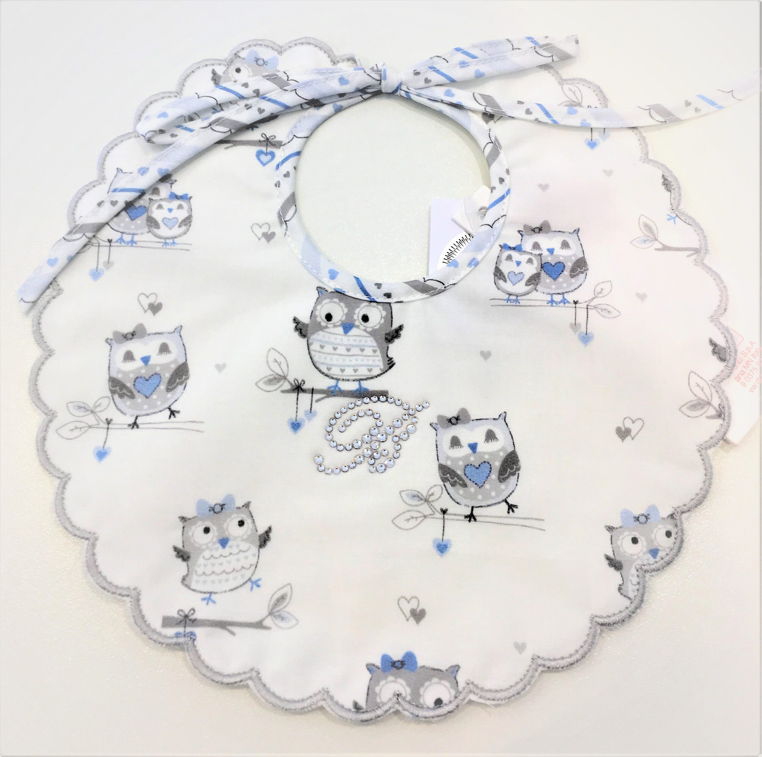 BLUMARINE bavetta con tema gufetti in azzurro e logo con Swarovski elements.