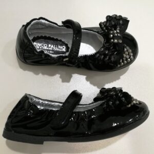 I Pinco Pallino ballerina in vernice nera con dettaglio fiocco e strass. Modello punta arrotondata e suola in gomma. Chiusura