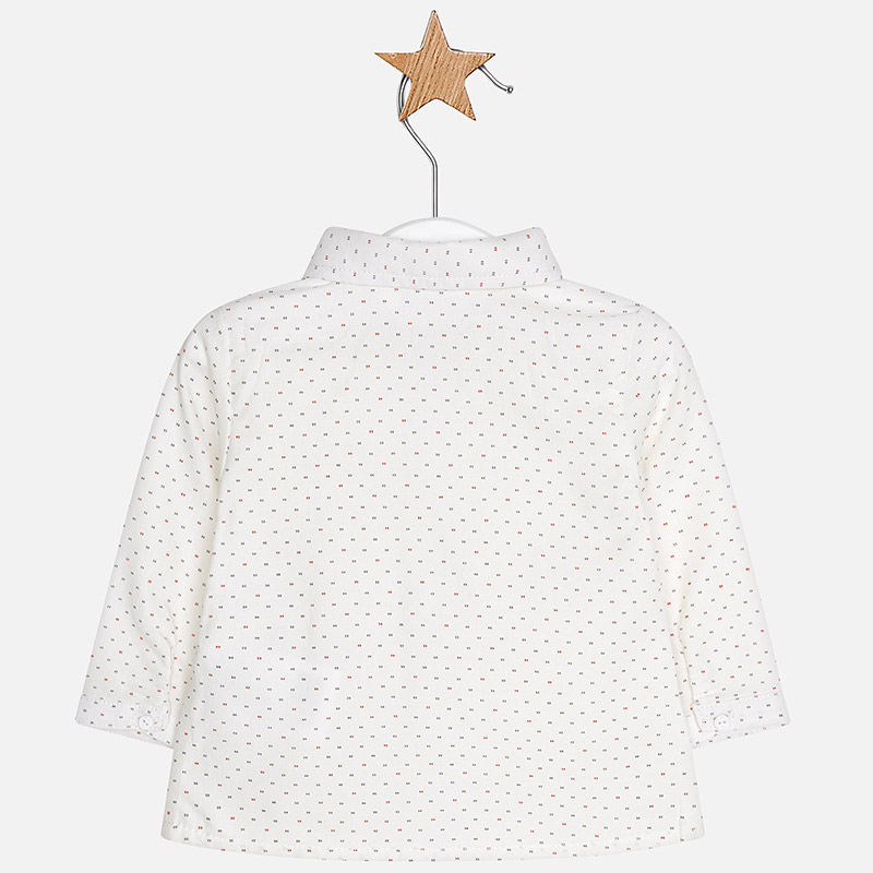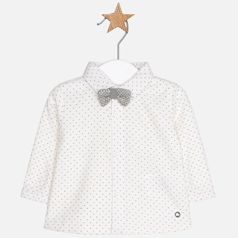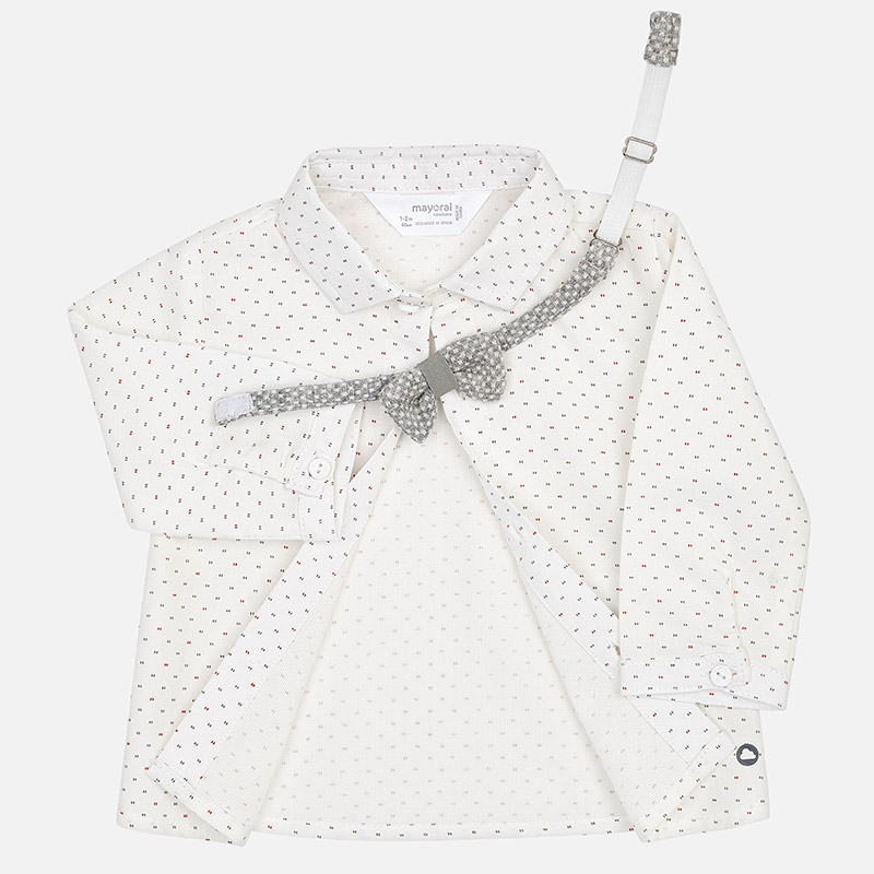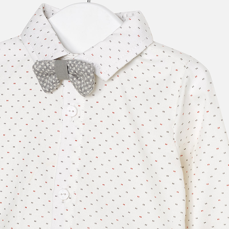 Camicia manica lunga neonato con polsini con bottoni. Colletto con papillon elasticizzato e regolabile. Chiusura con bottoni nella parte anteriore. Tessuto modello camicia. Modello appartenente alla nostra linea più elegante ed esclusiva pensata per le occasioni importanti.