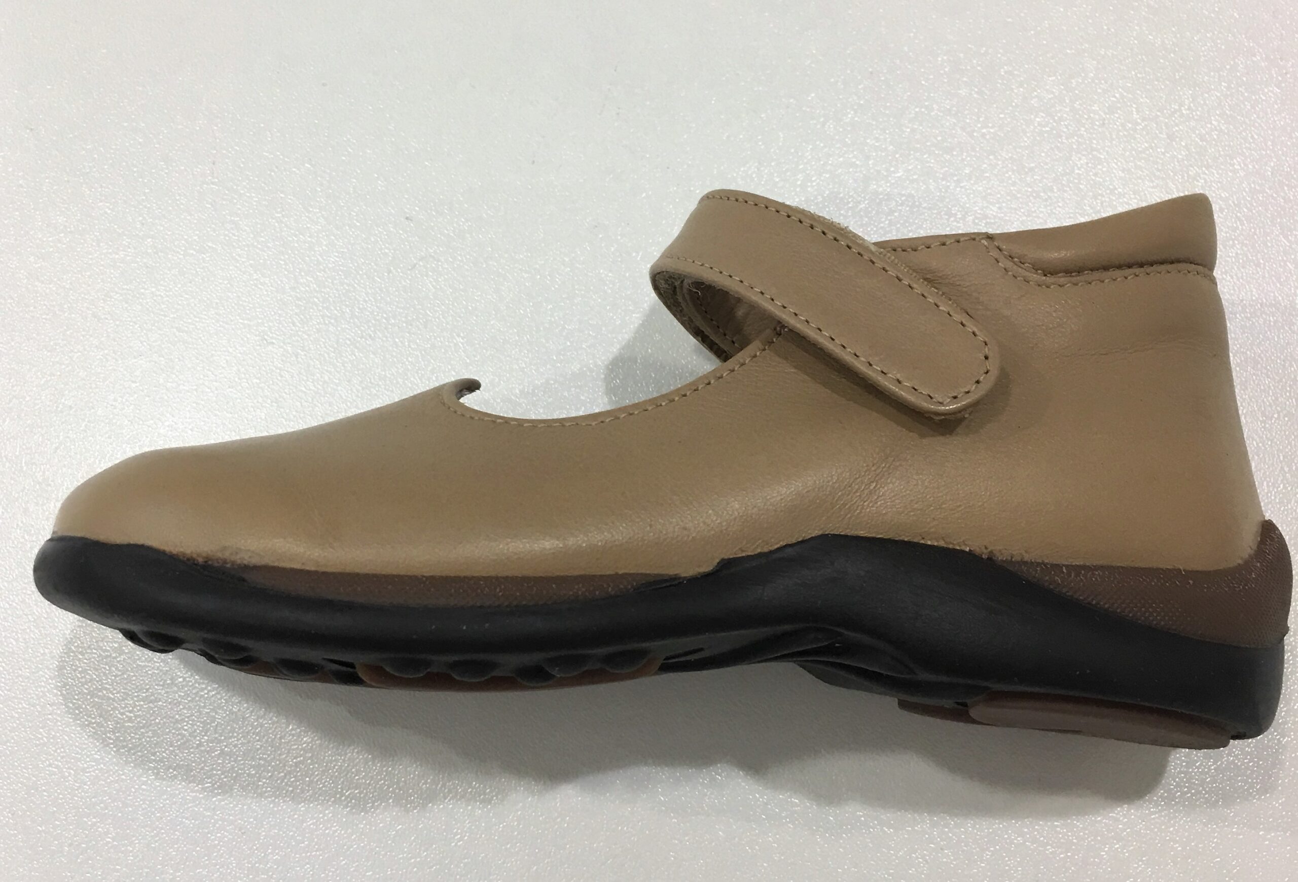 Cherie ballerina in pelle beige con scollo a cuore. Modello punta arrotondata e suola in gomma. Chiusura con velcro.