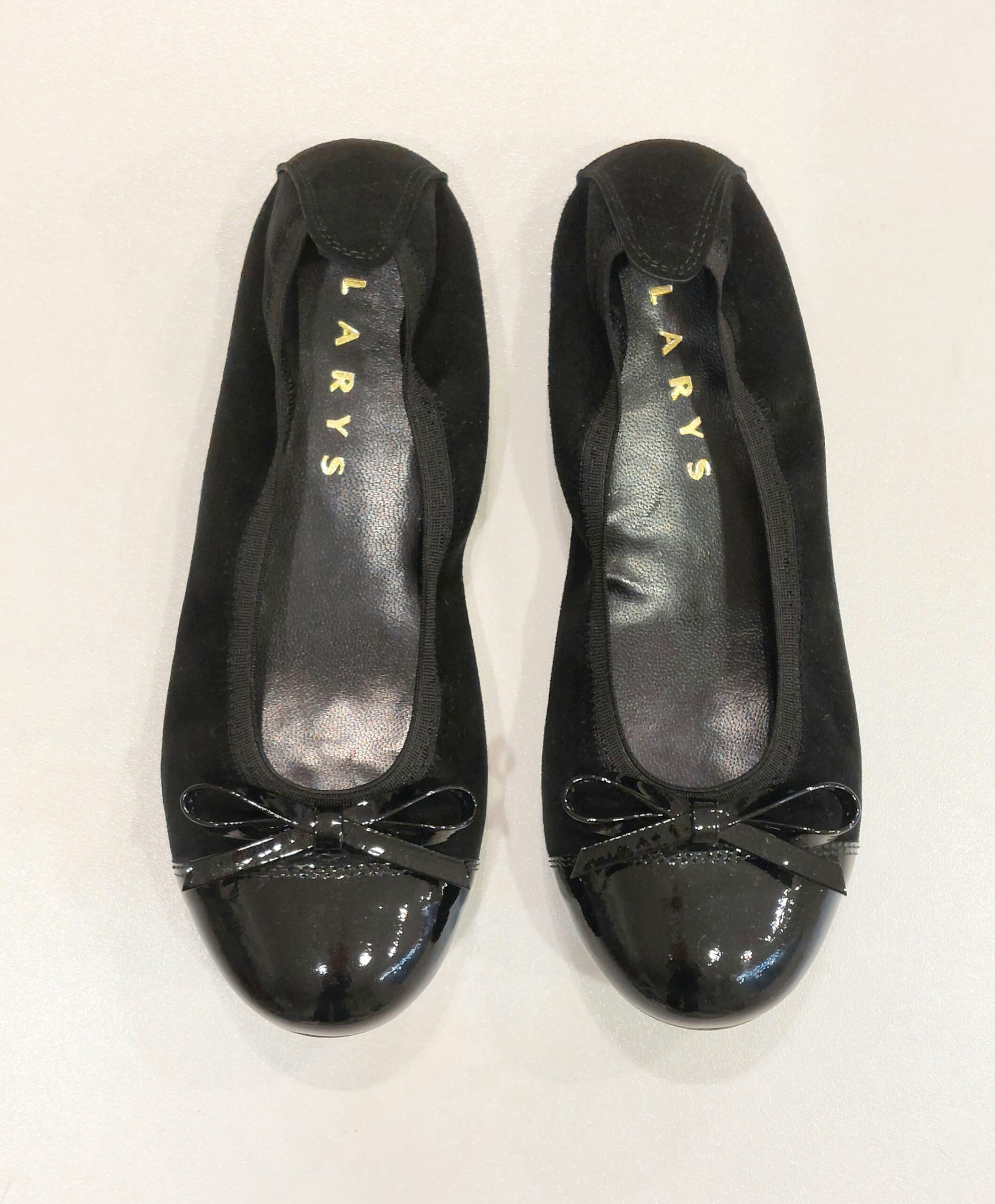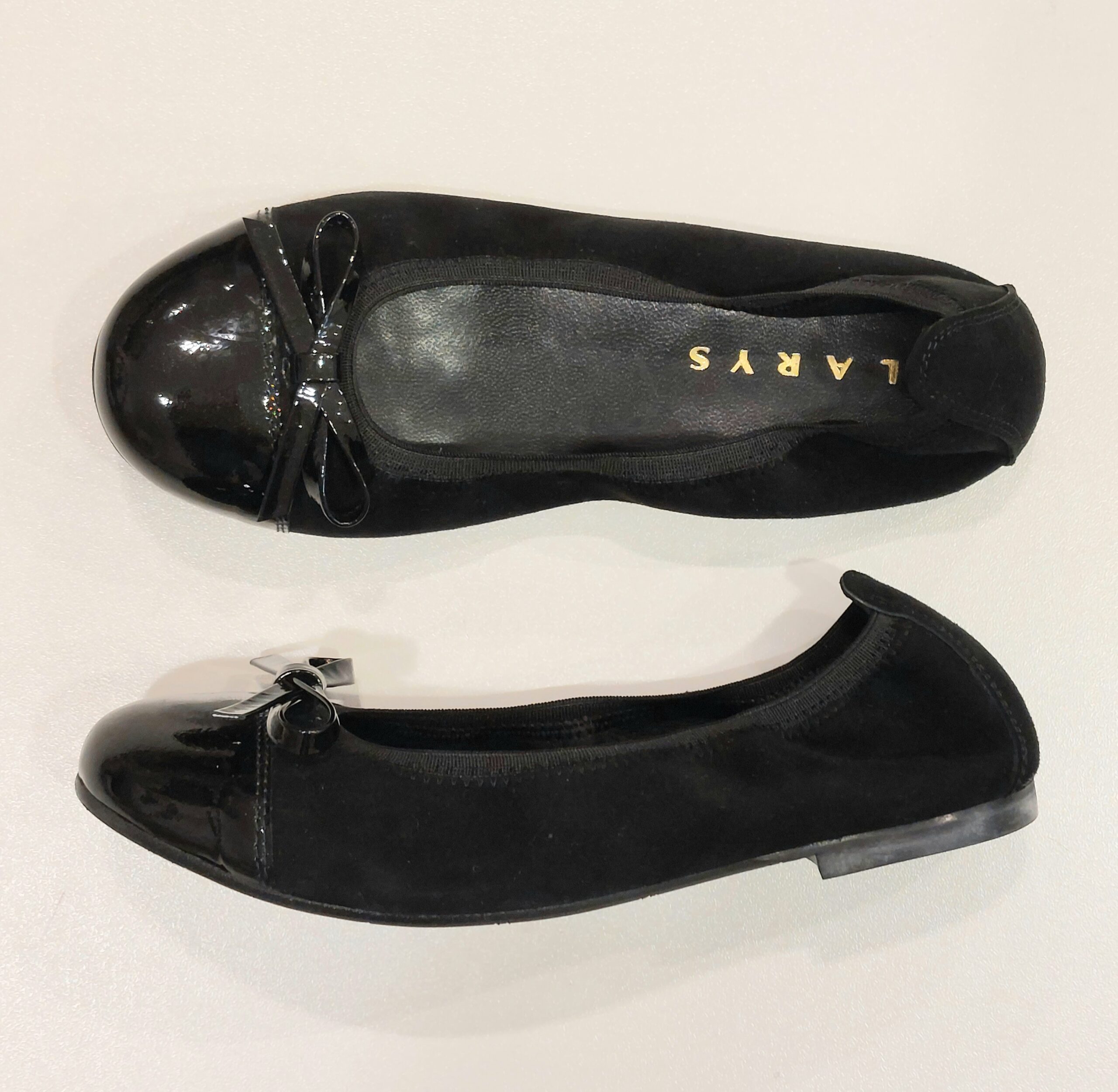 Ballerina in suède nero con punta in vernice. Davanti dettaglio fiocchetto. Bordo elastico per una calzatura confortevole