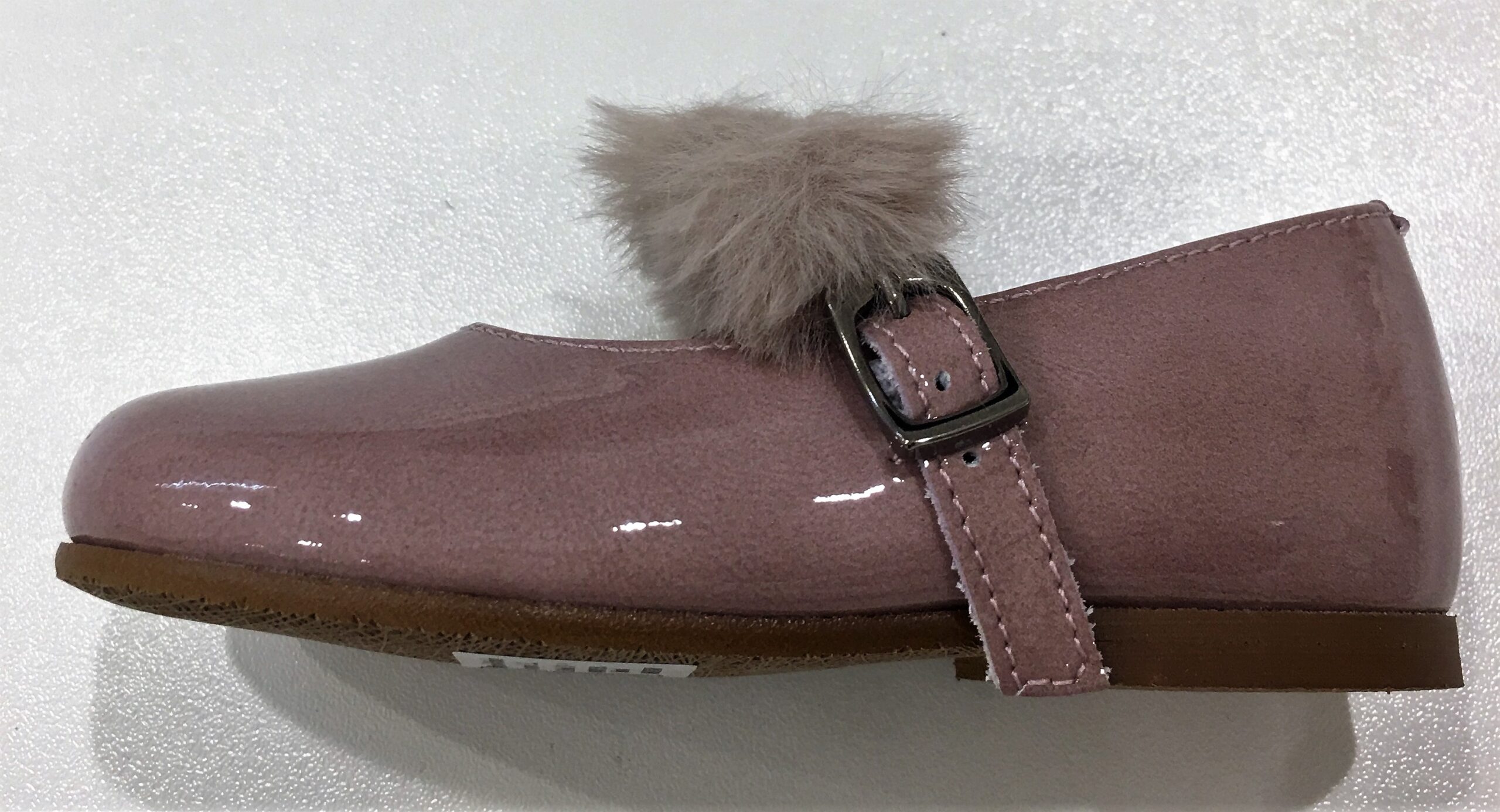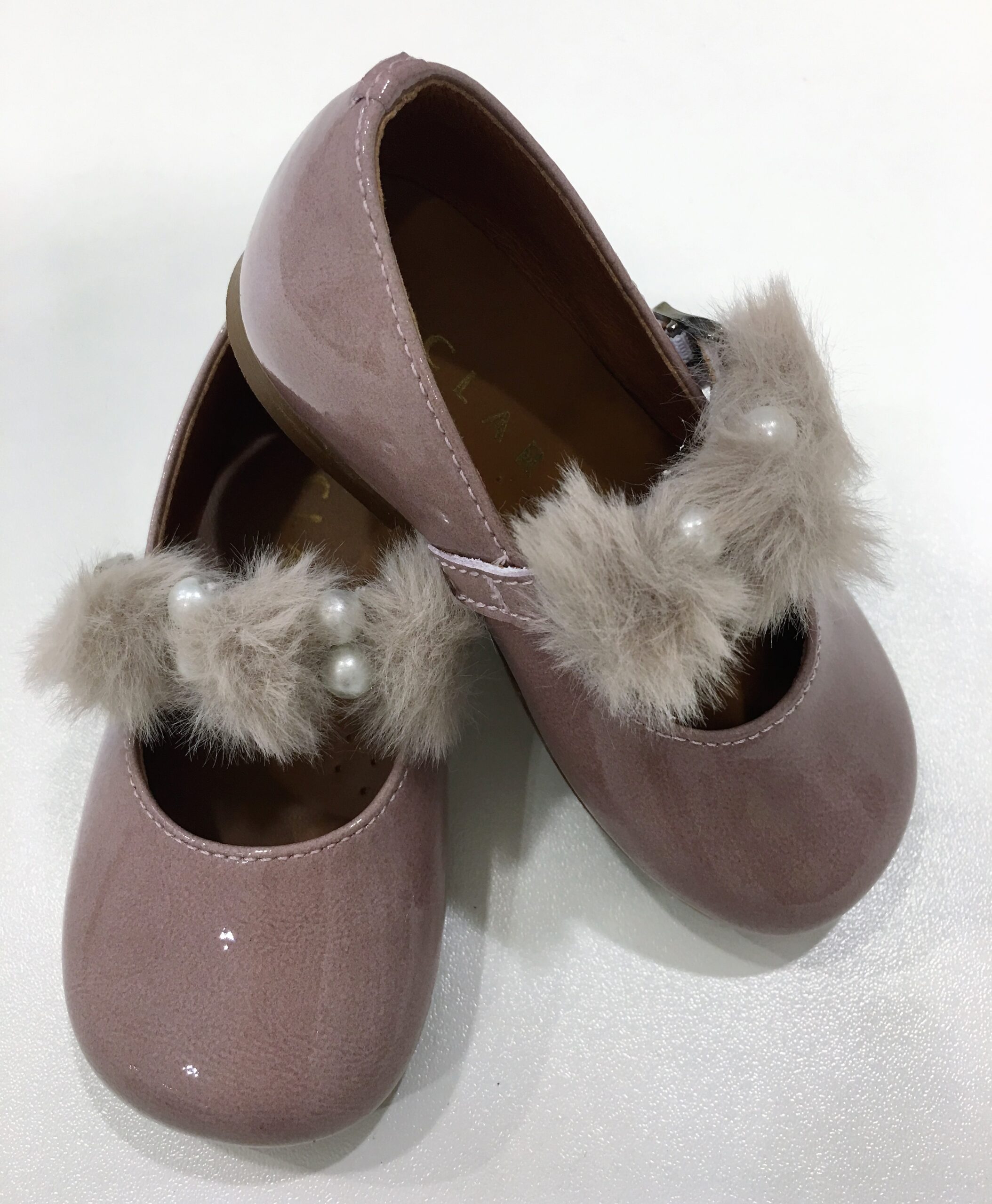 Ballerina in vernice rosa con dettaglio in pelliccia e perline. Modello con punta tonda e suola in gomma. Chiusura laterale con fibbia .