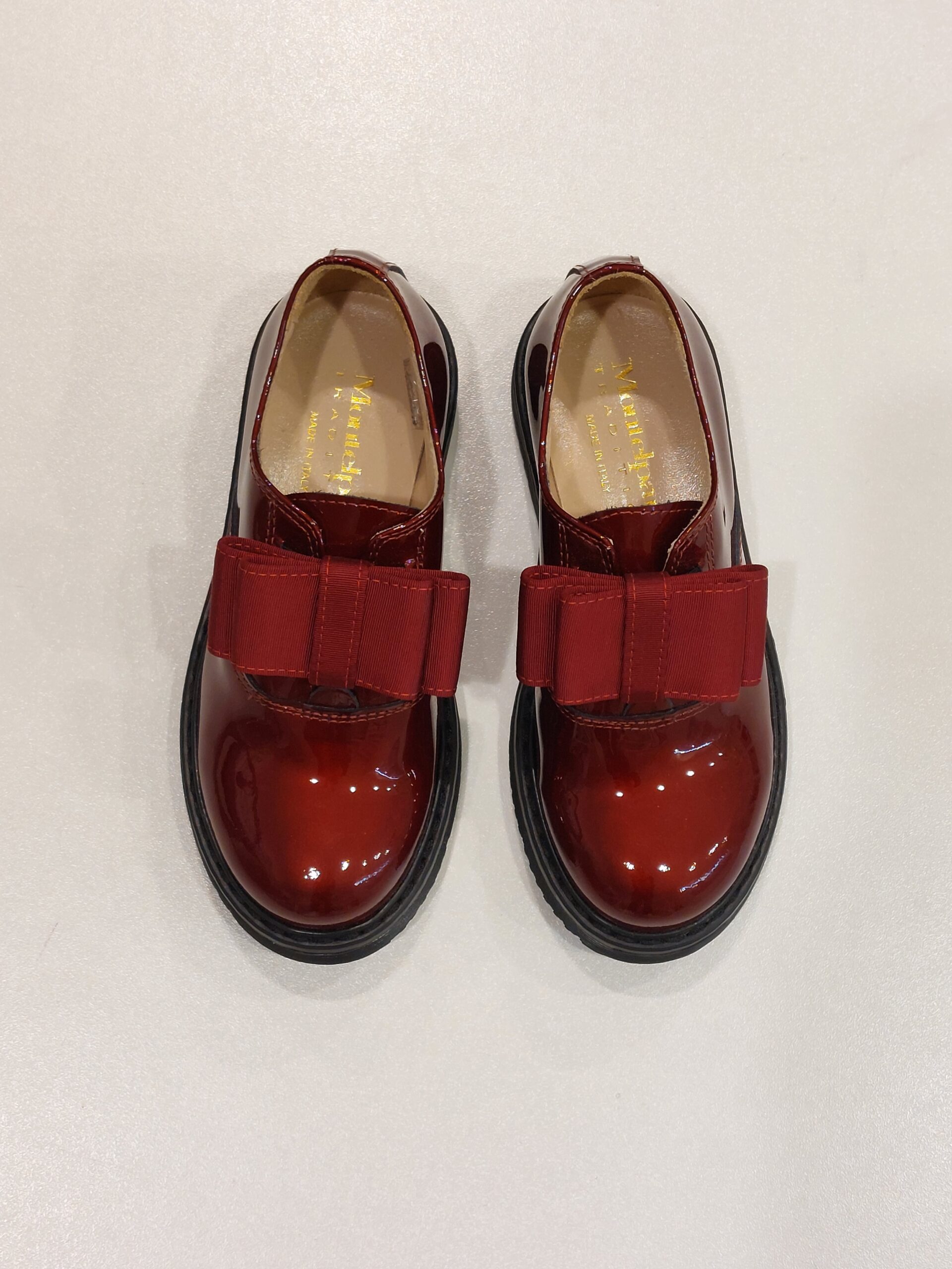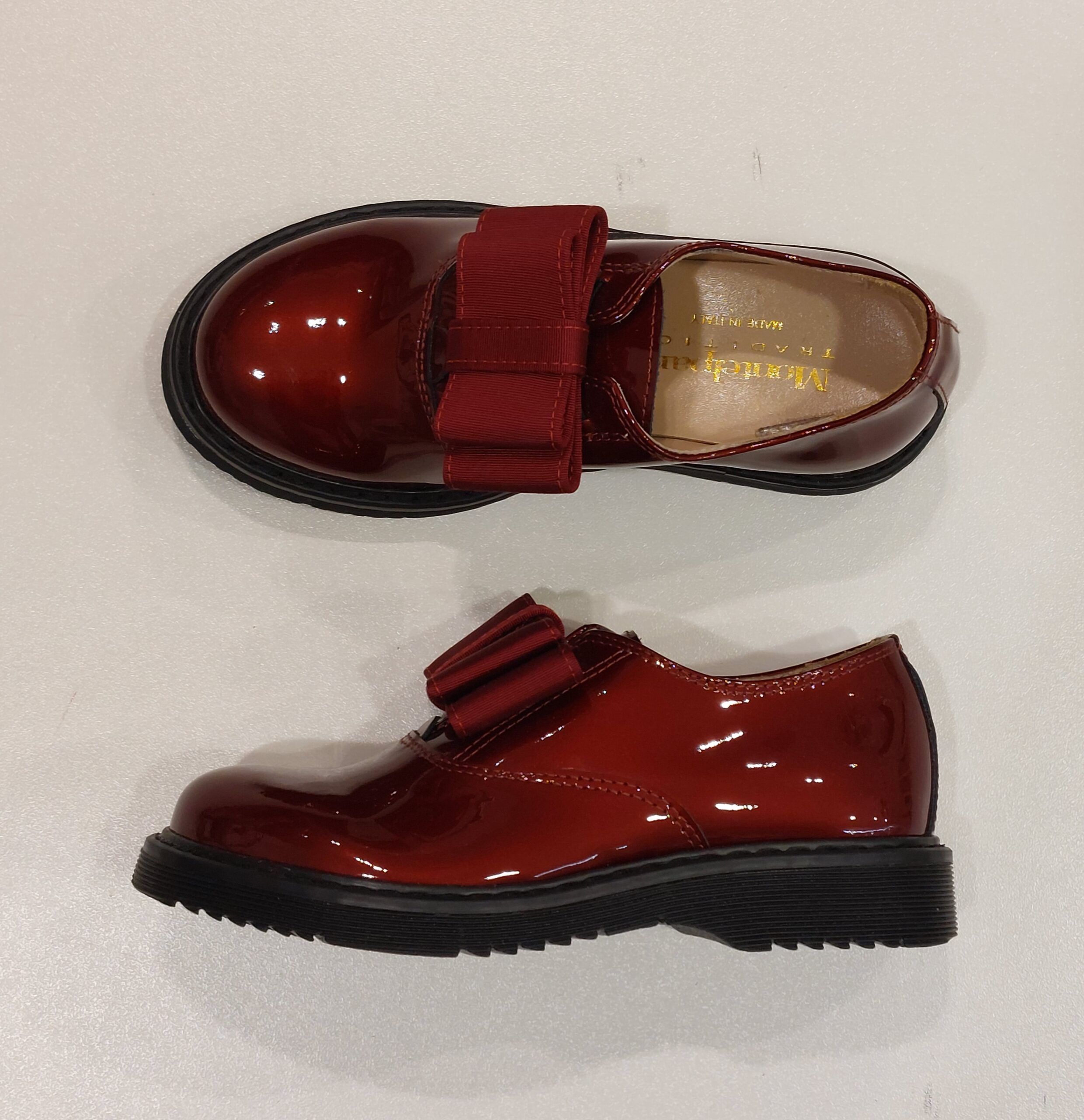 Scarpe in vernice con fiocco bordeaux. Suola in gomma e punta arrotondata.