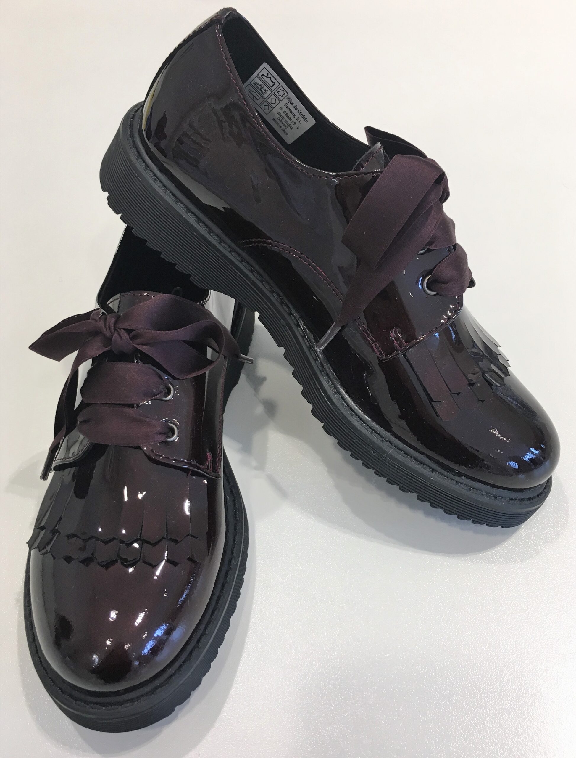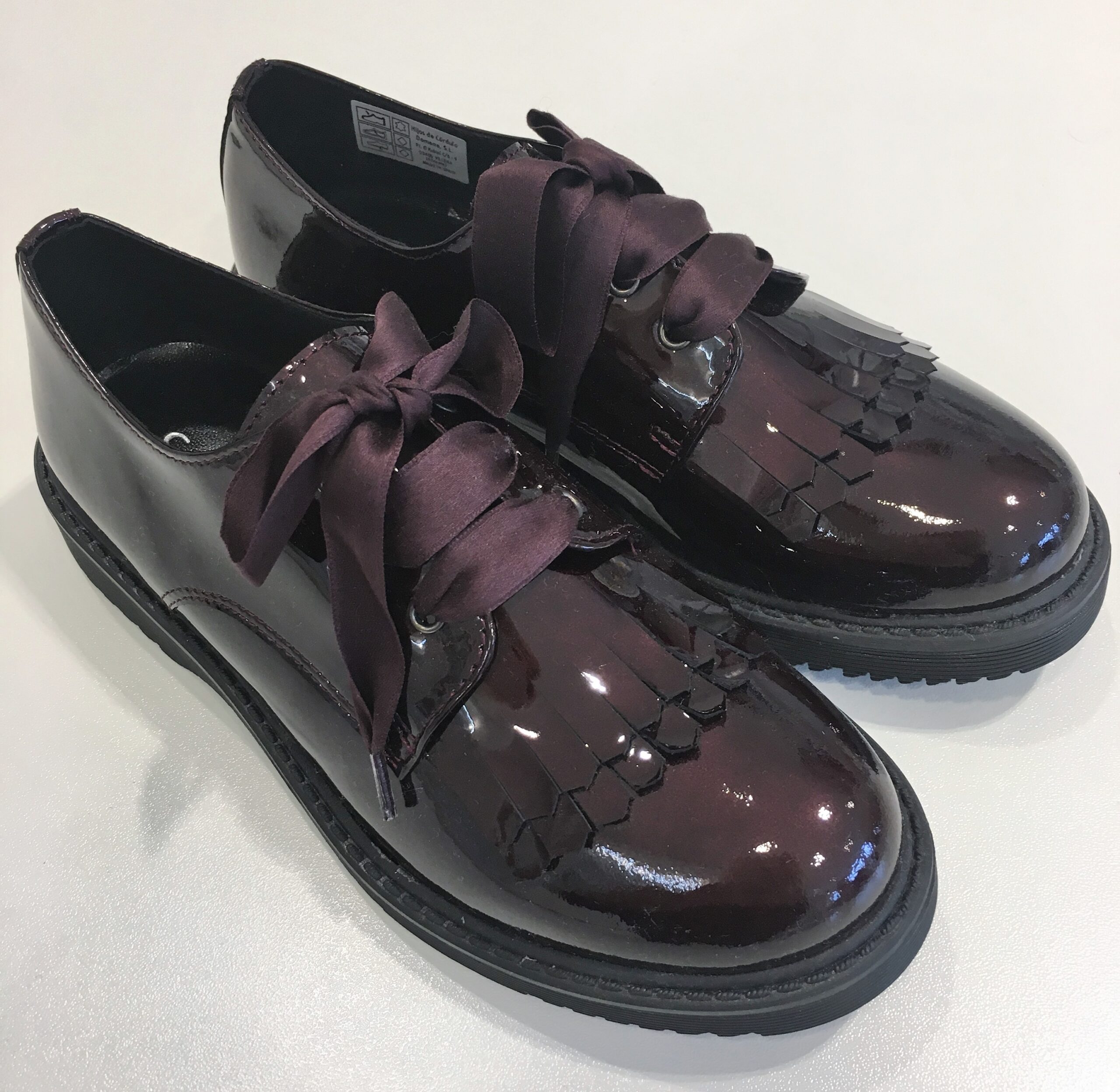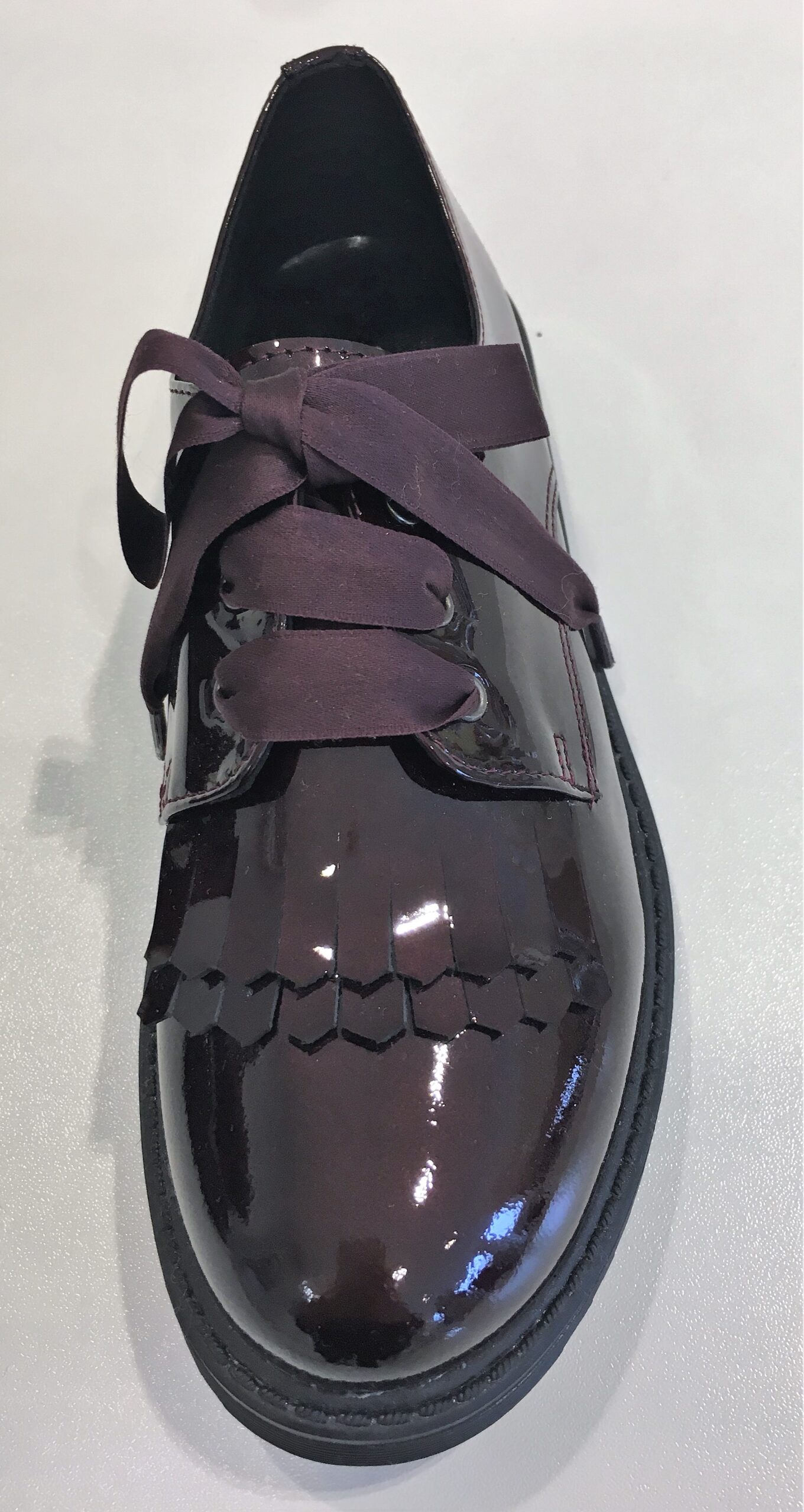 Scarpe in vernice con frangia bordeaux, lacci in raso. Suola in gomma e punta arrotondata.