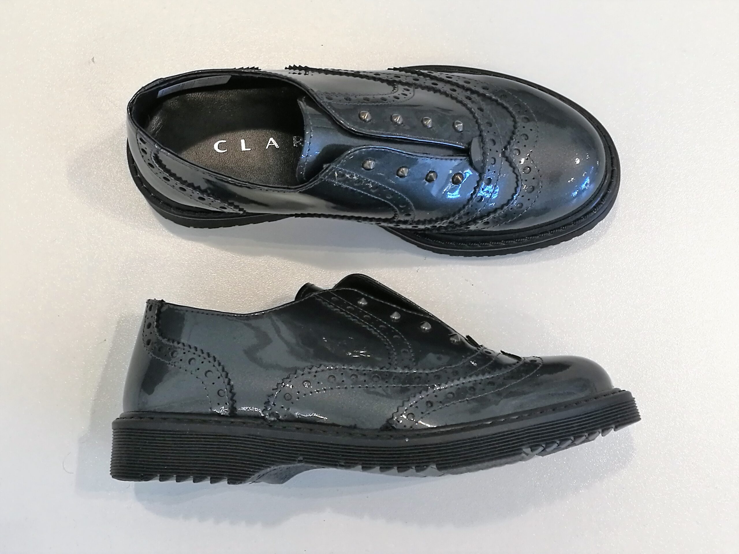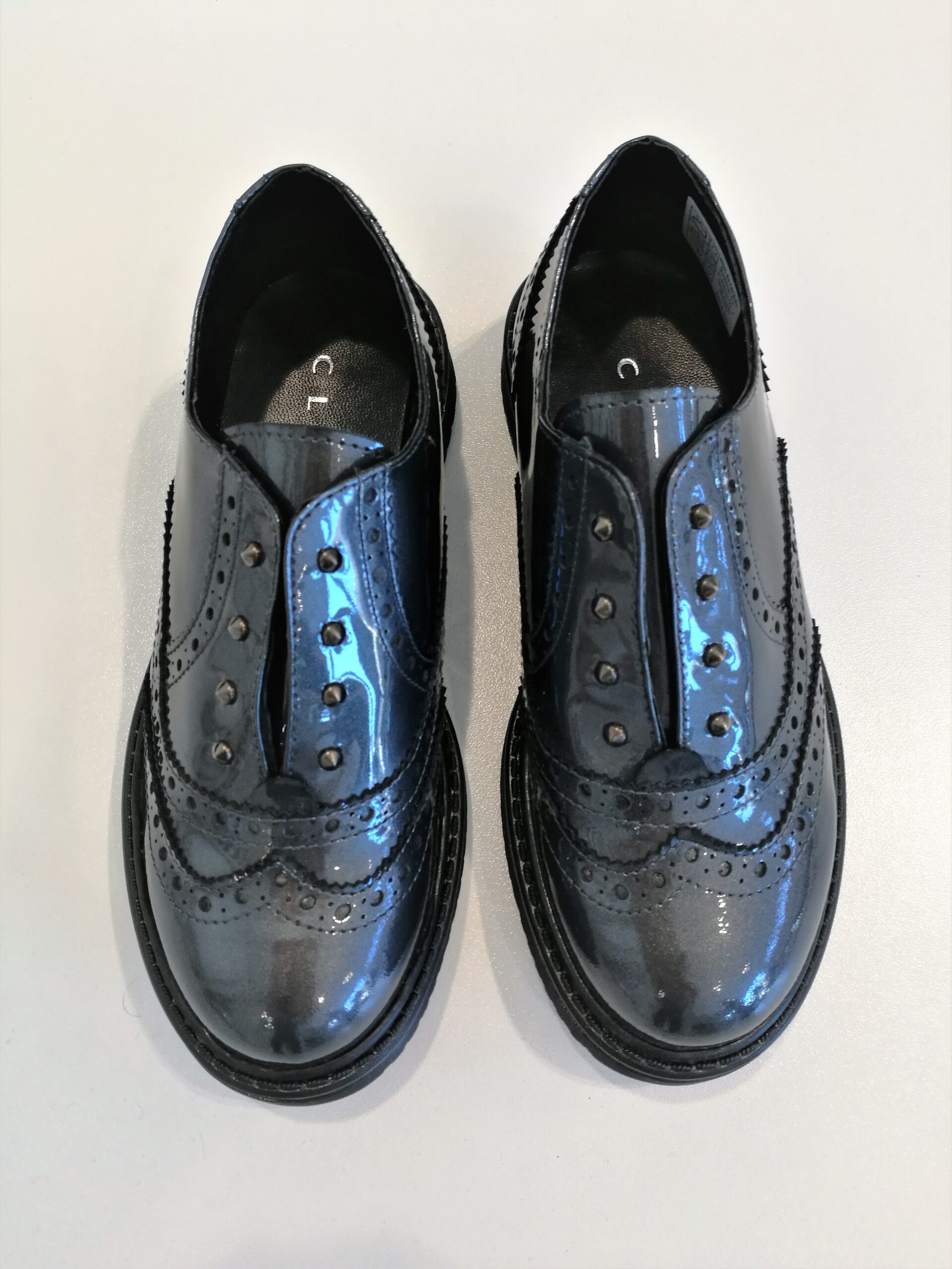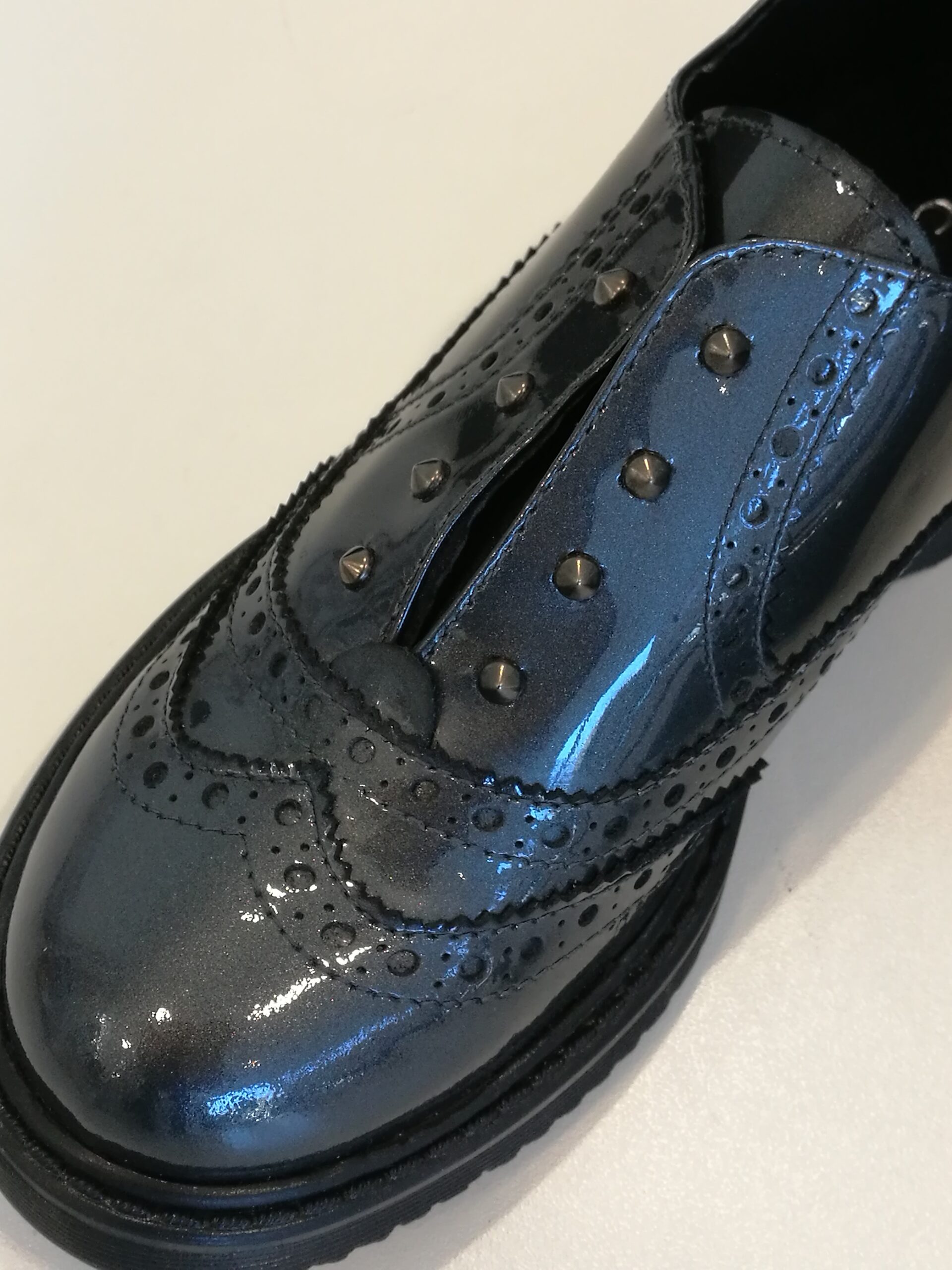 Scarpe modello slip-on in vernice grigia modello inglesina senza lacci nè velcro. Elastico interno per una facile indossatura. Piccole borchiette davanti.