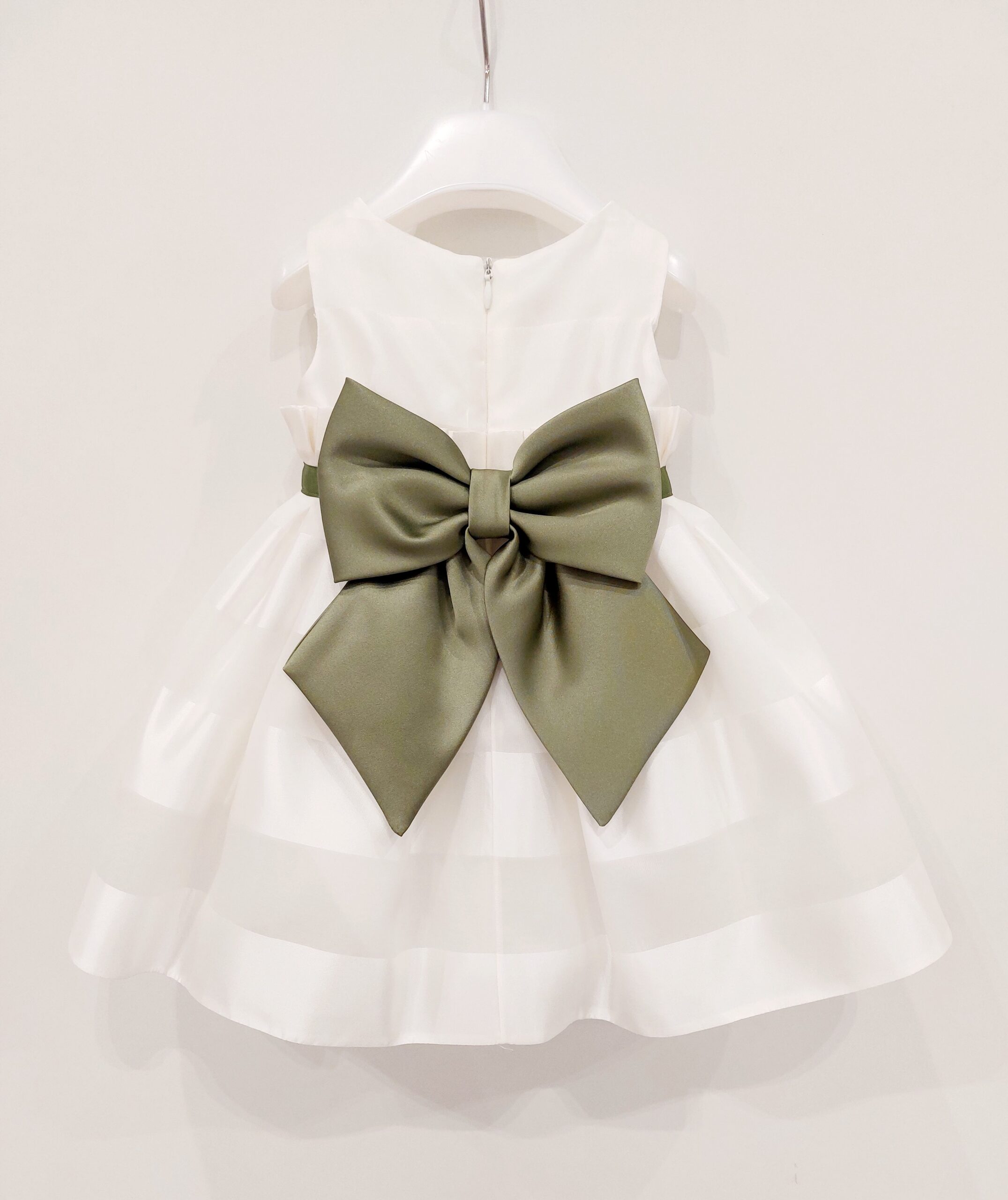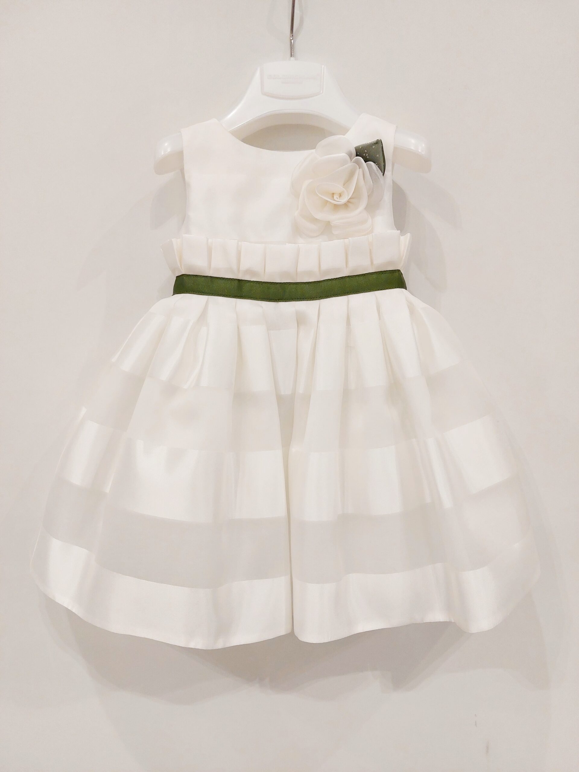 - Abito a righe larghe con ruche intorno al corpetto con fiore applicato davanti. Inserto in verde. Fiocco dietro. Apertura con zip dietro. Sottogonna cucito in tulle.