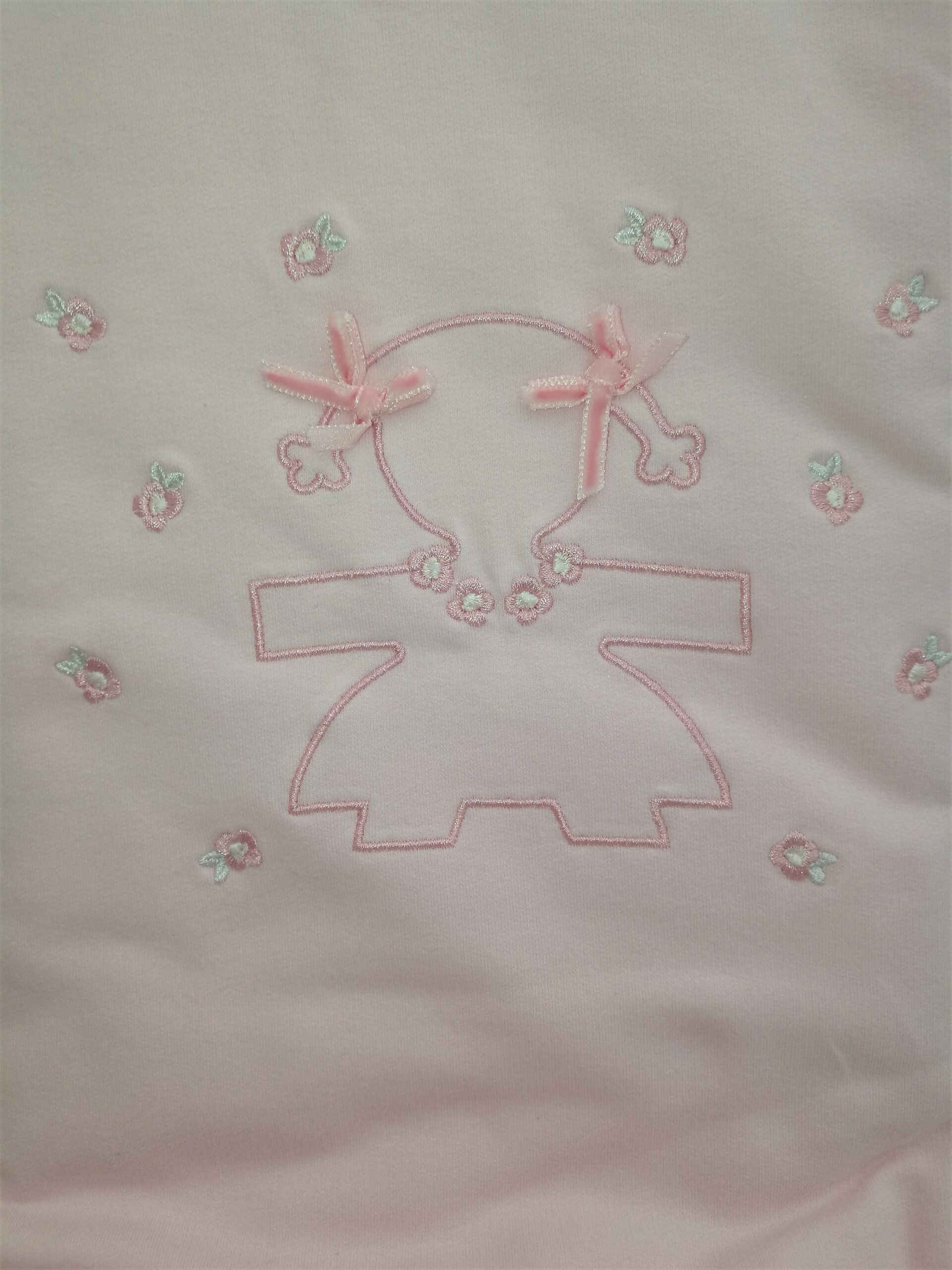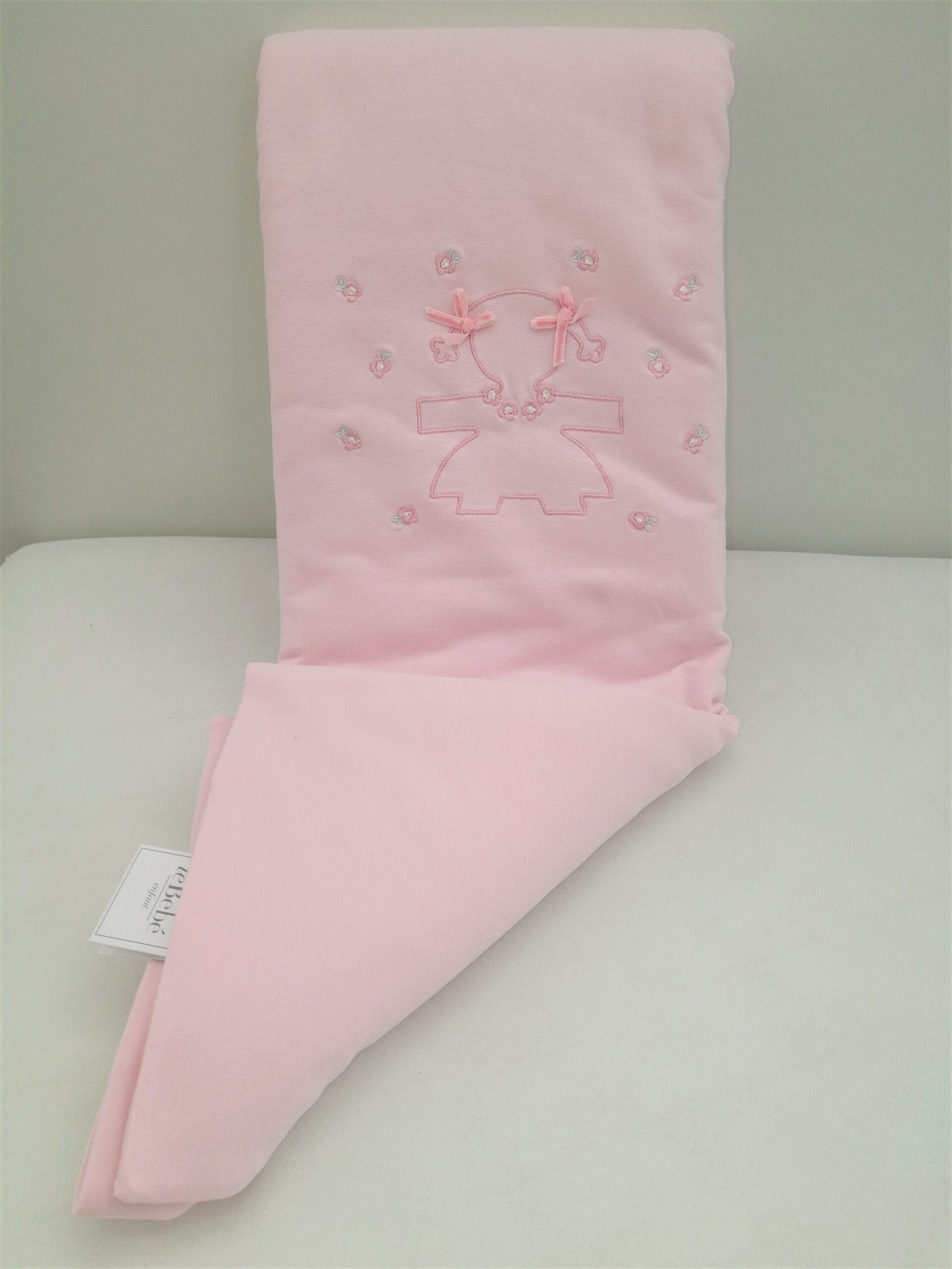 Copertina imbottita in cotone per avvolgere in un caldo e morbido abbraccio il tuo bebé. Fondo rosa con sagoma bambolina e fiorellini ricamati
