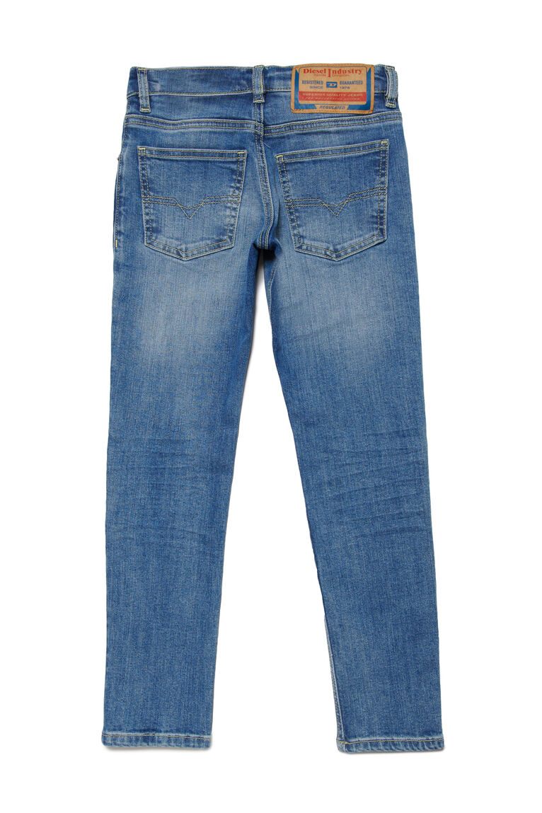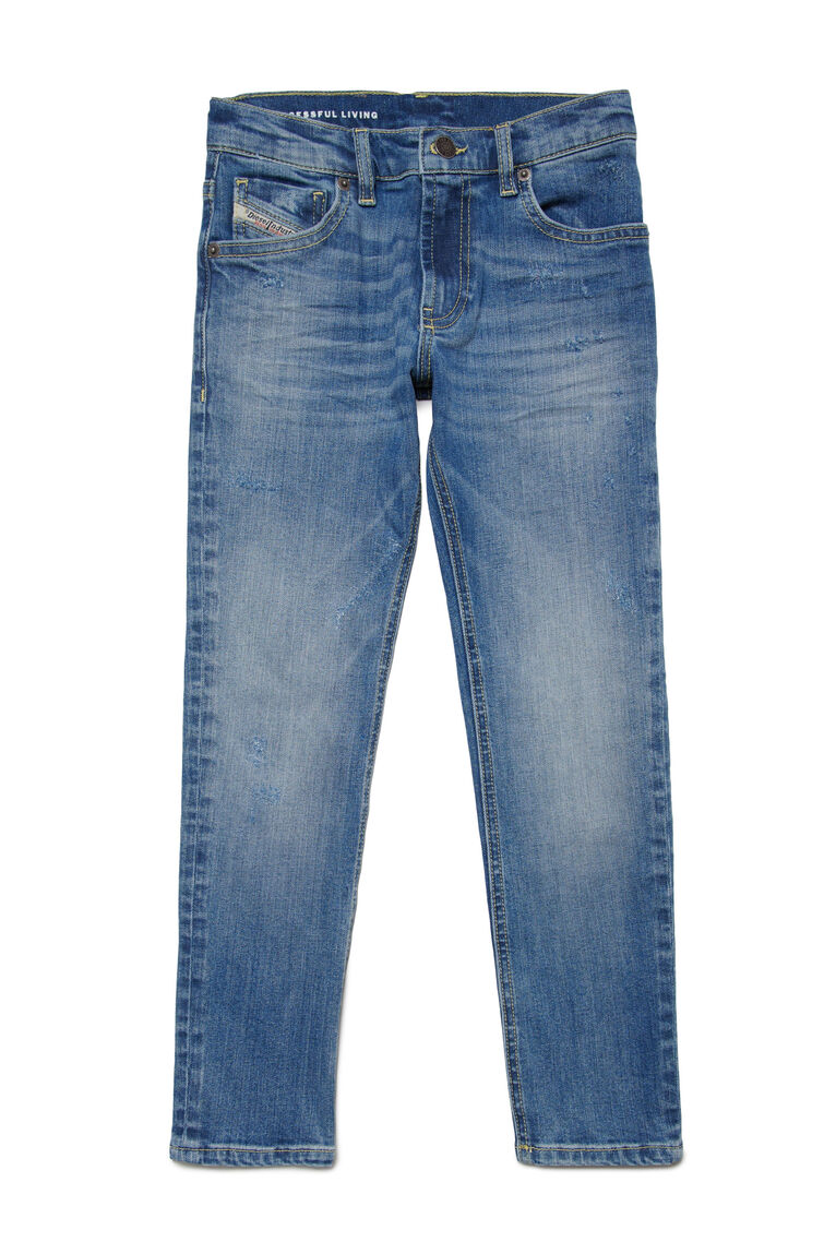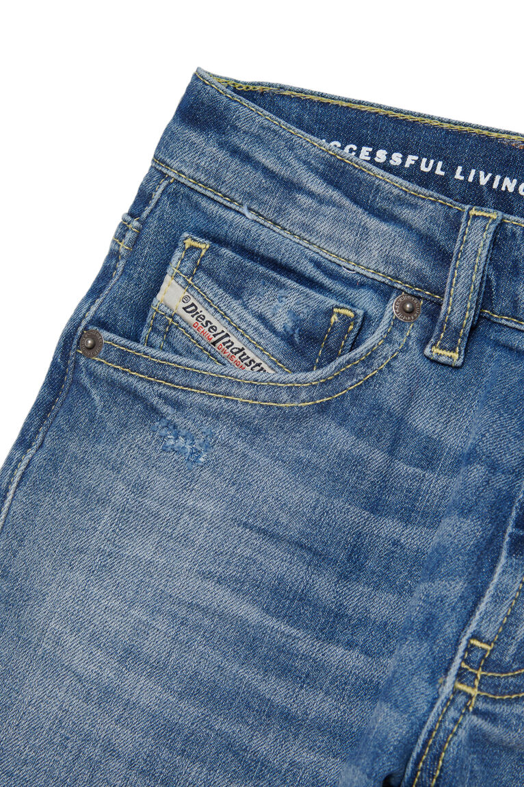 Pantaloni slim con vita regular e gamba straight. Questo versatile modello da bambino si adatta a ogni situazione ed esprime il vero spirito Diesel. Il denim stretch azzurro è rifinito da baffature, impunture a contrasto e abrasioni con rammendi a zig-zag. Il trattamento stonewash rende la mano più morbida.