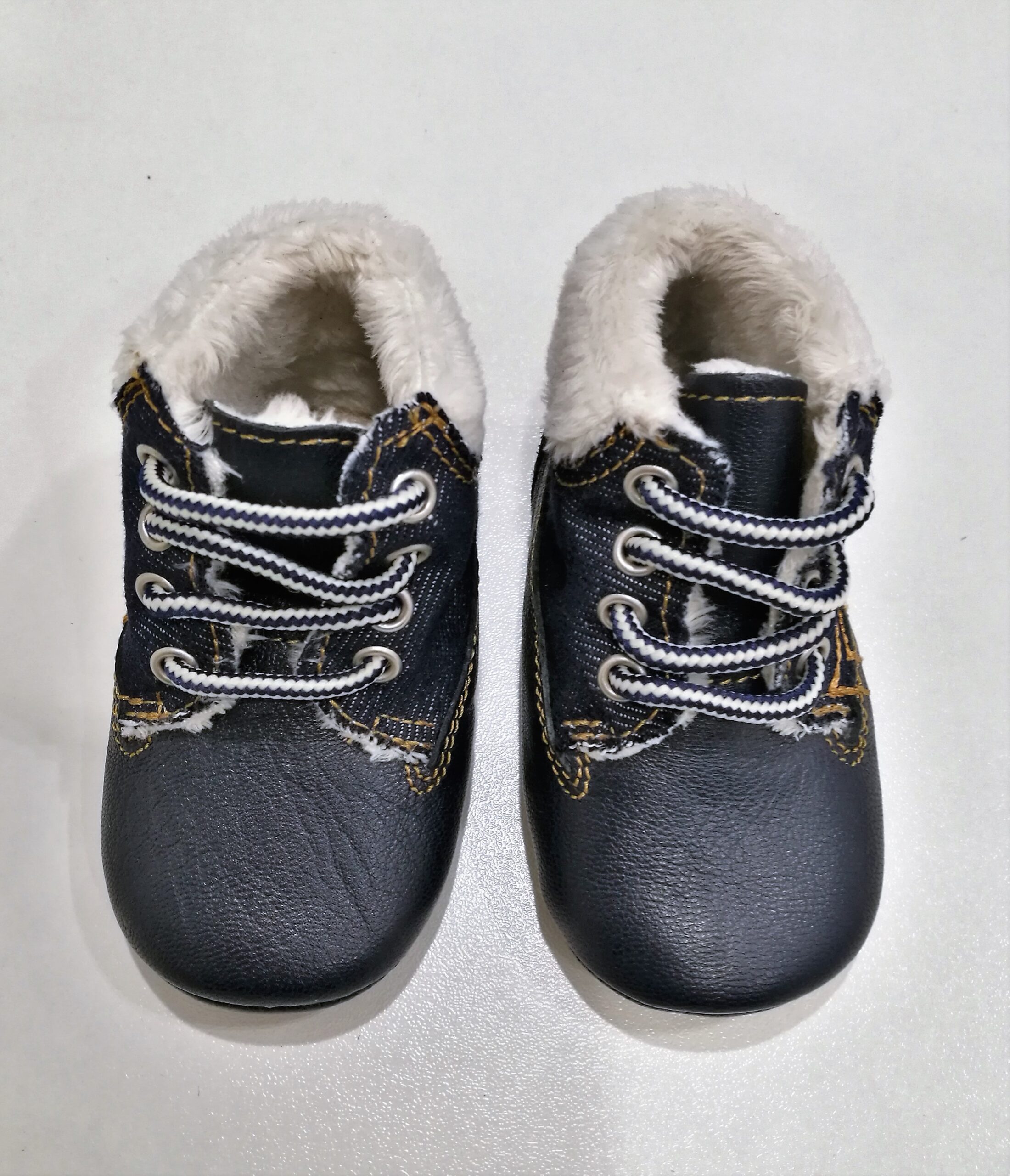 Sneakers alte blu in denim e pelle con logo ricamato in contrasto. Pelliccia all’interno. Allacciata davanti. Logo sulla suola