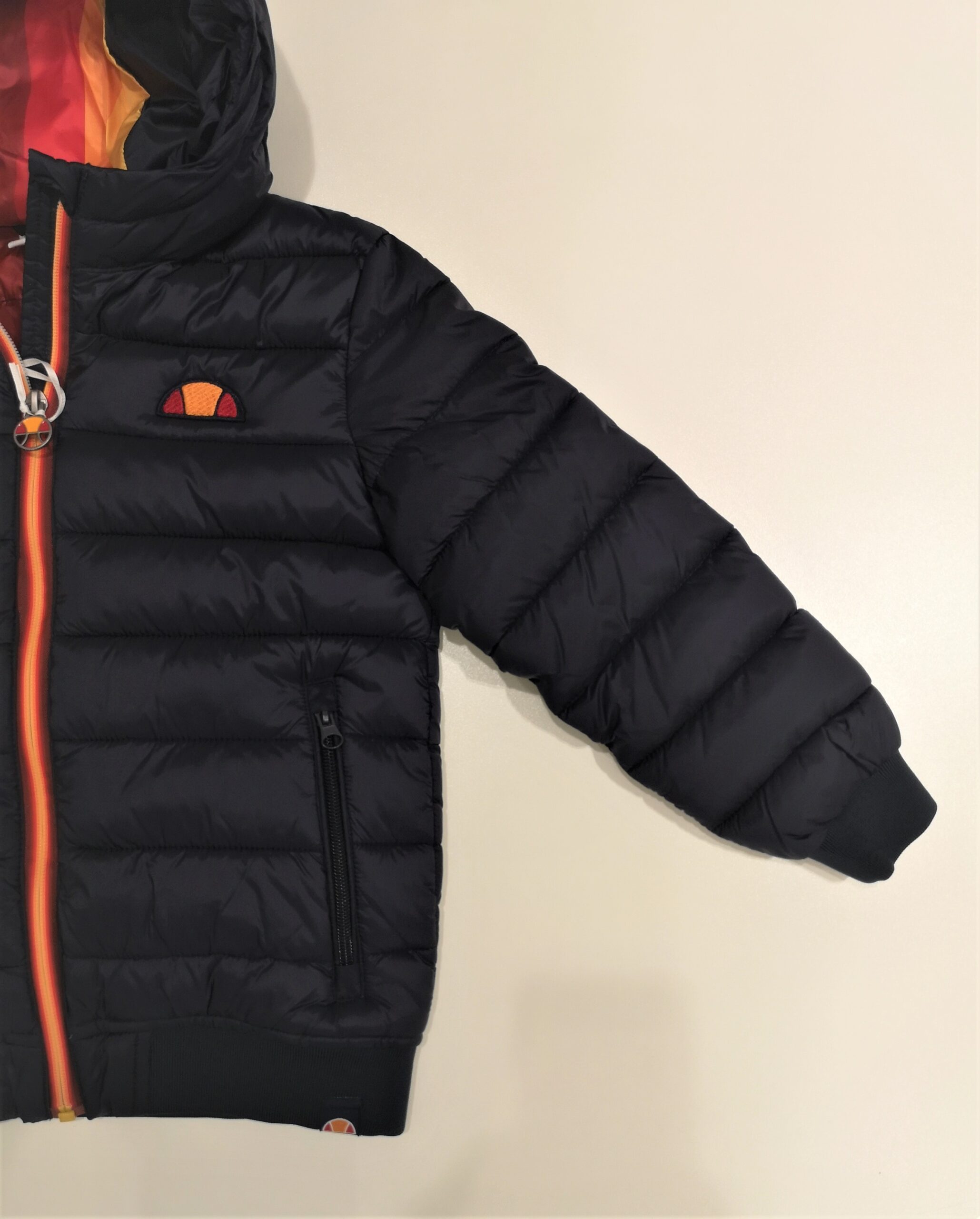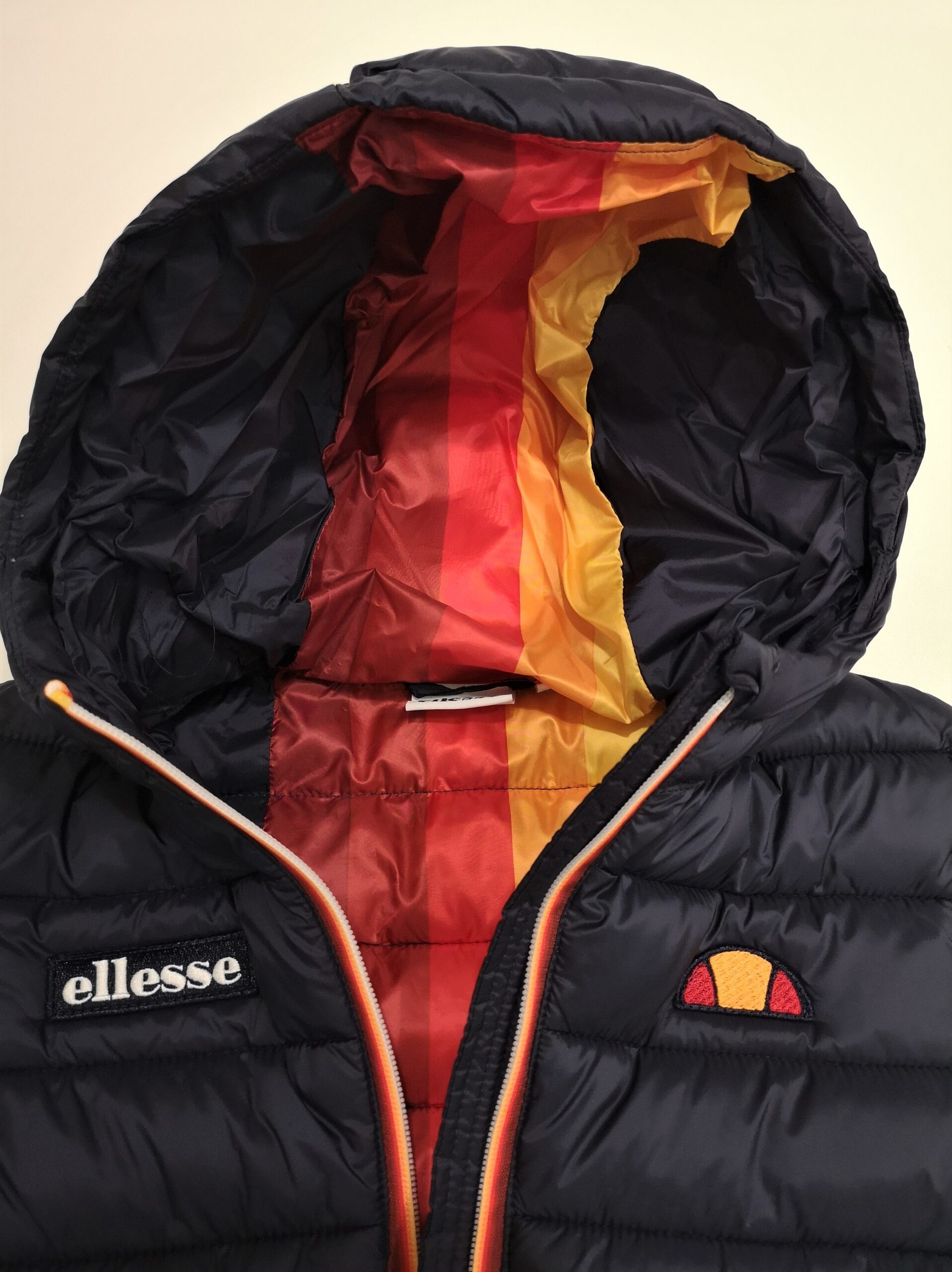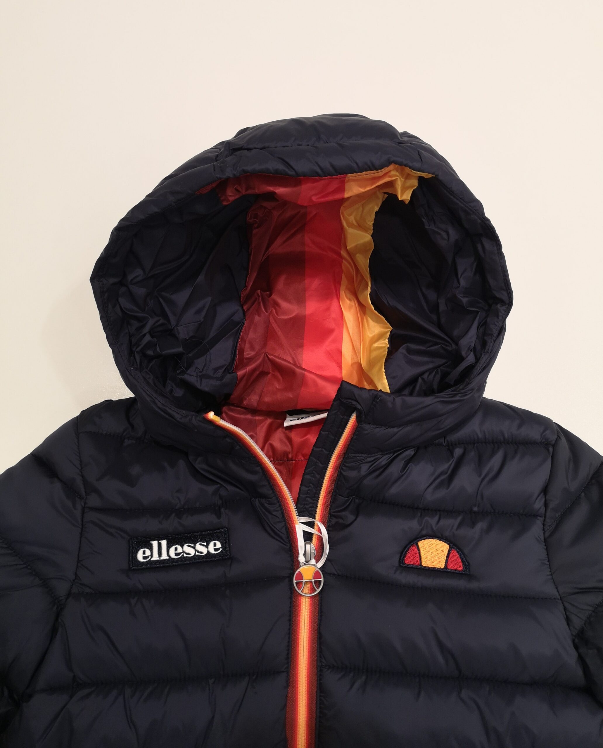 Giubbotto blu con cappuccio con applicazioni logo Ellesse davanti. Zip con fasce colorate e tasche davanti con zip. Interno con colori istituzionali Ellesse