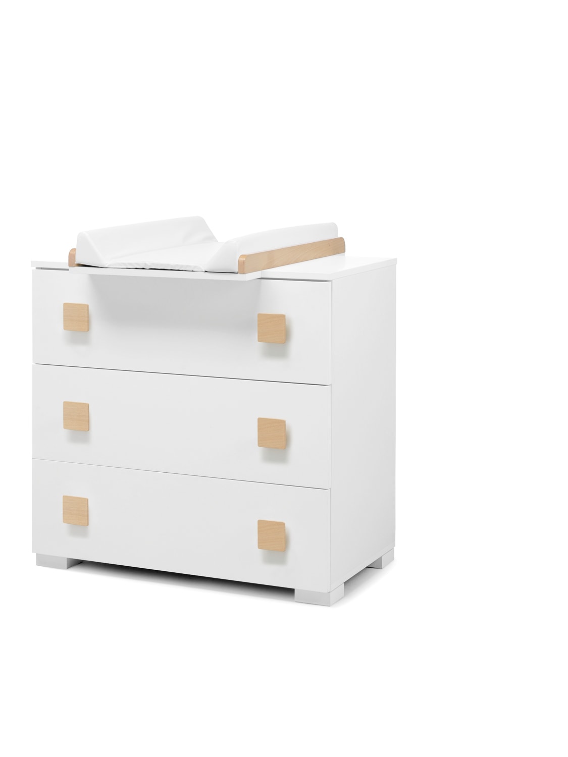 Comò con prolunga e fasciatoio che possono essere montati e fissati sul coperchio a sinistra, al centro o a destra per consentire la maggiore comodità possibile ai genitori nella fase di cambio dei piccoli. Cassetti con freno.
