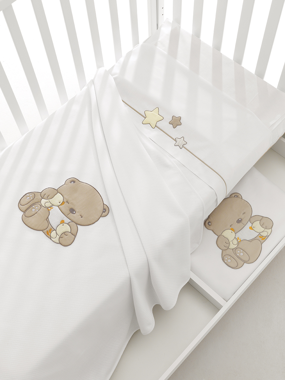 Set Lenzuolino Lettino Erbesi Dado è composto da tre parti: lenzuolino sopra ricamato, lenzuolino sotto con angoli e federa per cuscino.
