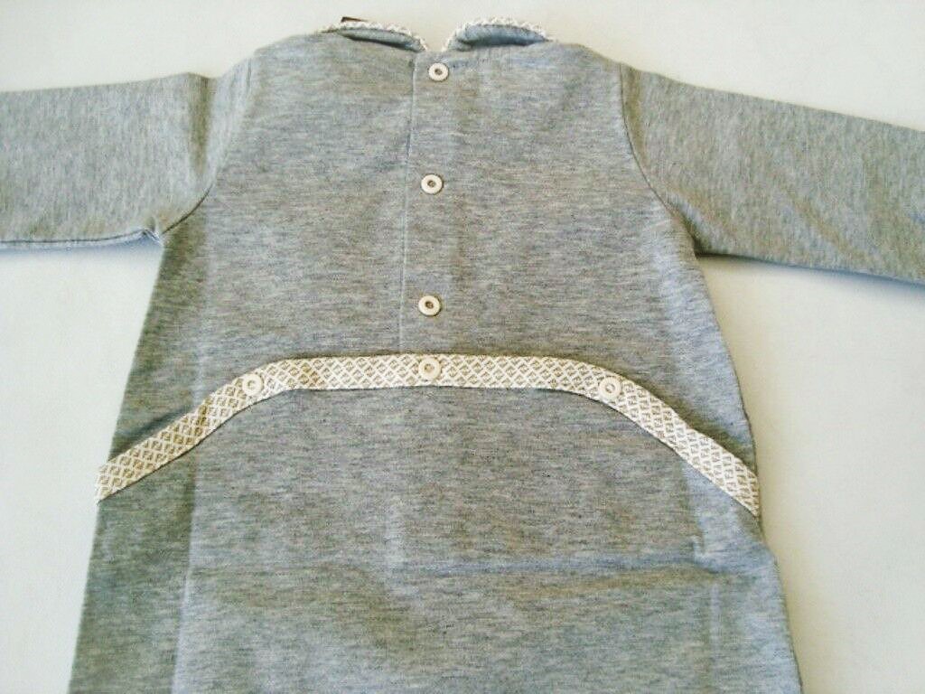 Tutina in cotone grigia con applicazione scoiattolo davanti con dettagli in tessuto logato Fendi. Colletto rotondo con bordo in tessuto logato in beige. Apertura dietro con bottoncini e bordo in tessuto logato