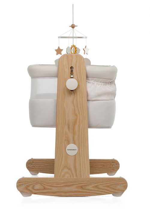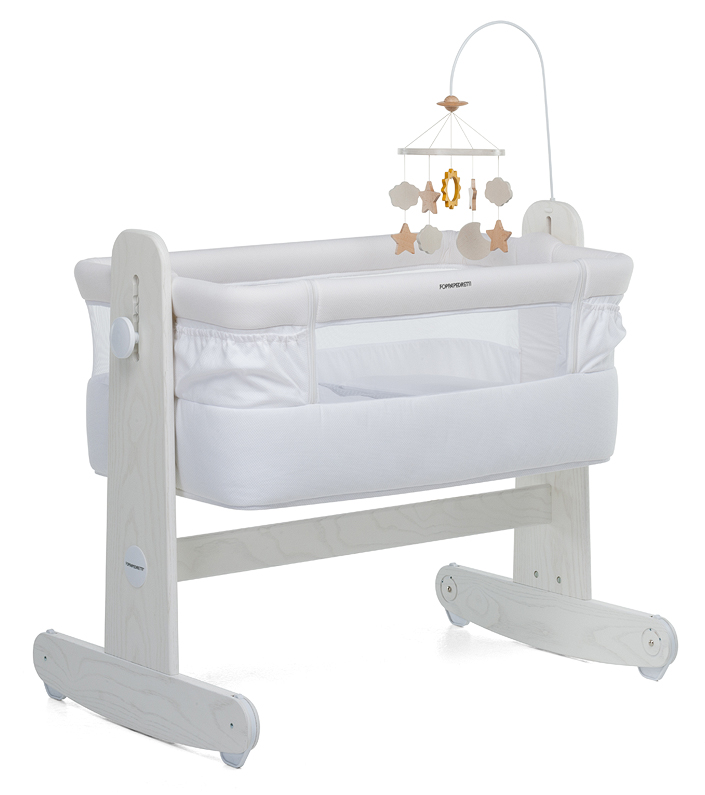 Struttura in legno massiccio di frassino, tessili 100% cotone, regolabile in altezza in 5 posizioni per essere adattata ad ogni tipo di letto. Mamma&Me ha la funzione dondolo integrata e include sia la giostrina in legno sia il materasso.