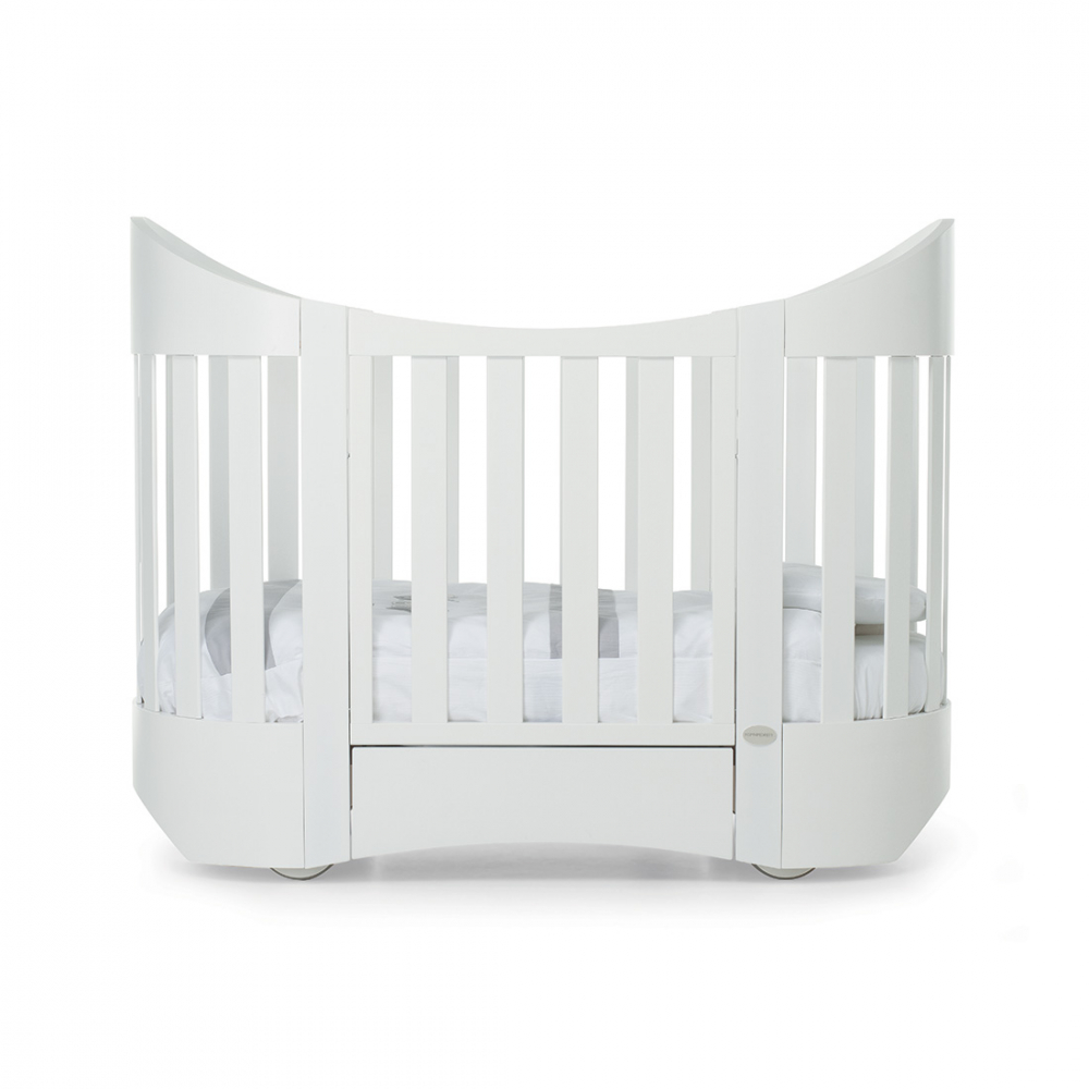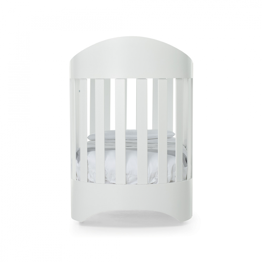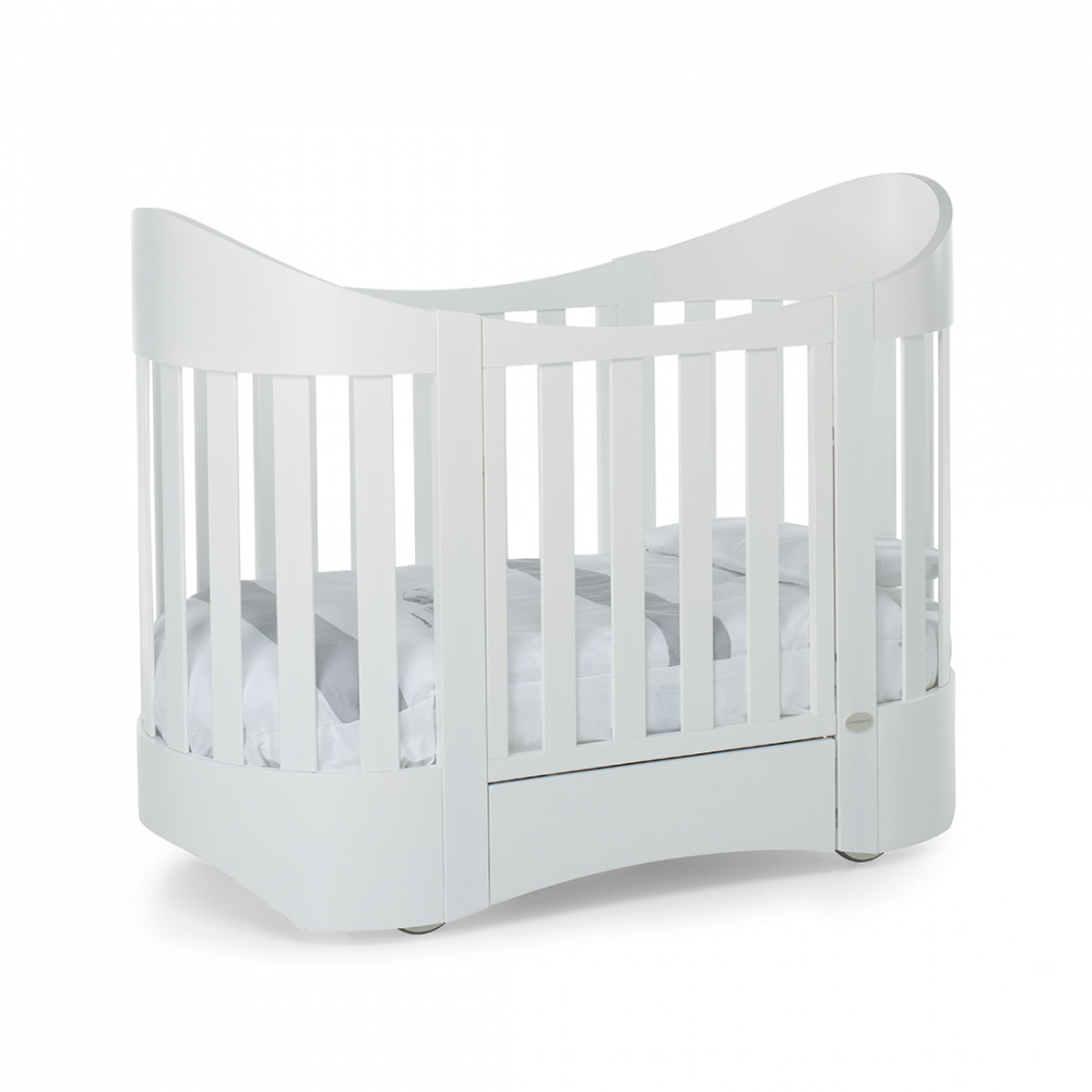 Il lettino ovale in legno Armony di Foppapedretti ha una sponda regolabile a due altezze, per facilitare il riordino del lettino.