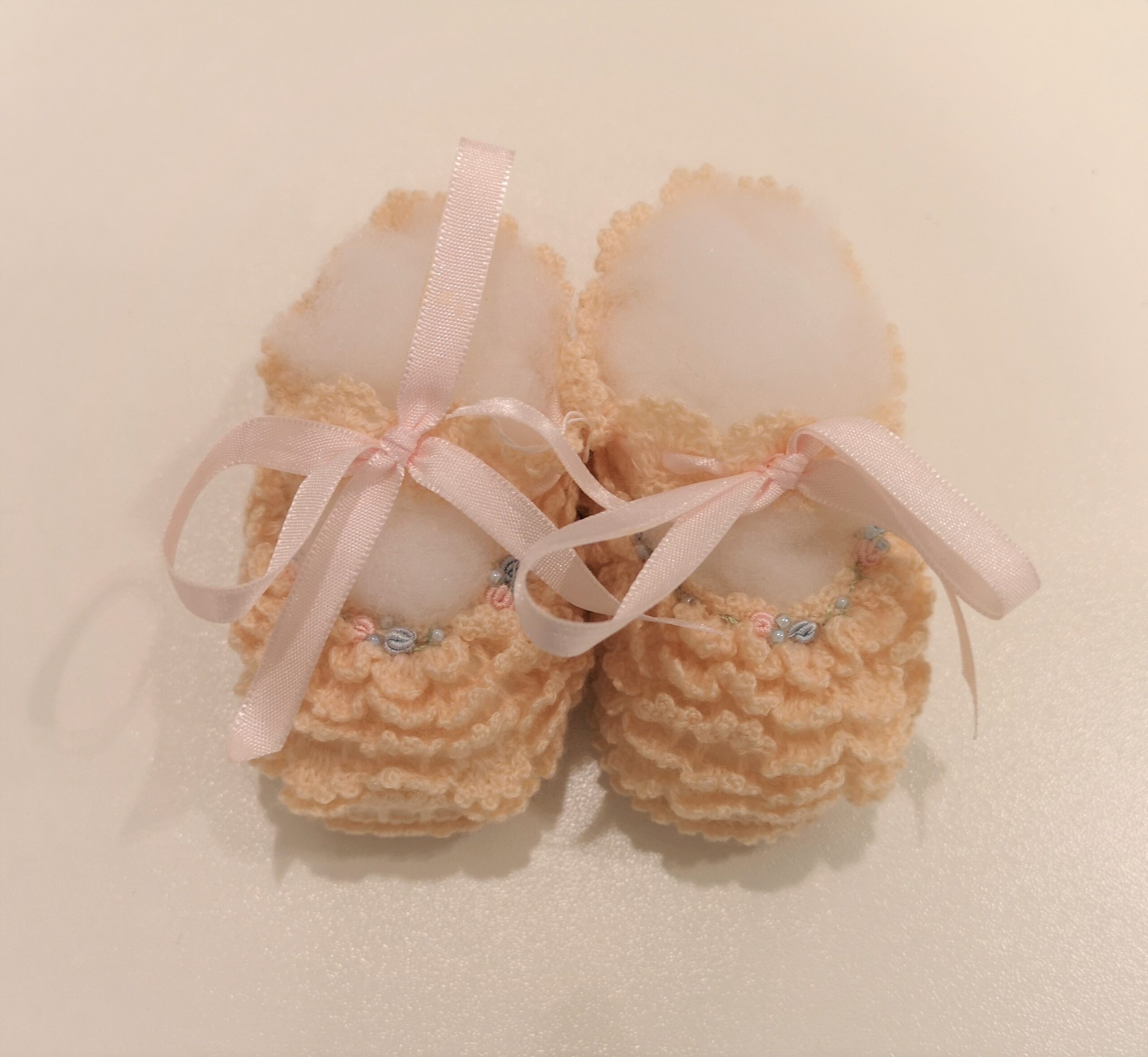 Scarpette panna modello bambolina in lana lavorata con fiorellini rosa e azzurro ricamati e nastrino di raso rosa