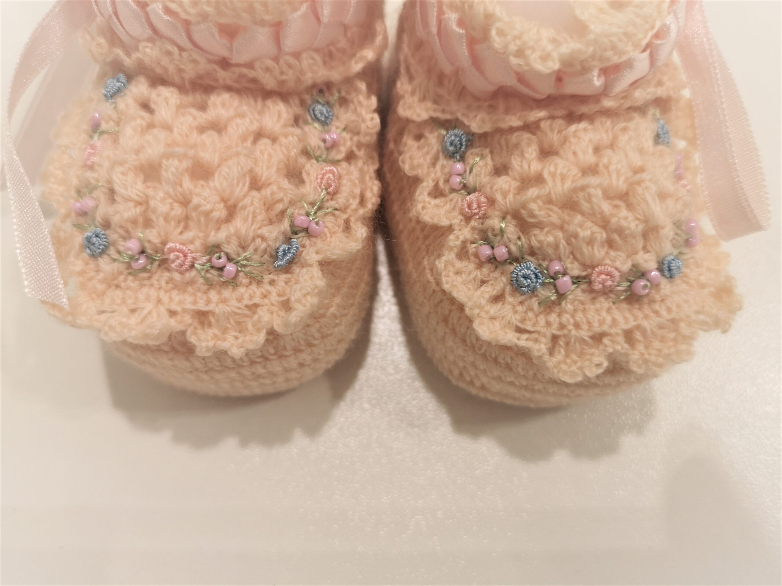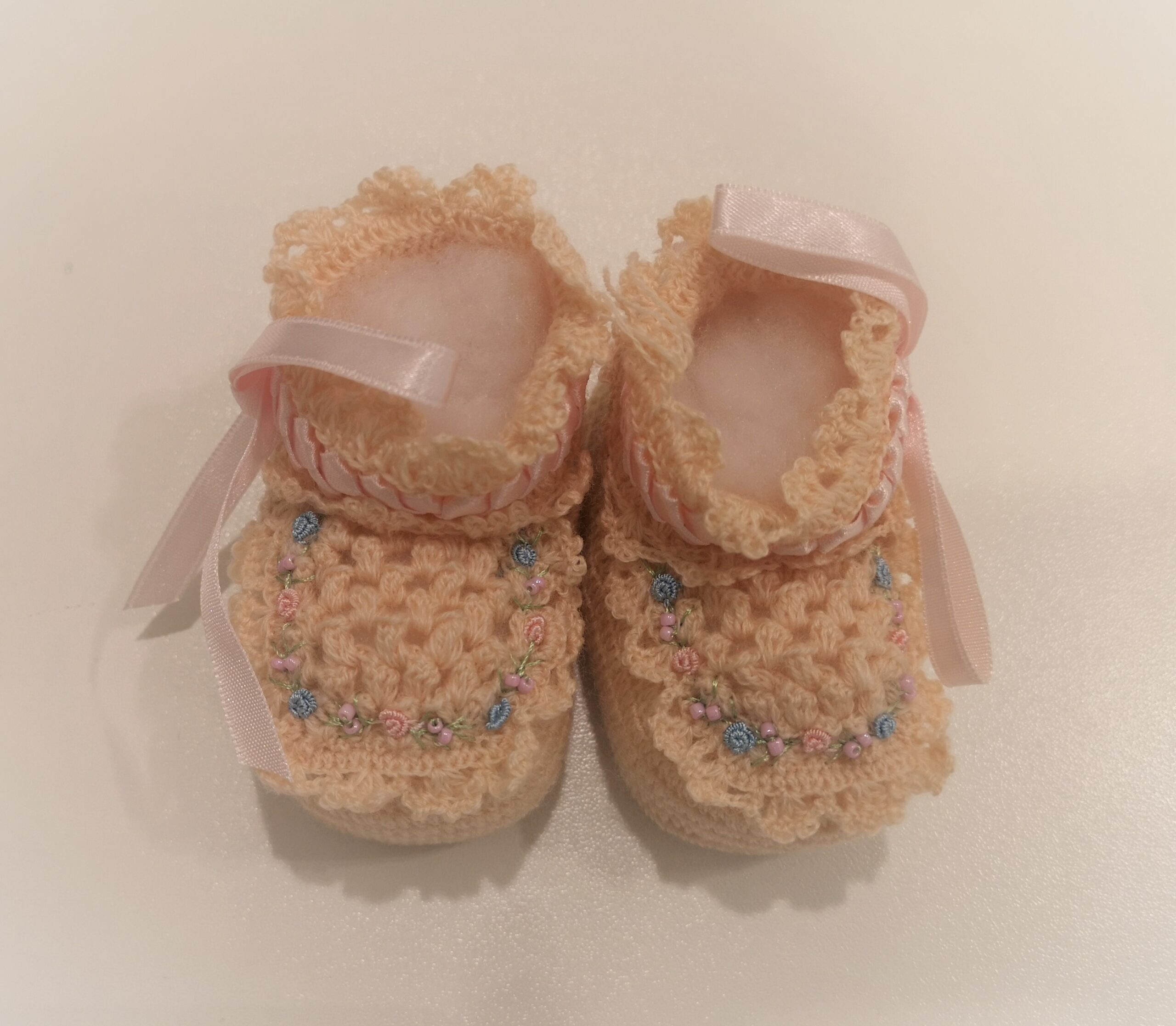 Scarpette panna in lana lavorata con fiorellini rosa e azzurro ricamati e nastrino di raso rosa
