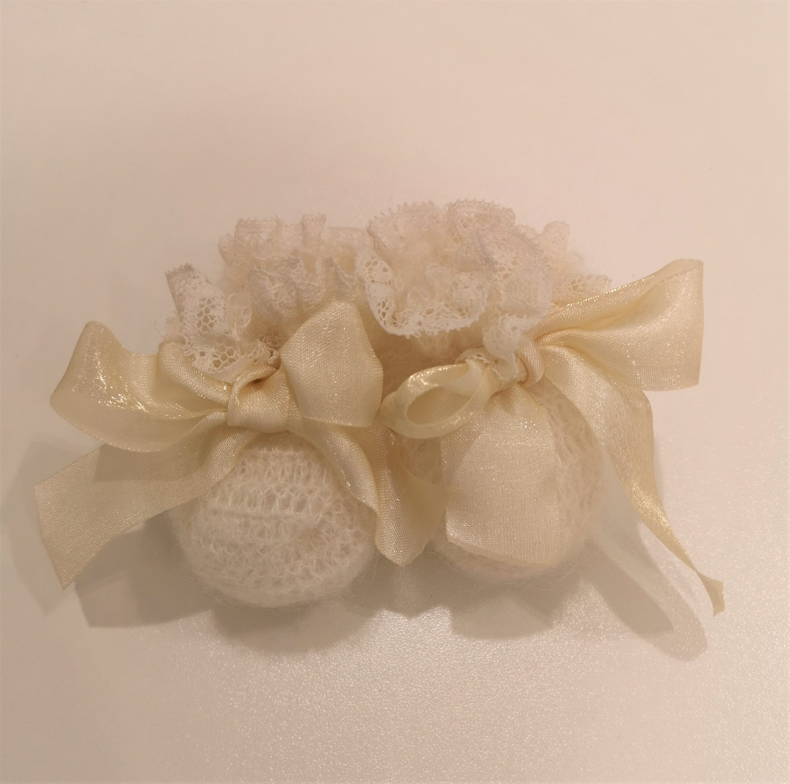 Scarpette in lana panna con fiocco di organza e bordo con pizzo