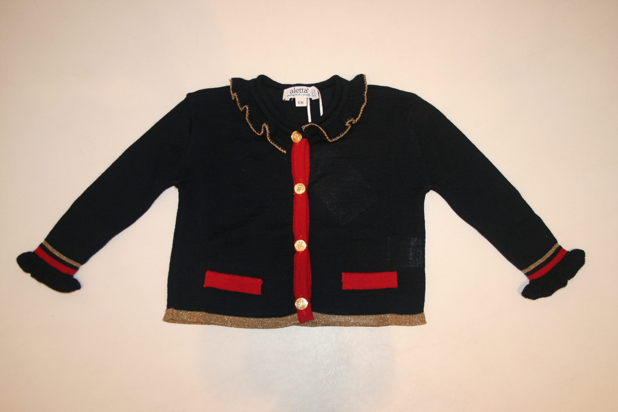 Giacca in maglia colore blu con riporti in rosso e filo dorato. Bottoncini dorati.