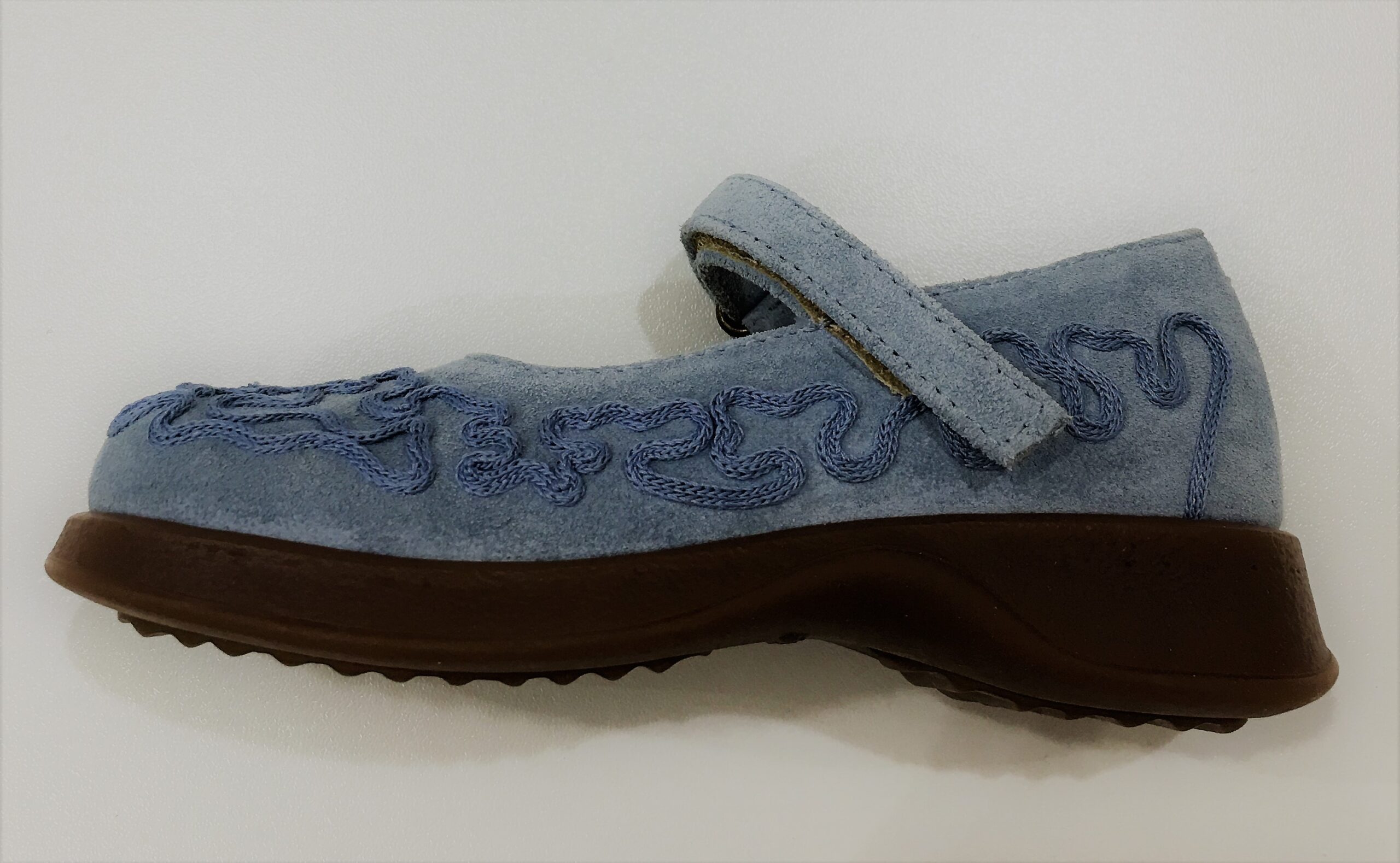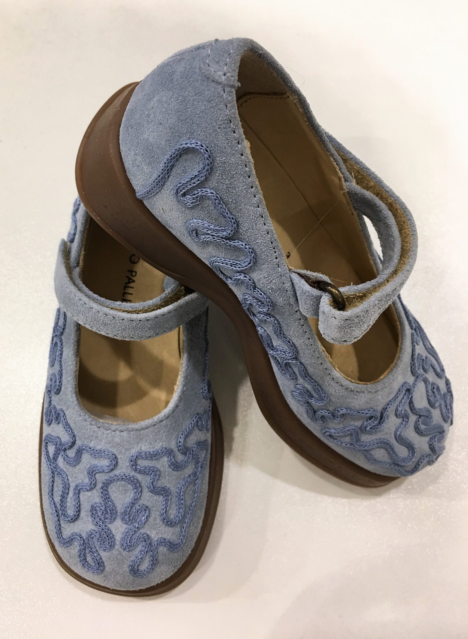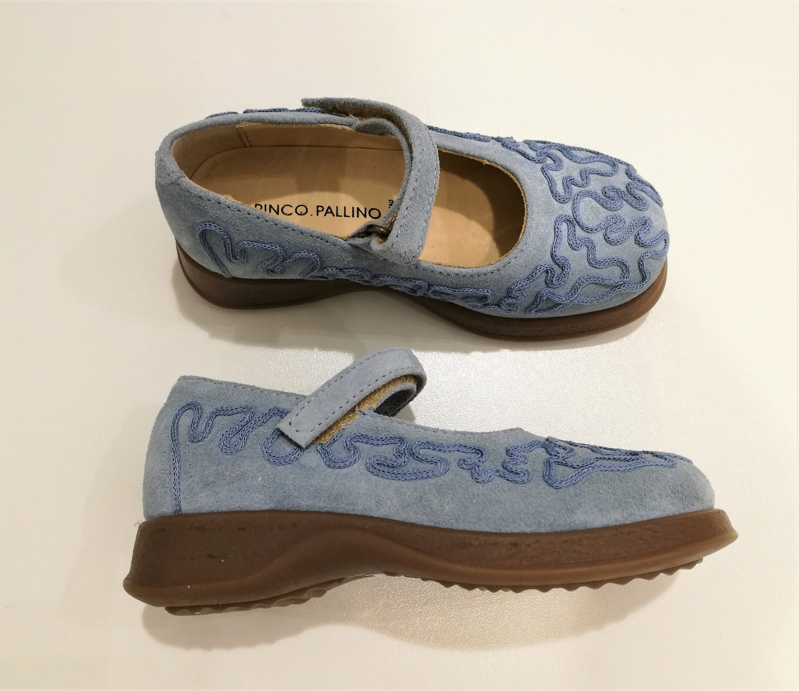 Ballerina I PINCO PALLINO in suede col. cielo con dettaglio ricami in tinta. Modello punta tonda con suola in gomma. Chiusura con velcro.