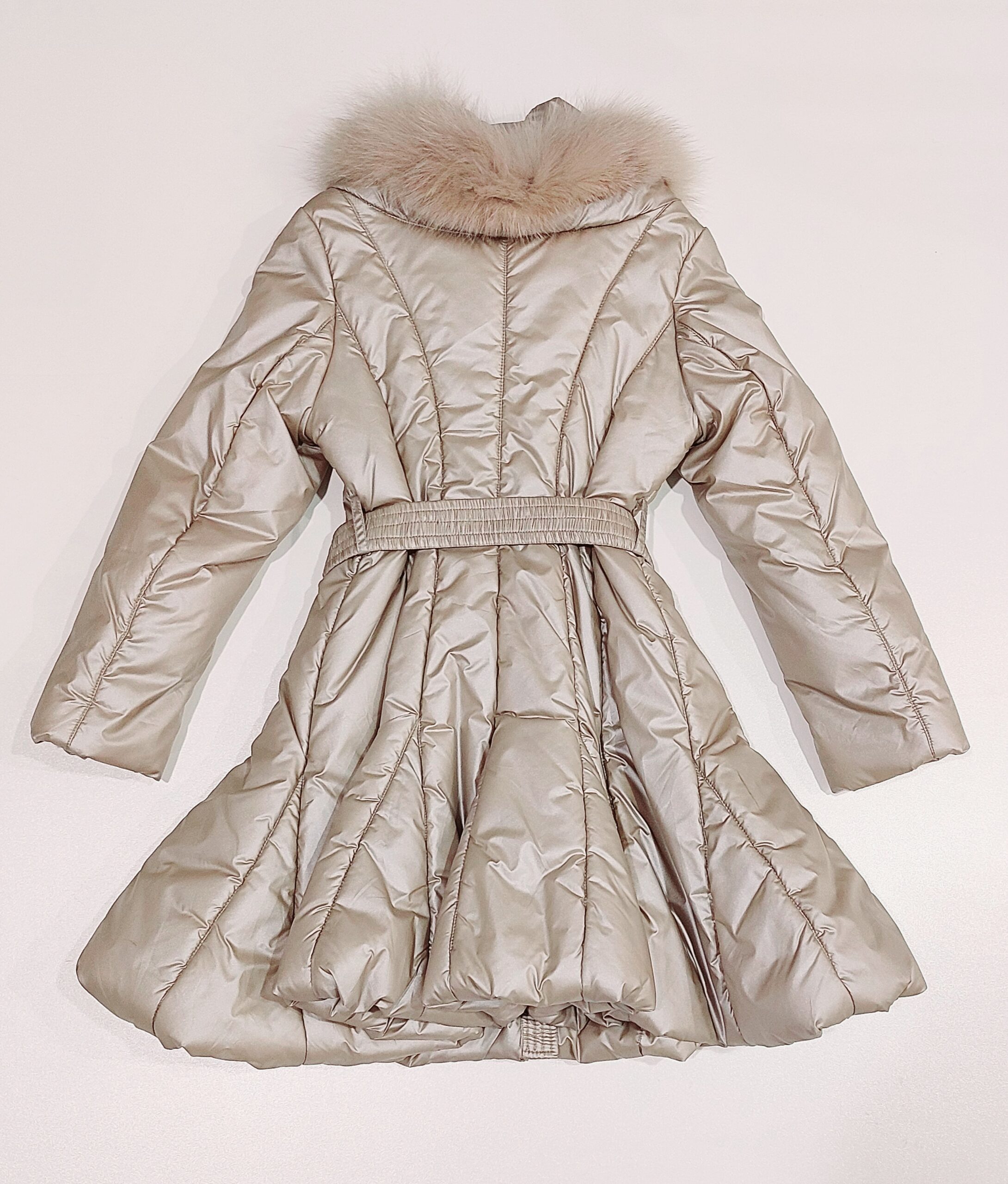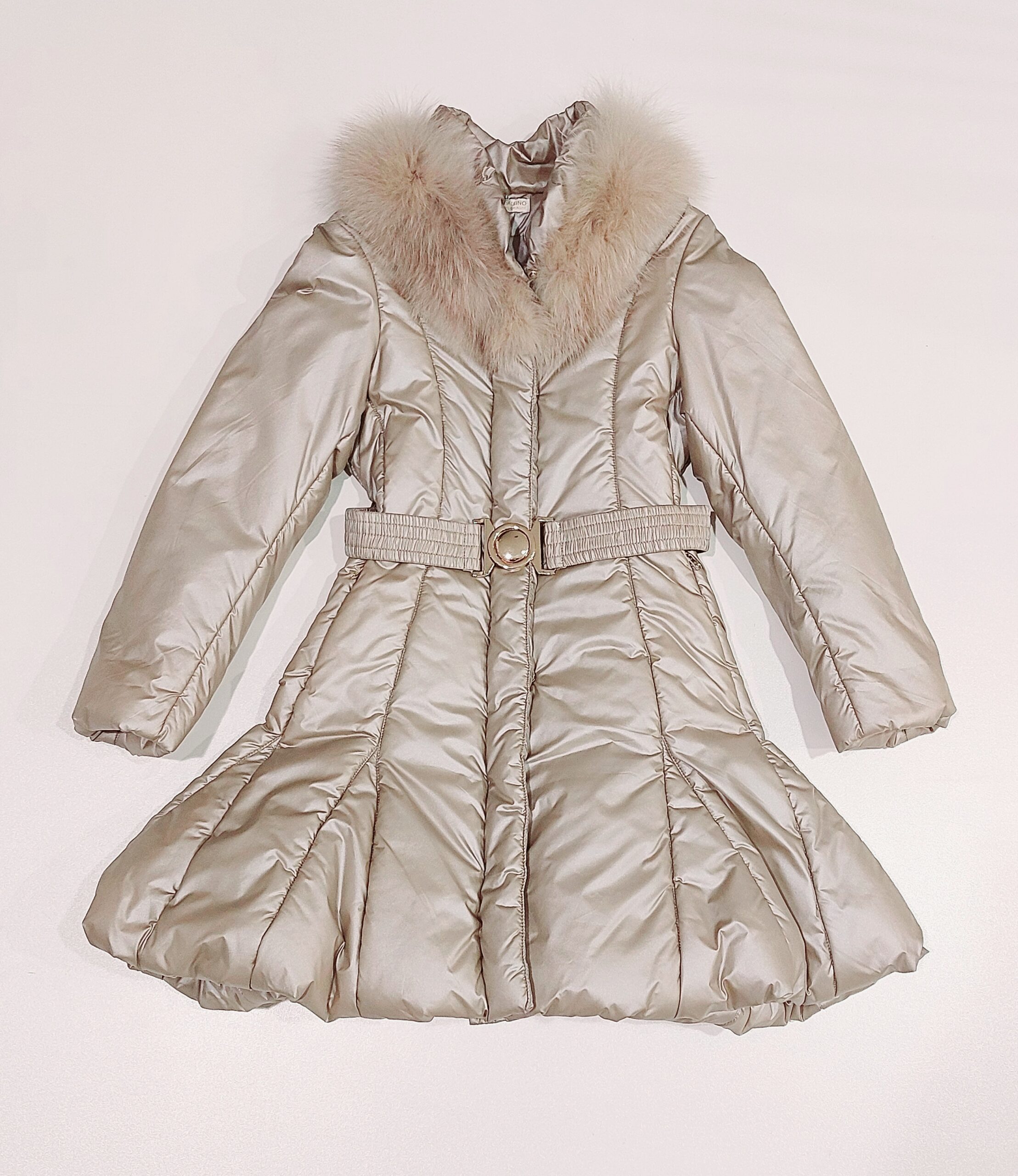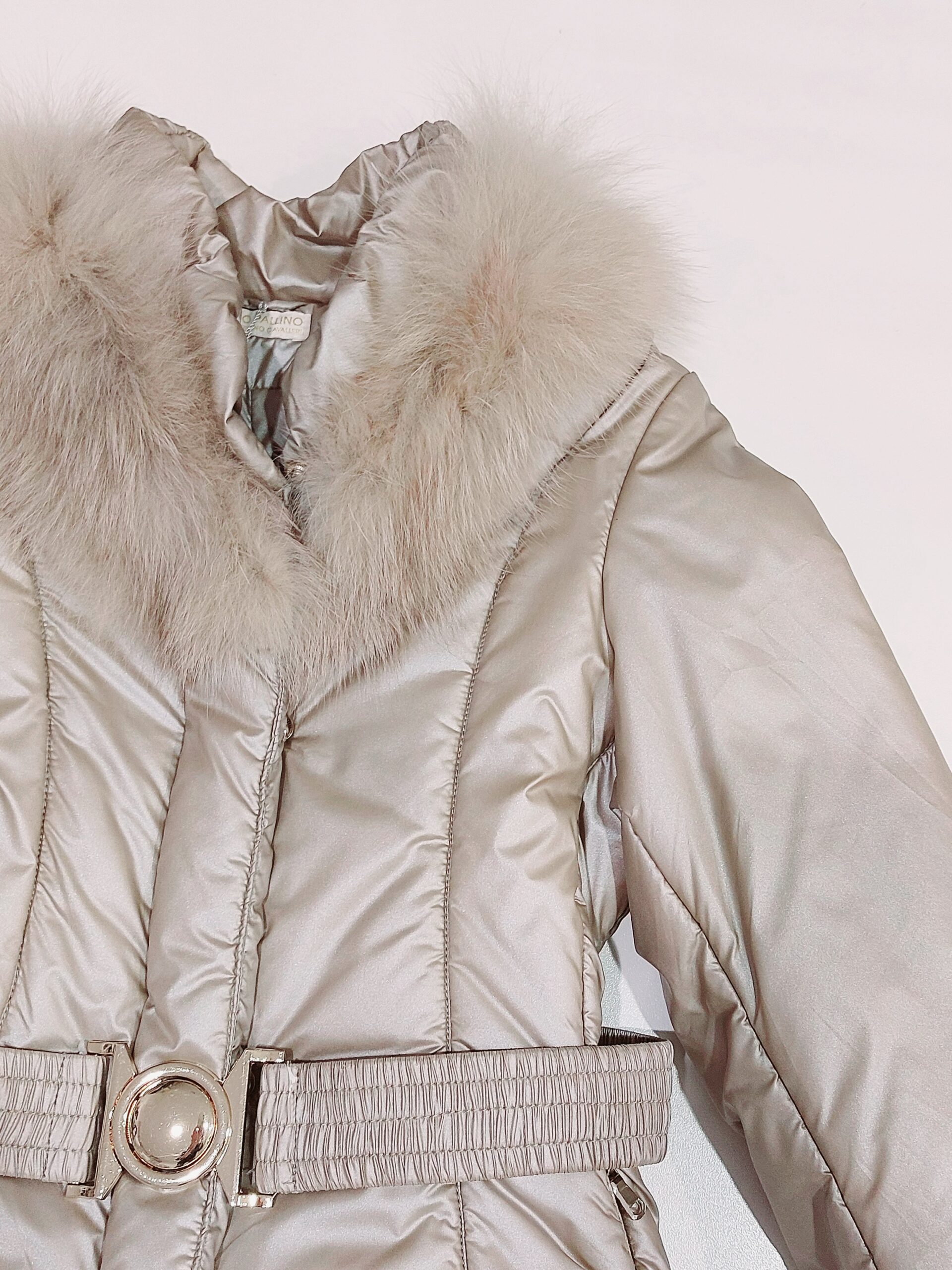 Giubbotto lungo beige lucido con collo in pelliccia. Cintura elastica con fibbia.