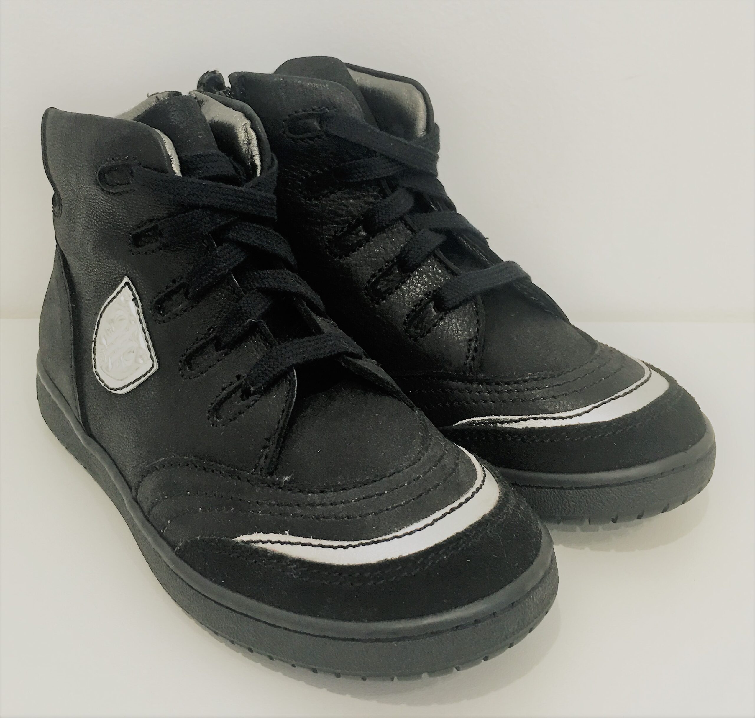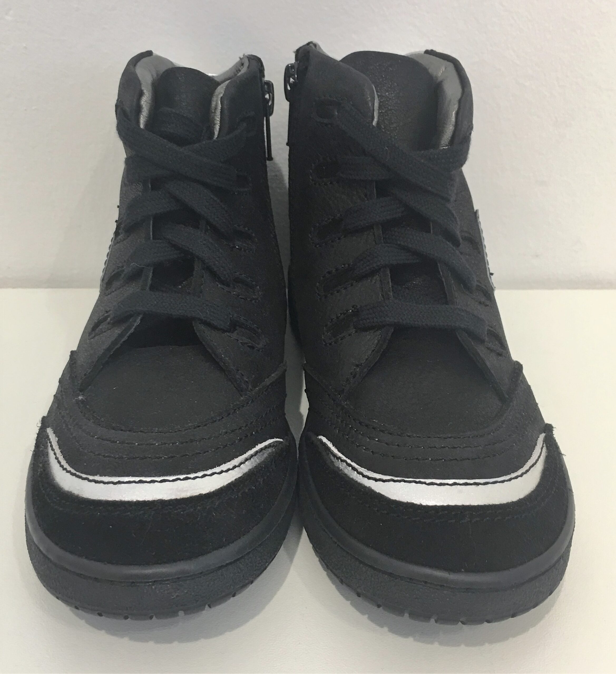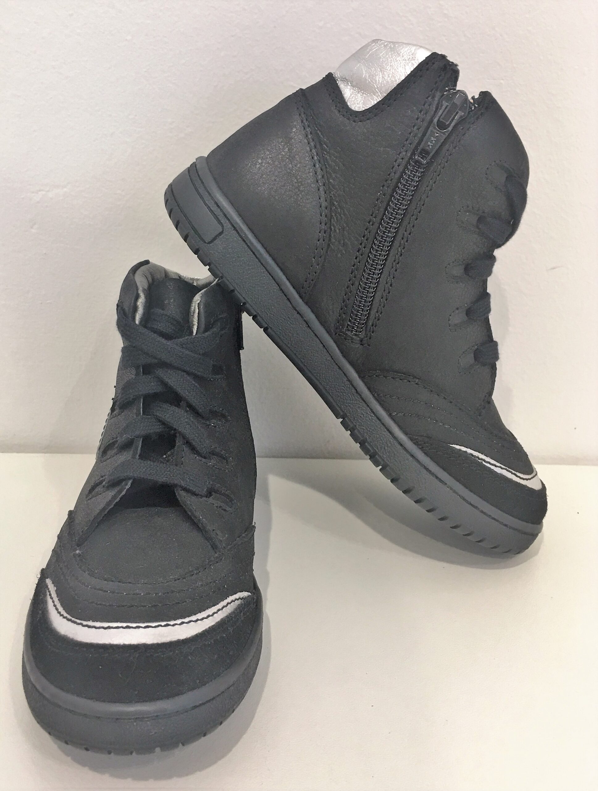 I PINCO PALLINO Sneakers stivaletto in colore nero con inserti in argento. Chiusura con zip laterale e lacci. Suola in gomma nera.