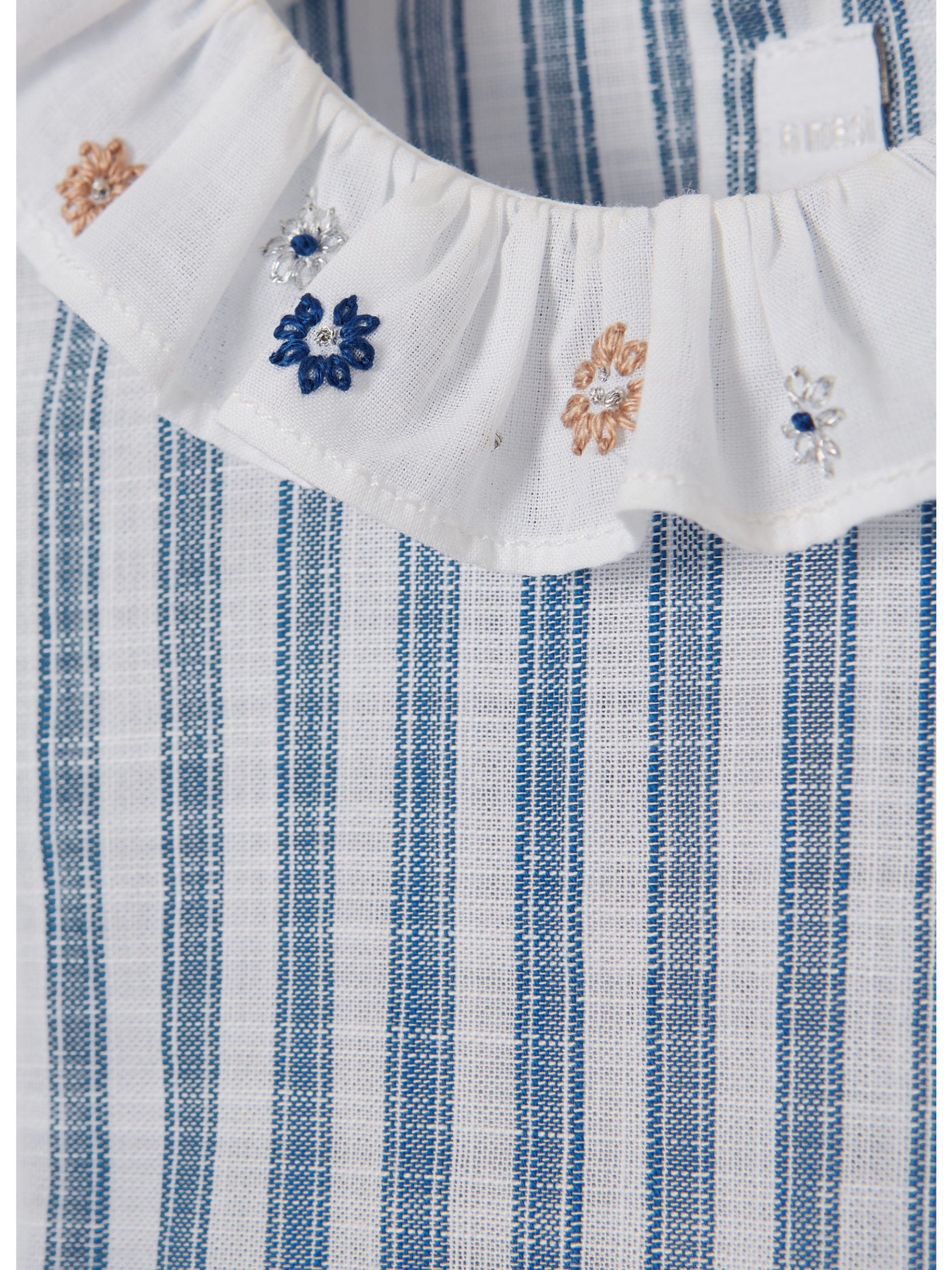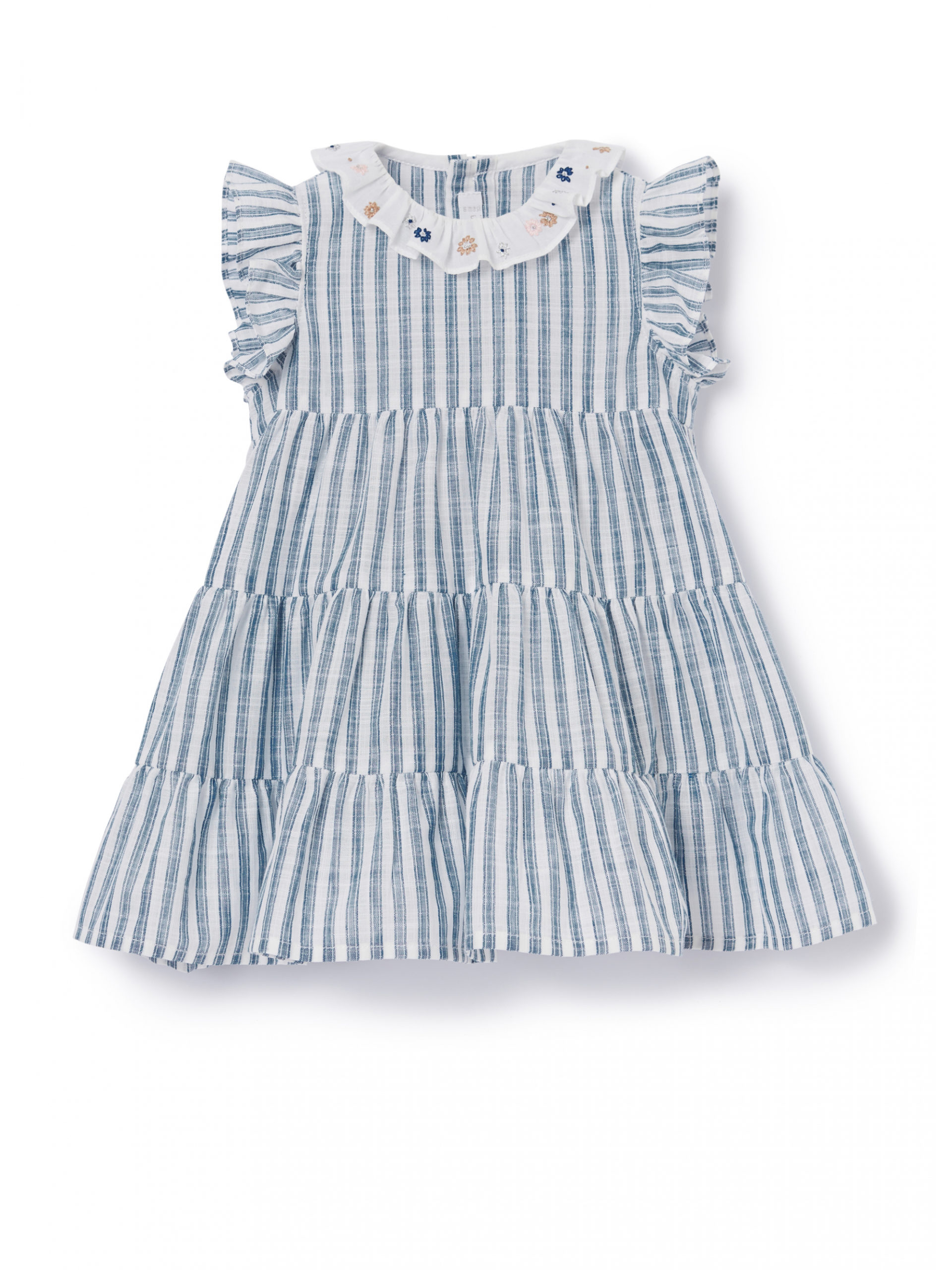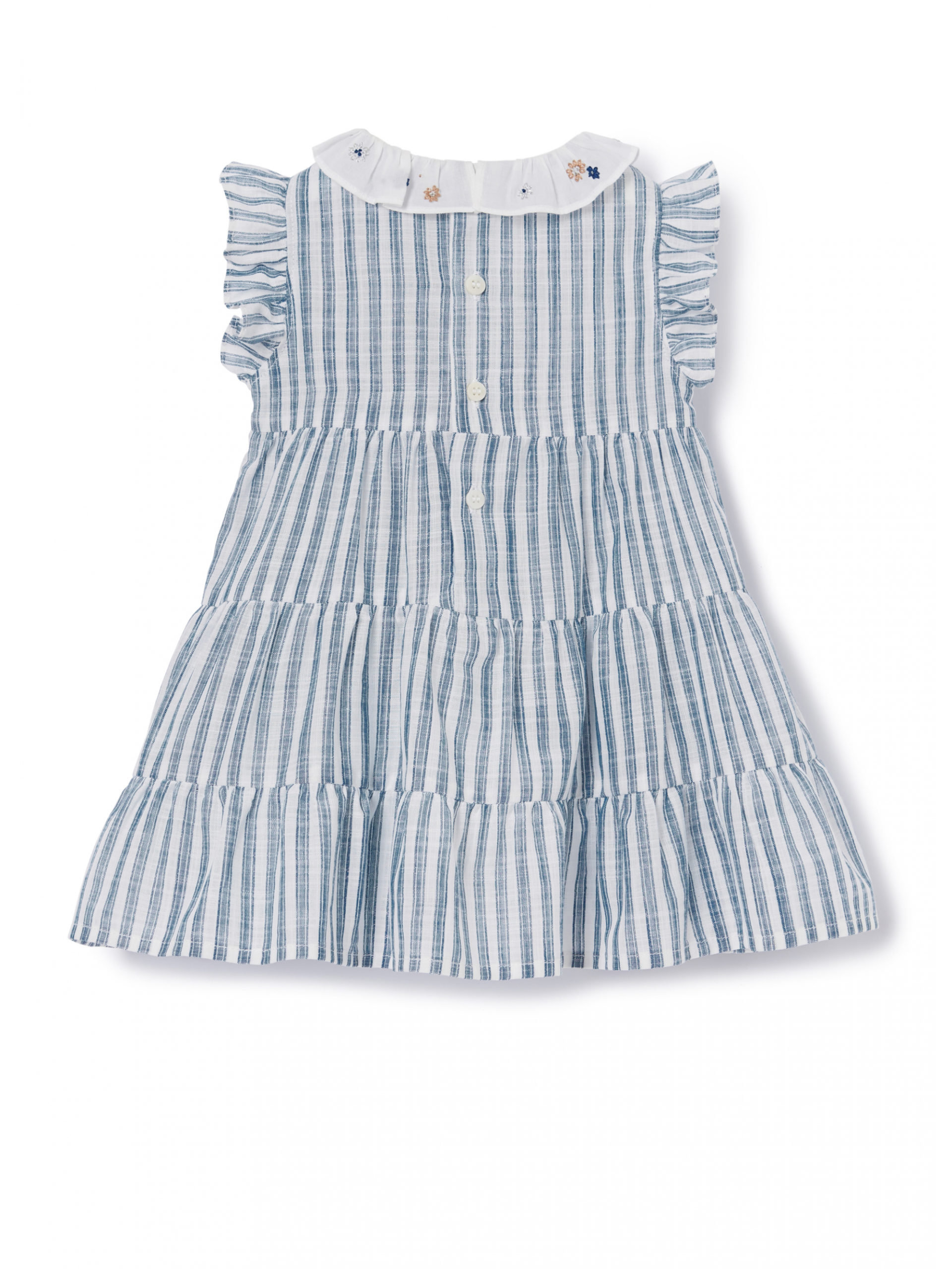 abito smanicato con alette in cotone fiammato a righe bianche e avio con balze, colletto pierrot in voile bianco con ricami a contrasto eseguiti totalmente a mano
